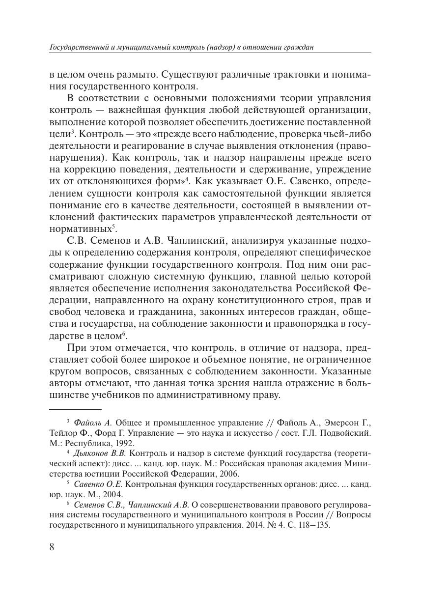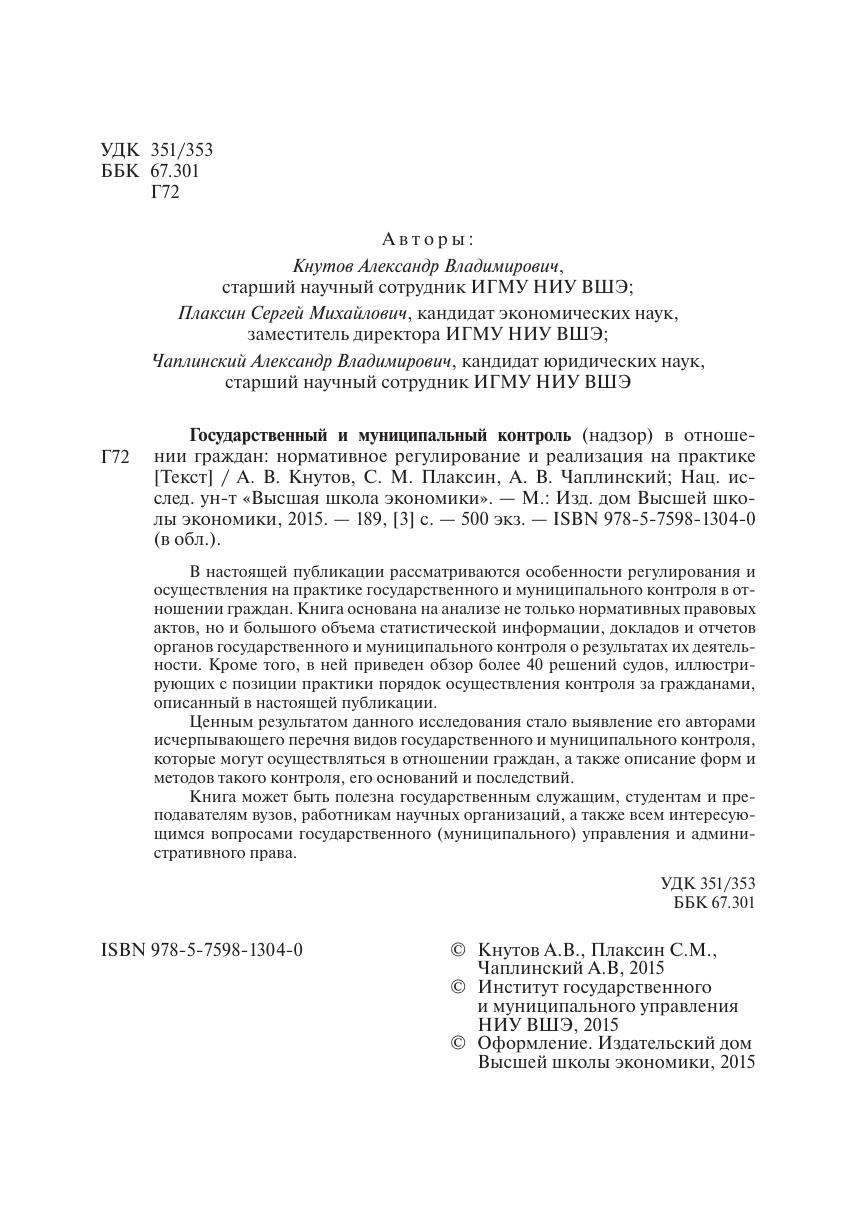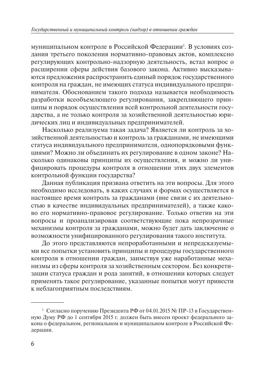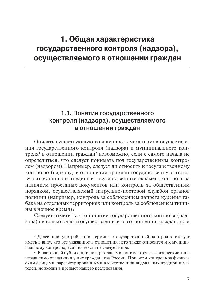 В настоящей публикации рассматриваются особенности регулирования и осуществления на практике государственного и муниципального контроля в отношении граждан. Книга основана на анализе не только нормативных правовых актов, но и большого объема статистической информации, докладов и отчетов органов государственного и муниципального контроля о результатах их деятельности. Кроме того, в ней приведен обзор более 40 решений судов, иллюстрирующих с позиции практики порядок осуществления контроля за гражданами, описанный в настоящей публикации. Ценным результатом данного исследования стало выявление его авторами исчерпывающего перечня видов государственного и муниципального контроля, которые могут осуществляться в отношении граждан, а также описание форм и методов такого контроля, его оснований и последствий. Книга может быть полезна государственным служащим, студентам и преподавателям вузов, работникам научных организаций, а также всем интересующимся вопросами государственного (муниципального) управления и административного права.