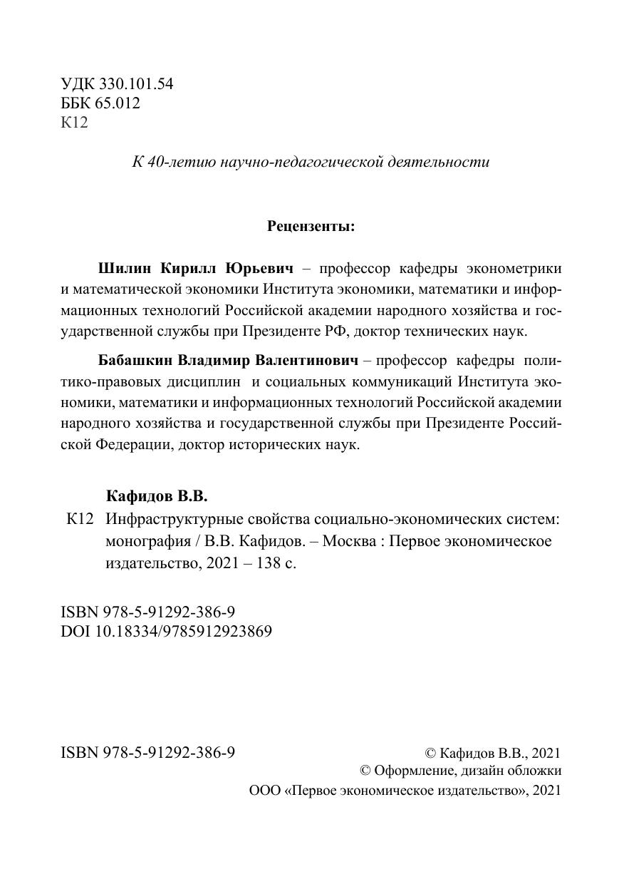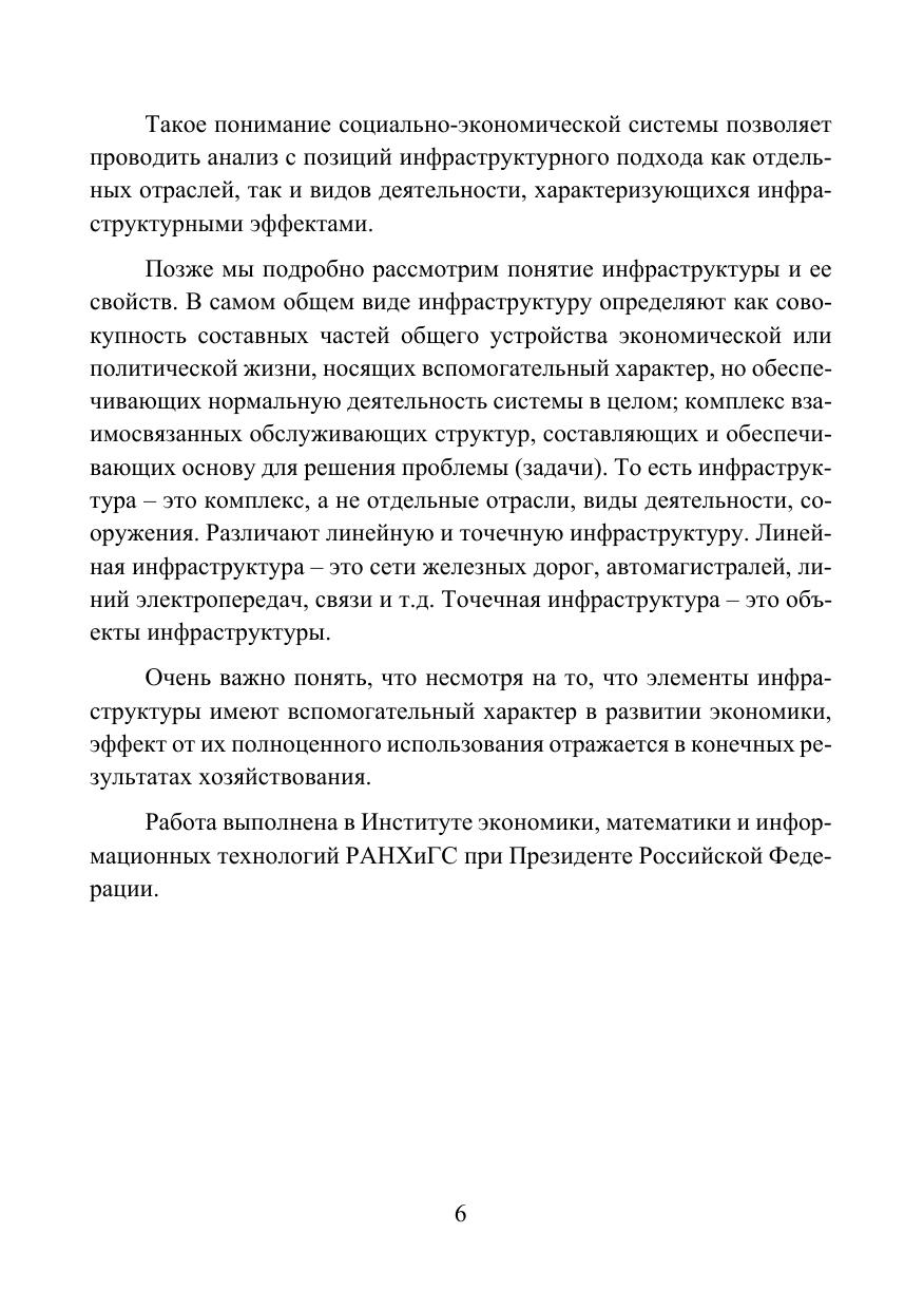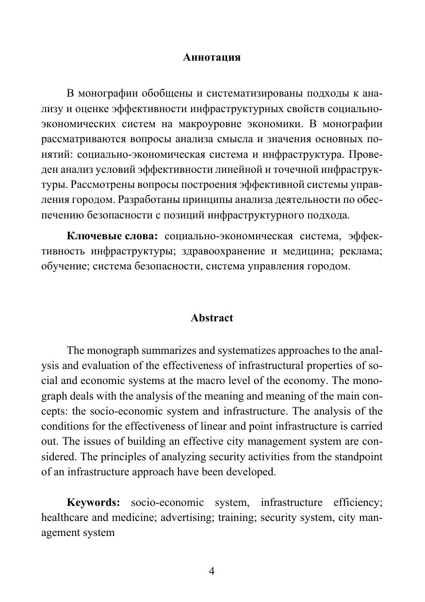 В монографии обобщены и систематизированы подходы к анализу и оценке эффективности инфраструктурных свойств социально-экономических систем на макроуровне экономики. В монографии рассматриваются вопросы анализа смысла и значения основных понятий: социально-экономическая система и инфраструктура. Проведен анализ условий эффективности линейной и точечной инфраструктуры. Рассмотрены вопросы построения эффективной системы управления городом. Разработаны принципы анализа деятельности по обеспечению безопасности с позиций инфраструктурного подхода.