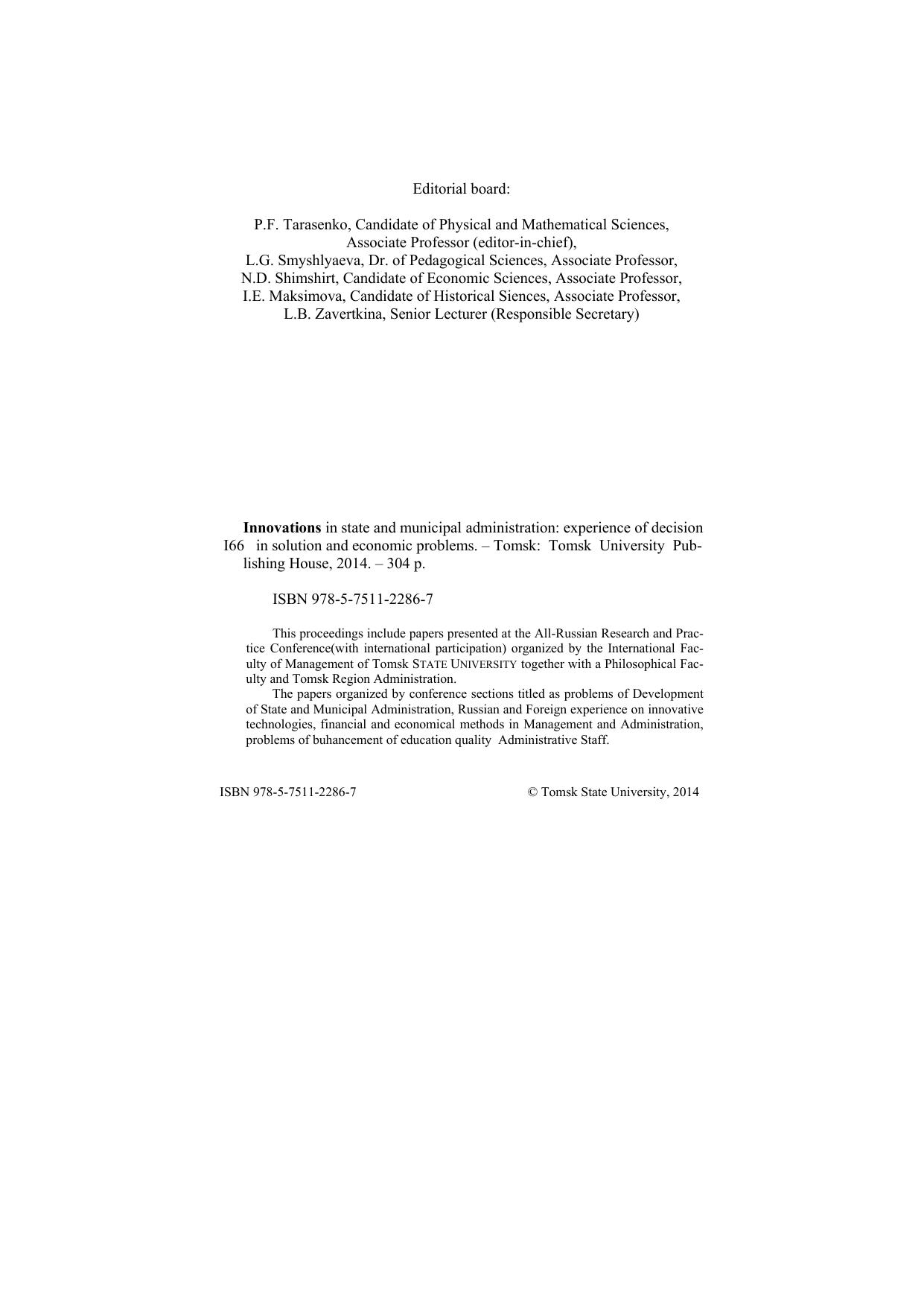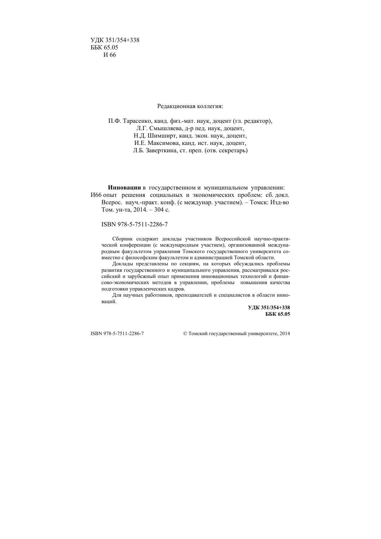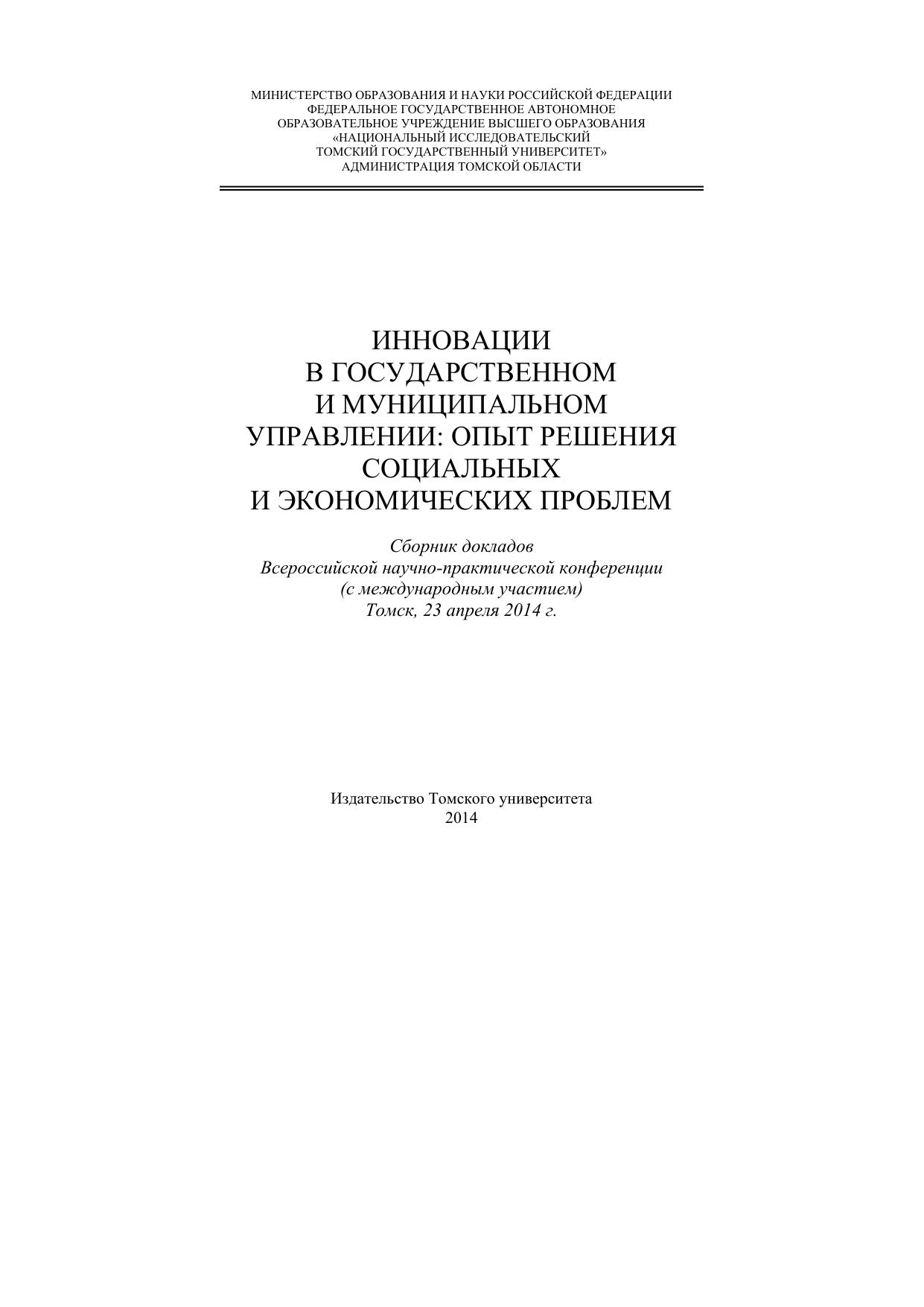 Сборник содержит доклады участников Всероссийской научно-практической конференции (с международным участием), организованной международным факультетом управления Томского государственного университета совместно с философским факультетом и администрацией Томской области. Доклады представлены по секциям, на которых обсуждались проблемы развития государственного и муниципального управления, рассматривался российский и зарубежный опыт применения инновационных технологий и финансово-экономических методов в управлении, проблемы повышения качества подготовки управленческих кадров. Для научных работников, преподавателей и специалистов в области инноваций.