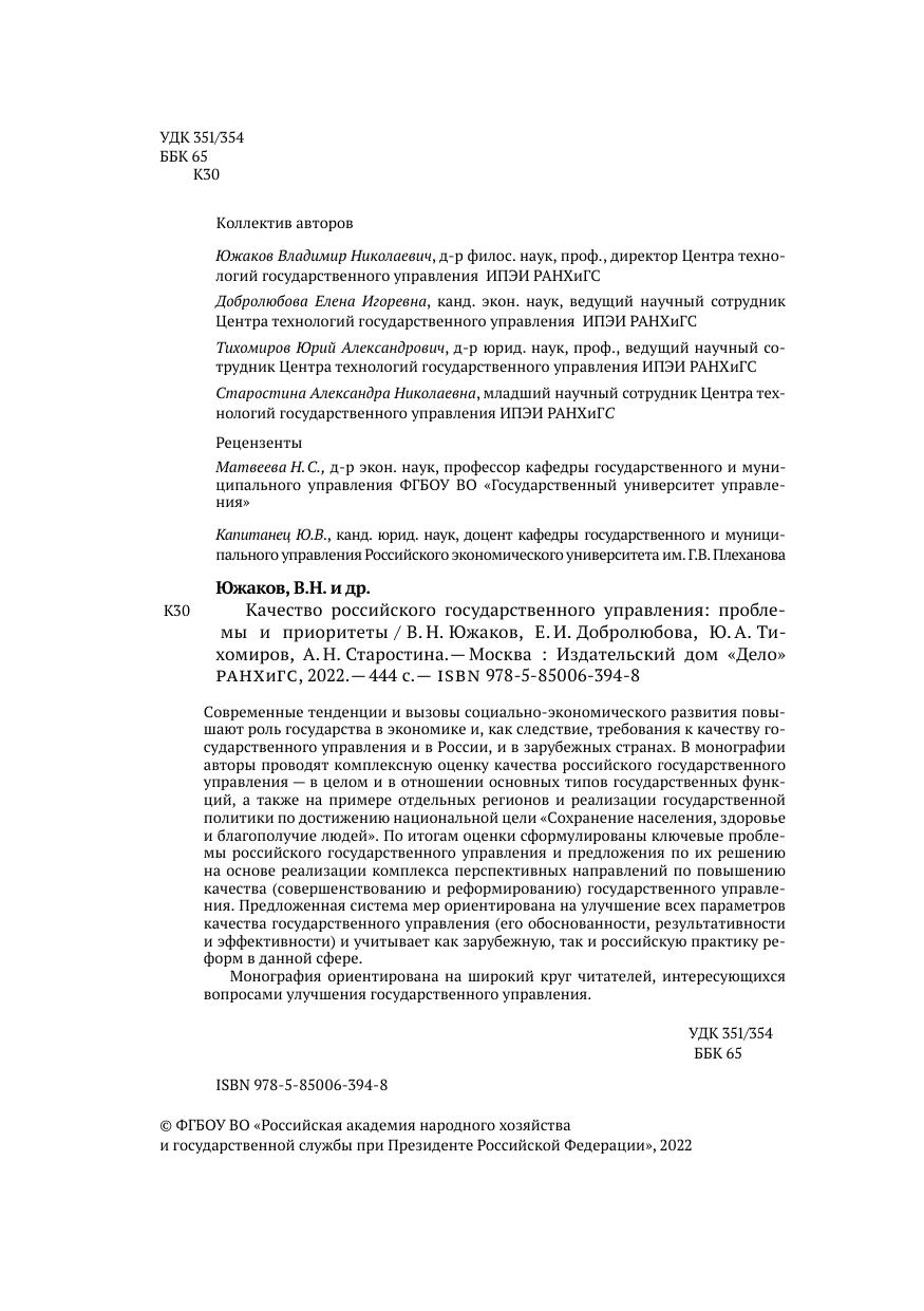 Современные тенденции и вызовы социально-экономического развития повышают роль государства в экономике и, как следствие, требования к качеству государственного управления и в России, и в зарубежных странах. В монографии авторы проводят комплексную оценку качества российского государственного управления — в целом и в отношении основных типов государственных функций, а также на примере отдельных регионов и реализации государственной политики по достижению национальной цели «Сохранение населения, здоровье и благополучие людей». По итогам оценки сформулированы ключевые проблемы российского государственного управления и предложения по их решению на основе реализации комплекса перспективных направлений по повышению качества (совершенствованию и реформированию) государственного управления. Предложенная система мер ориентирована на улучшение всех параметров качества государственного управления (его обоснованности, результативности и эффективности) и учитывает как зарубежную, так и российскую практику реформ в данной сфере.