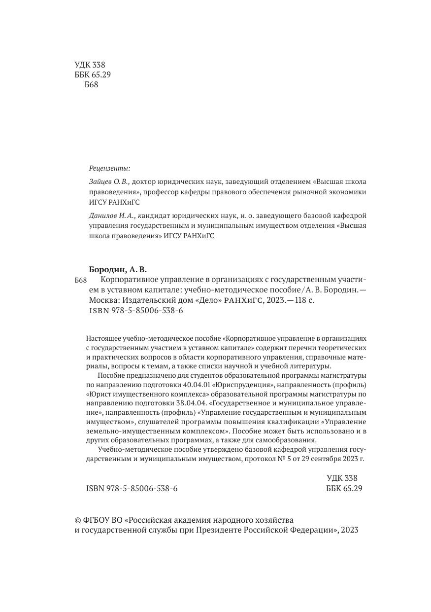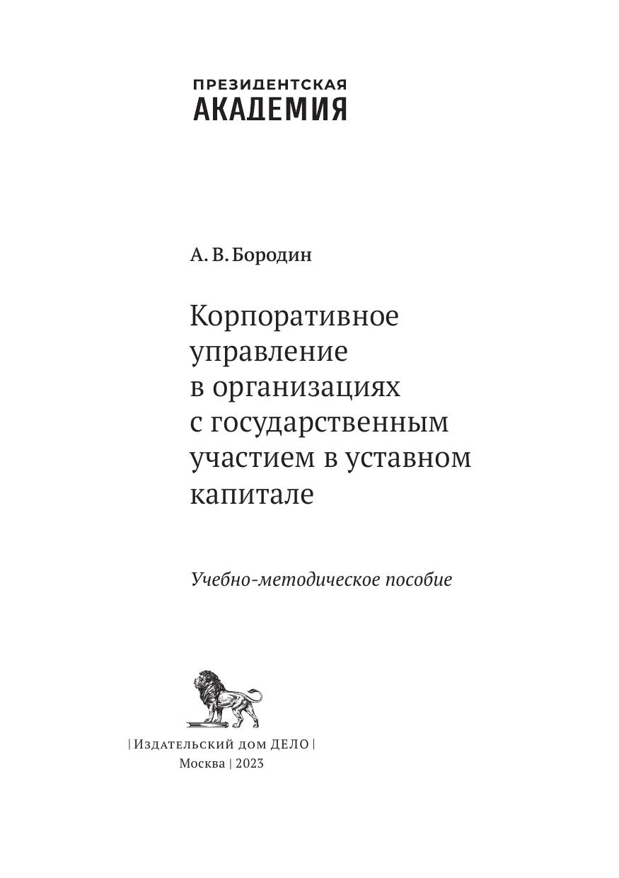 Настоящее учебно-методическое пособие «Корпоративное управление в организациях с государственным участием в уставном капитале» содержит перечни теоретических и практических вопросов в области корпоративного управления, справочные материалы, вопросы к темам, а также списки научной и учебной литературы. Пособие предназначено для студентов образовательной программы магистратуры по направлению подготовки 40.04.01 «Юриспруденция», направленность (профиль) «Юрист имущественного комплекса» образовательной программы магистратуры по направлению подготовки 38.04.04. «Государственное и муниципальное управление», направленность (профиль) «Управление государственным и муниципальным имуществом», слушателей программы повышения квалификации «Управление земельно-имущественным комплексом». Пособие может быть использовано и в других образовательных программах, а также для самообразования. Учебно-методическое пособие утверждено базовой кафедрой управления государственным и муниципальным имуществом, протокол № 5 от 29 сентября 2023 г.