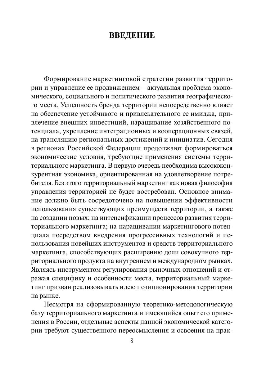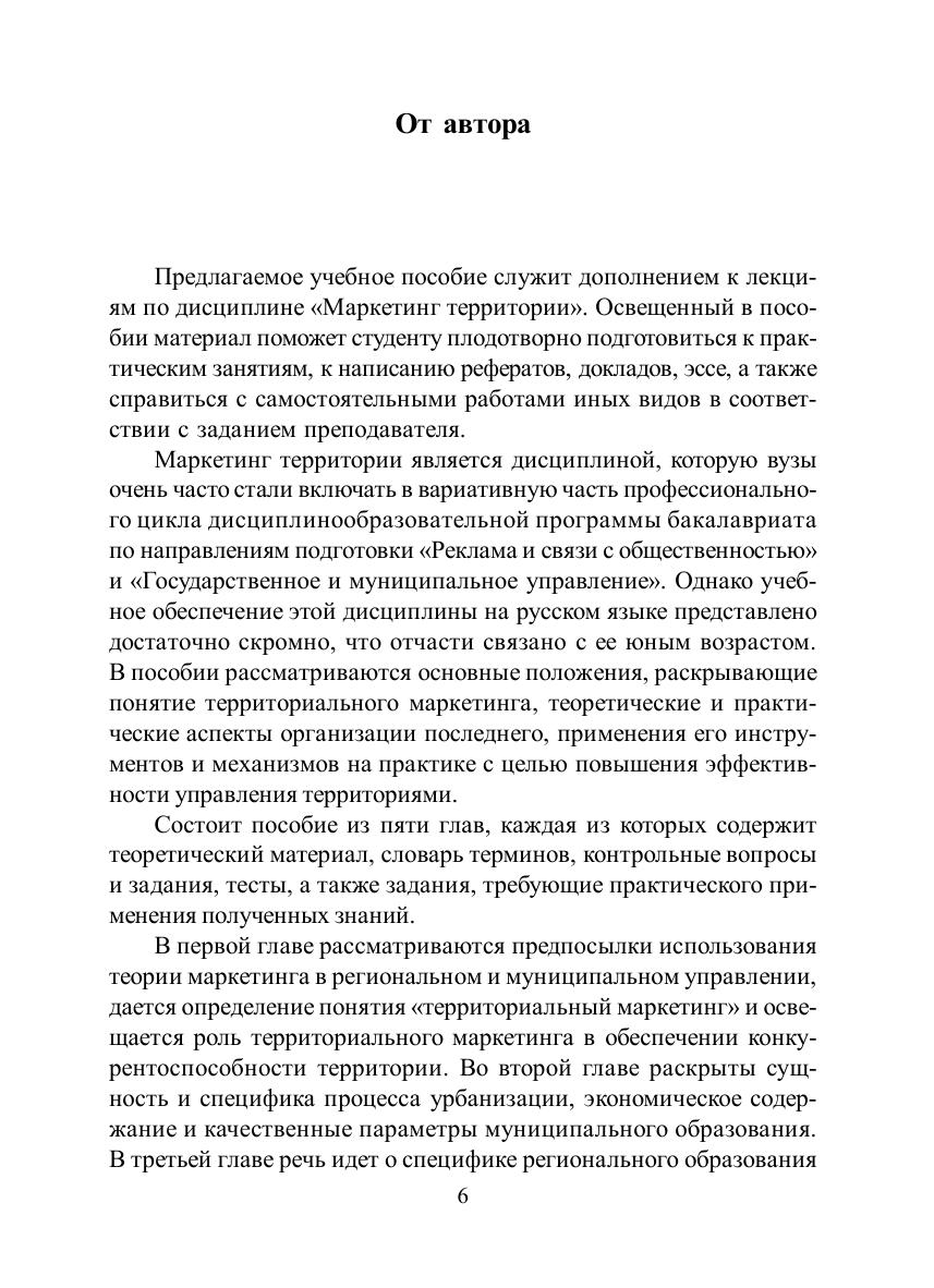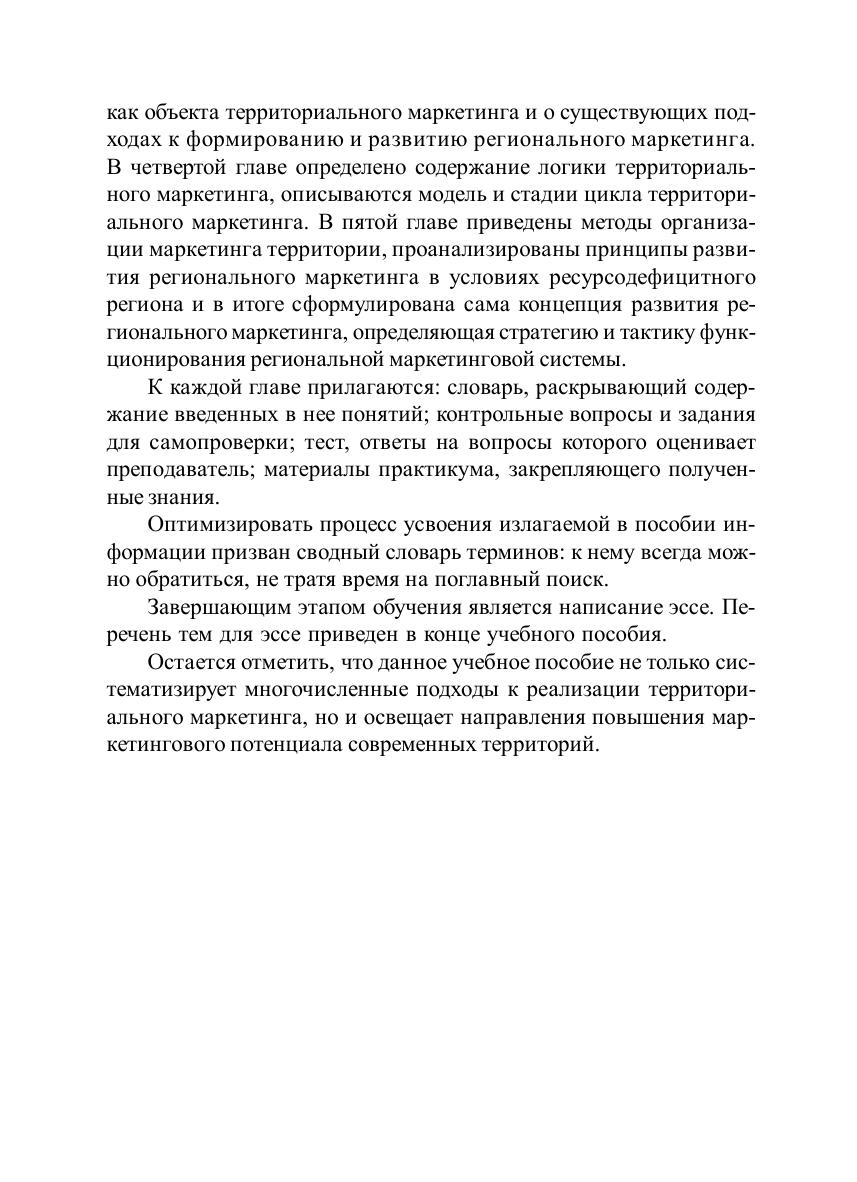 В учебном пособии раскрываются сущность и содержание маркетинга территории и как системообразующей управленческой концепции, и как функции управления территорией. Большое внимание уделено освещению основных положений формирования имиджа и репутации территории, инструментов ее позиционирования и продвижения. Для студентов бакалавриата, магистрантов, аспирантов, преподавателей экономических дисциплин.