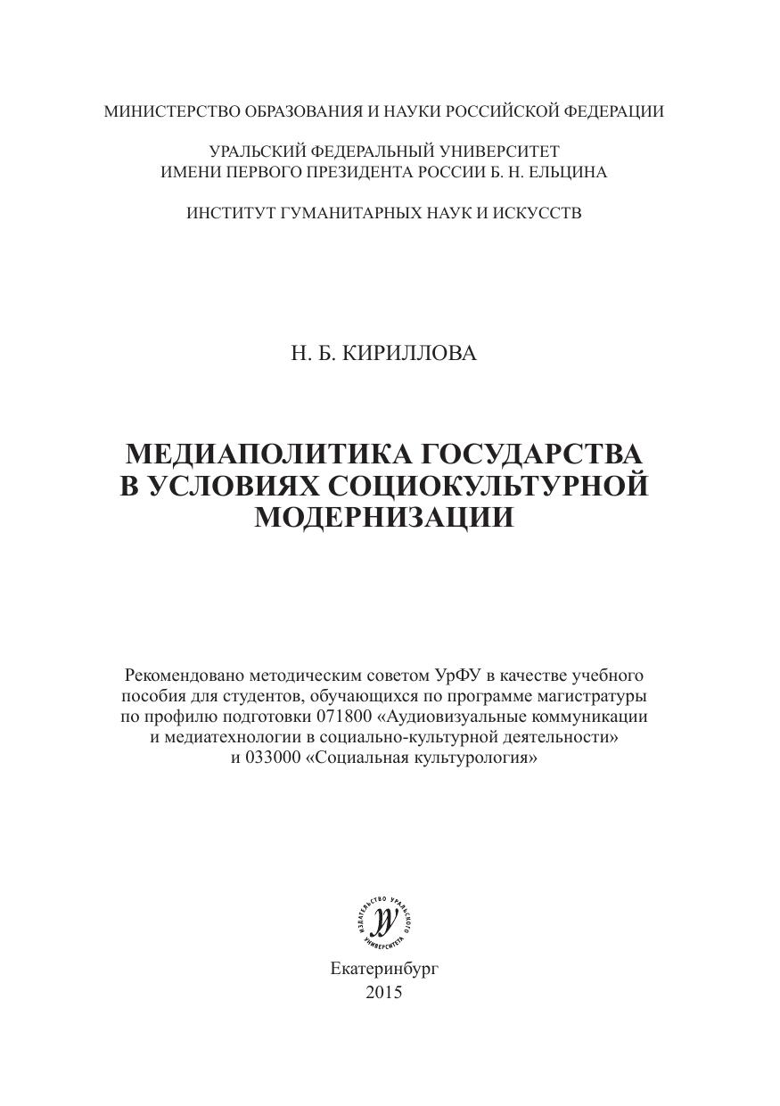Медиаполитика государства в условиях социокультурной модернизации.: учеб. пособие