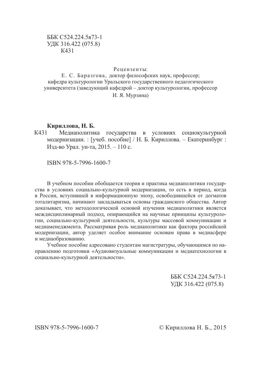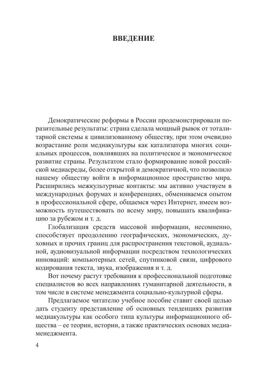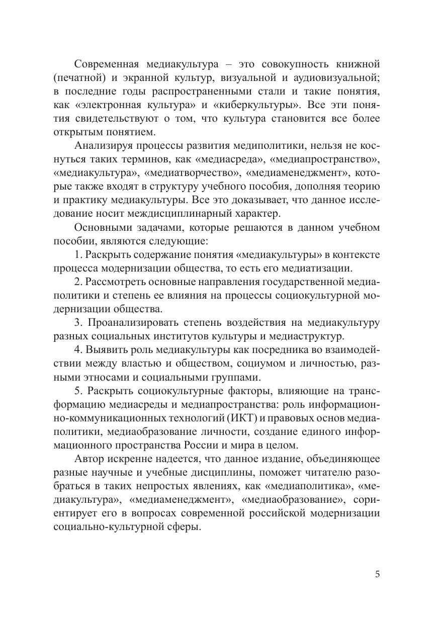 В учебном пособии обобщается теория и практика медиаполитики государства в условиях социально-культурной модернизации, то есть в период, когда в России, вступившей в информационную эпоху, освободившейся от догматов тоталитаризма, начинают закладываться основы гражданского общества. Автор доказывает, что методологической основой изучения медиаполитики является междисциплинарный подход, опирающийся на научные принципы культурологии, социально-культурной деятельности, культуры массовой коммуникации и медиаменеджмента. Рассматривая роль медиаполитики как фактора российской модернизации, автор уделяет особое внимание основам права в медиасфере и медиаобразованию. Учебное пособие адресовано студентам магистратуры, обучающимся по направлению подготовки «Аудиовизуальные коммуникации и медиатехнологии в социально-культурной деятельности».