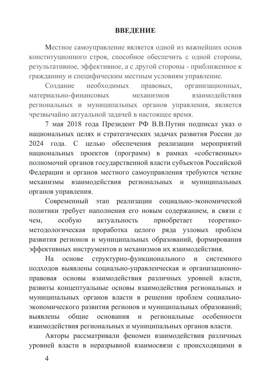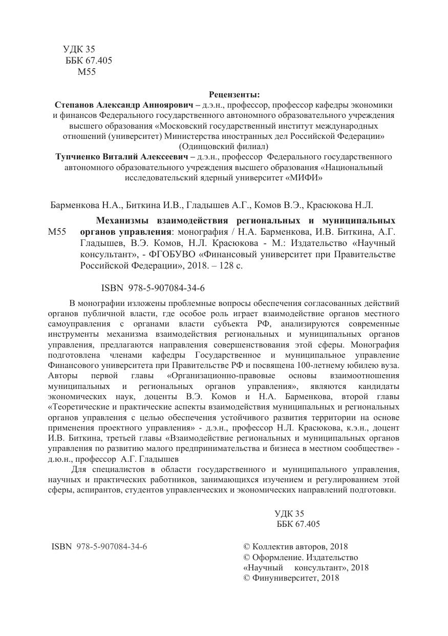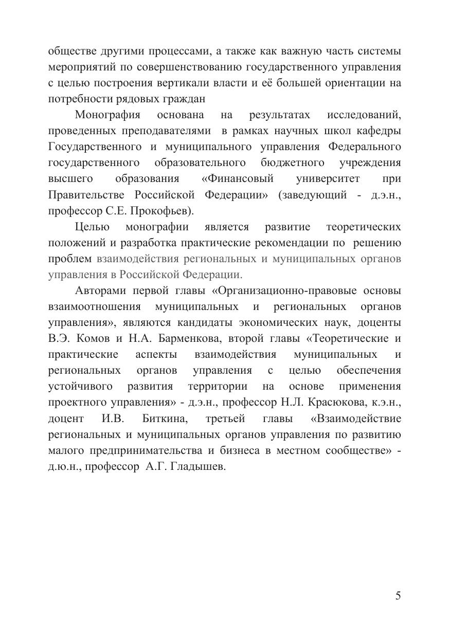 В монографии изложены проблемные вопросы обеспечения согласованных действий органов публичной власти, где особое роль играет взаимодействие органов местного самоуправления с органами власти субъекта РФ, анализируются современные инструменты механизма взаимодействий региональных и муниципальных органов управления предлагаются направления совершенствования этой сферы. Монография подготовлена членами кафедры Государственное и муниципальное управление Финансового университета при Правительстве РФ и посвящена 100-летнему юбилею вуза. Авторы первой главы «Организационно-правовые основы взаимоотношения муниципальных и региональных органов управления», являются кандидаты экономических наук, доценты В.Э. Комов и Н.А. Барменкова, второй главы «Теоретические и практические аспекты взаимодействия муниципальных и региональных органов управления с целью обеспечения устойчивого развития территории на основе применения проектного управления» - д.э.н., профессор Н.Л. Красюкова, к.э.н., доцент И.В. Биткина, третьей главы «Взаимодействие региональных и муниципальных органов управления по развитию малого предпринимательства и бизнеса в местном сообществе» - д.ю.н, профессор А.Г. Гладышев.