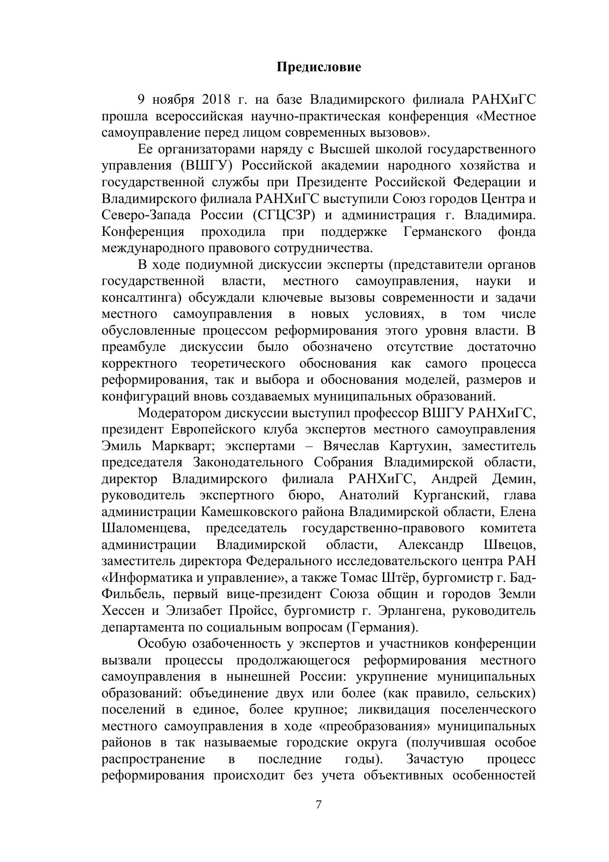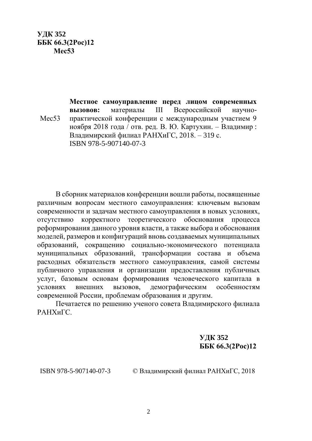 В сборник материалов конференции вошли работы, посвященные различным вопросам местного самоуправления: ключевым вызовам современности и задачам местного самоуправления в новых условиях, отсутствию корректного теоретического обоснования процесса реформирования данного уровня власти, а также выбора и обоснования моделей, размеров и конфигураций вновь создаваемых муниципальных образований, сокращению социально-экономического потенциала муниципальных образований, трансформации состава и объема расходных обязательств местного самоуправления, самой системы публичного управления и организации предоставления публичных услуг, базовым основам формирования человеческого капитала в условиях внешних вызовов, демографическим особенностям современной России, проблемам образования и другим. Печатается по решению ученого совета Владимирского филиала РАНХиГС.