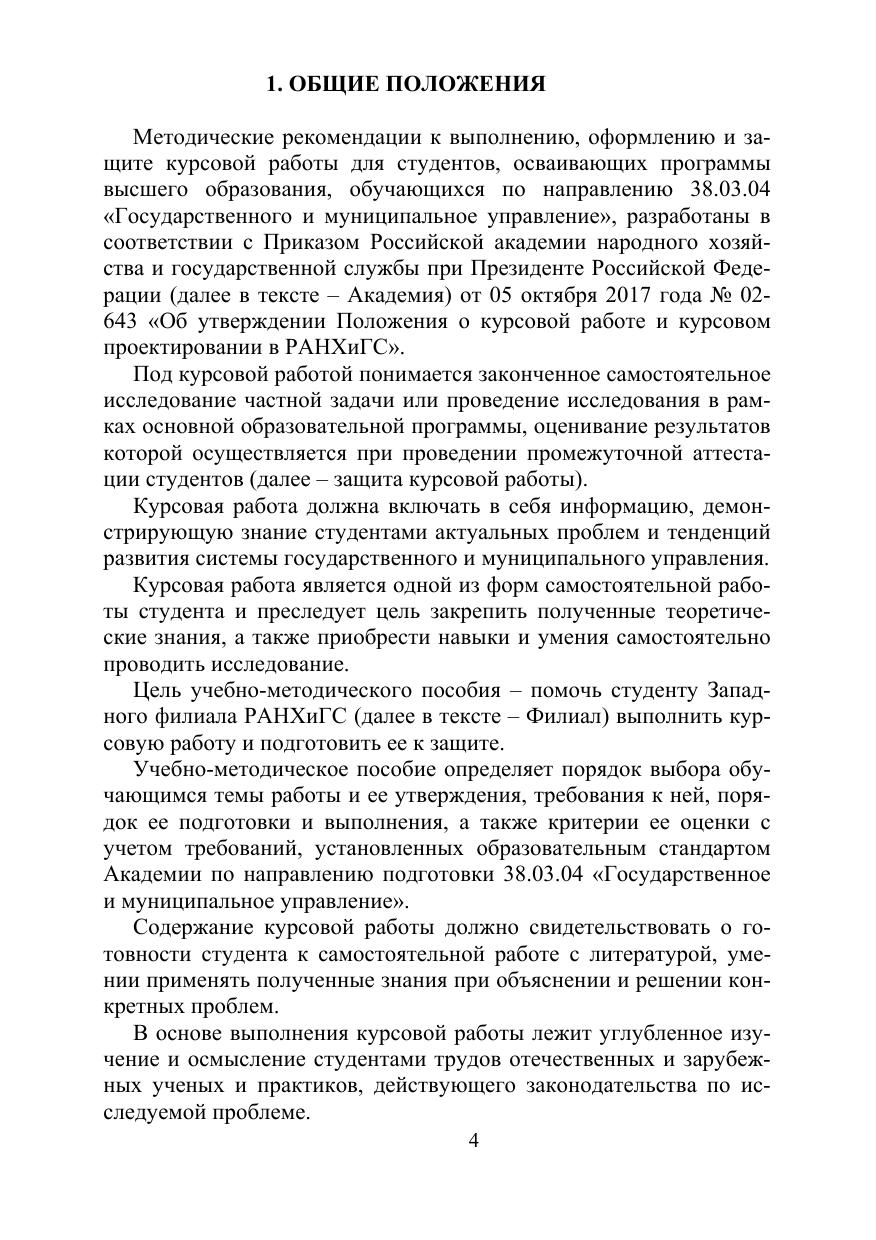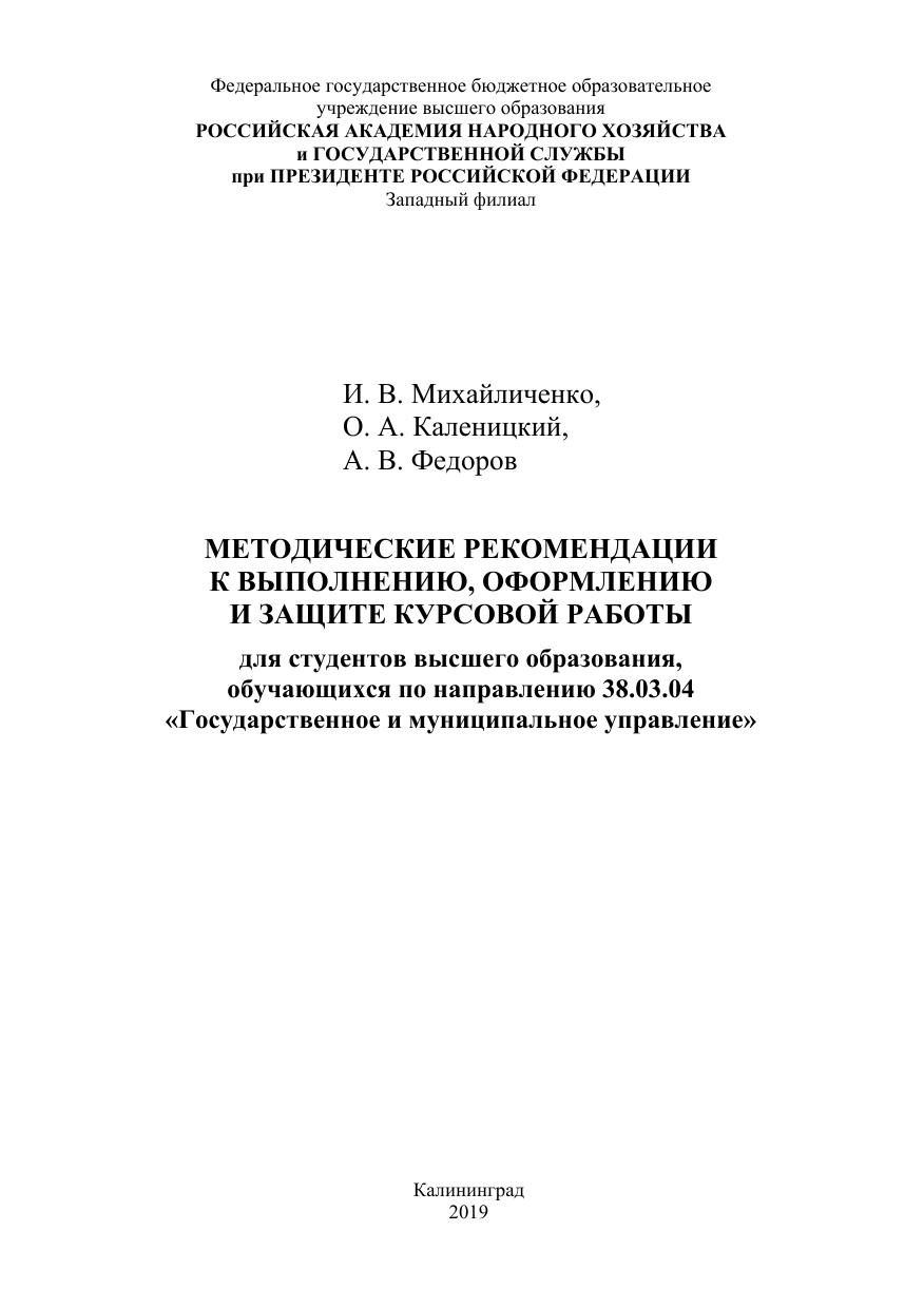 Методические рекомендации к выполнению, оформлению и защите курсовой работы для студентов высшего образования, обучающихся по направлению 38.03.04 «Государственное и муниципальное управление»
