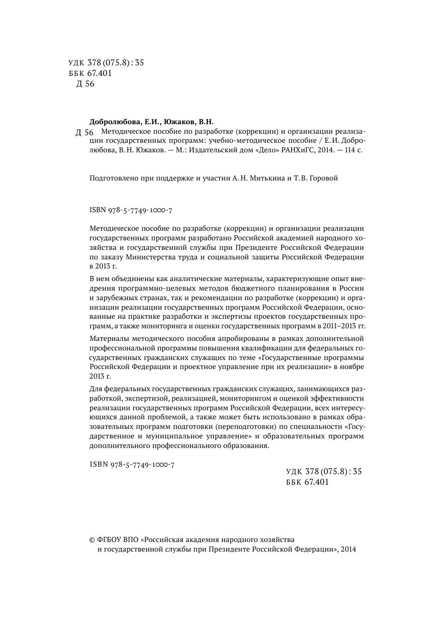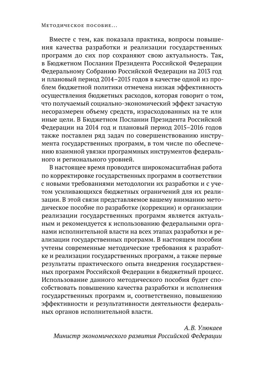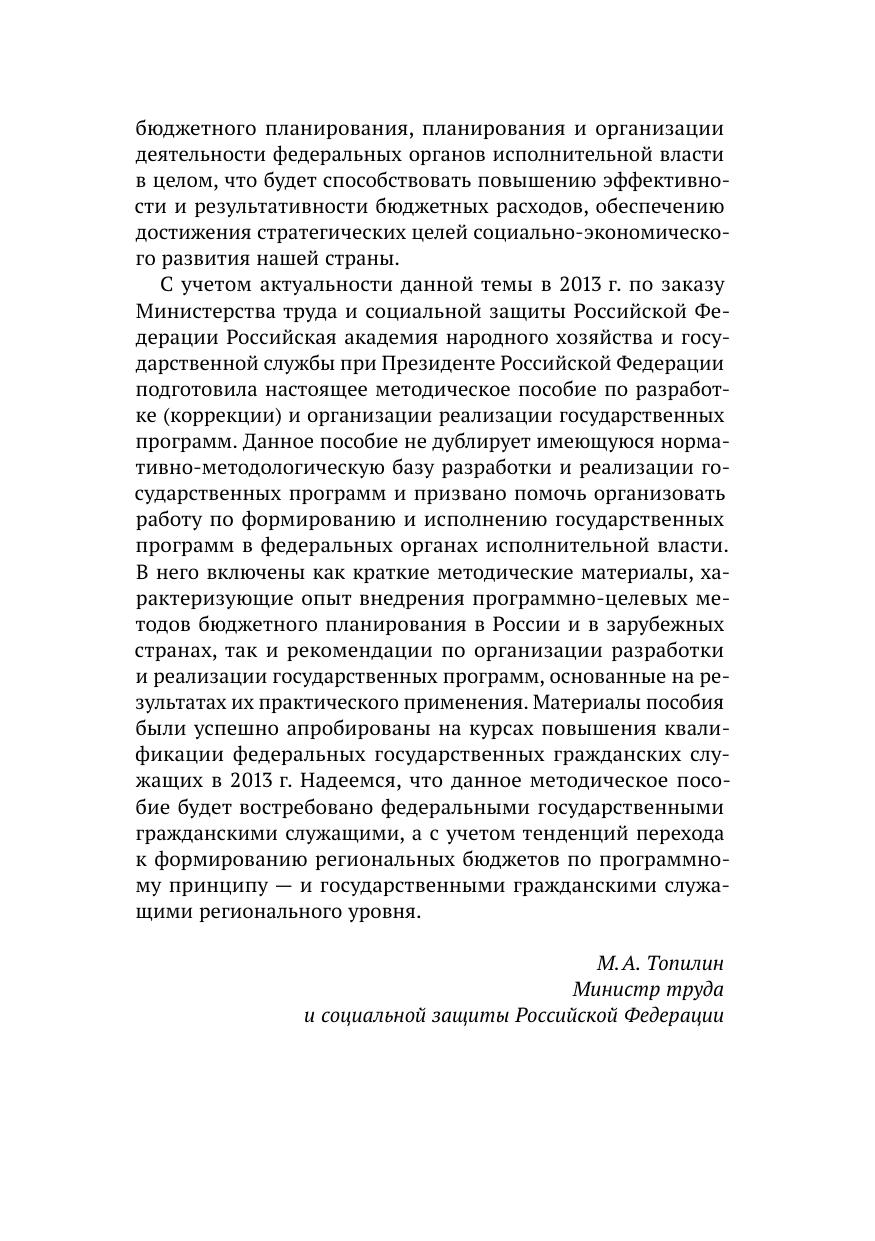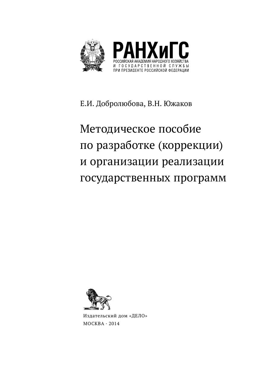 Методическое пособие по разработке (коррекции) и организации реализации государственных программ разработано Российской академией народного хозяйства и государственной службы при Президенте Российской Федерации по заказу Министерства труда и социальной защиты Российской Федерации в 2013 г. В нем объединены как аналитические материалы, характеризующие опыт внедрения программно-целевых методов бюджетного планирования в России и зарубежных странах, так и рекомендации по разработке (коррекции) и организации реализации государственных программ Российской Федерации, основанные на практике разработки и экспертизы проектов государственных программ, а также мониторинга и оценки государственных программ в 2011-2013 гг. Материалы методического пособия апробированы в рамках дополнительной профессиональной программы повышения квалификации для федеральных государственных гражданских служащих по теме «Государственные программы Российской Федерации и проектное управление при их реализации» в ноябре 2013 г. Для федеральных государственных гражданских служащих, занимающихся разработкой, экспертизой, реализацией, мониторингом и оценкой эффективности реализации государственных программ Российской Федерации, всех интересующихся данной проблемой, а также может быть использовано в рамках образовательных программ подготовки (переподготовки) о специальности «Государственное и муниципальное управление» и образовательных программ дополнительного профессионального образования