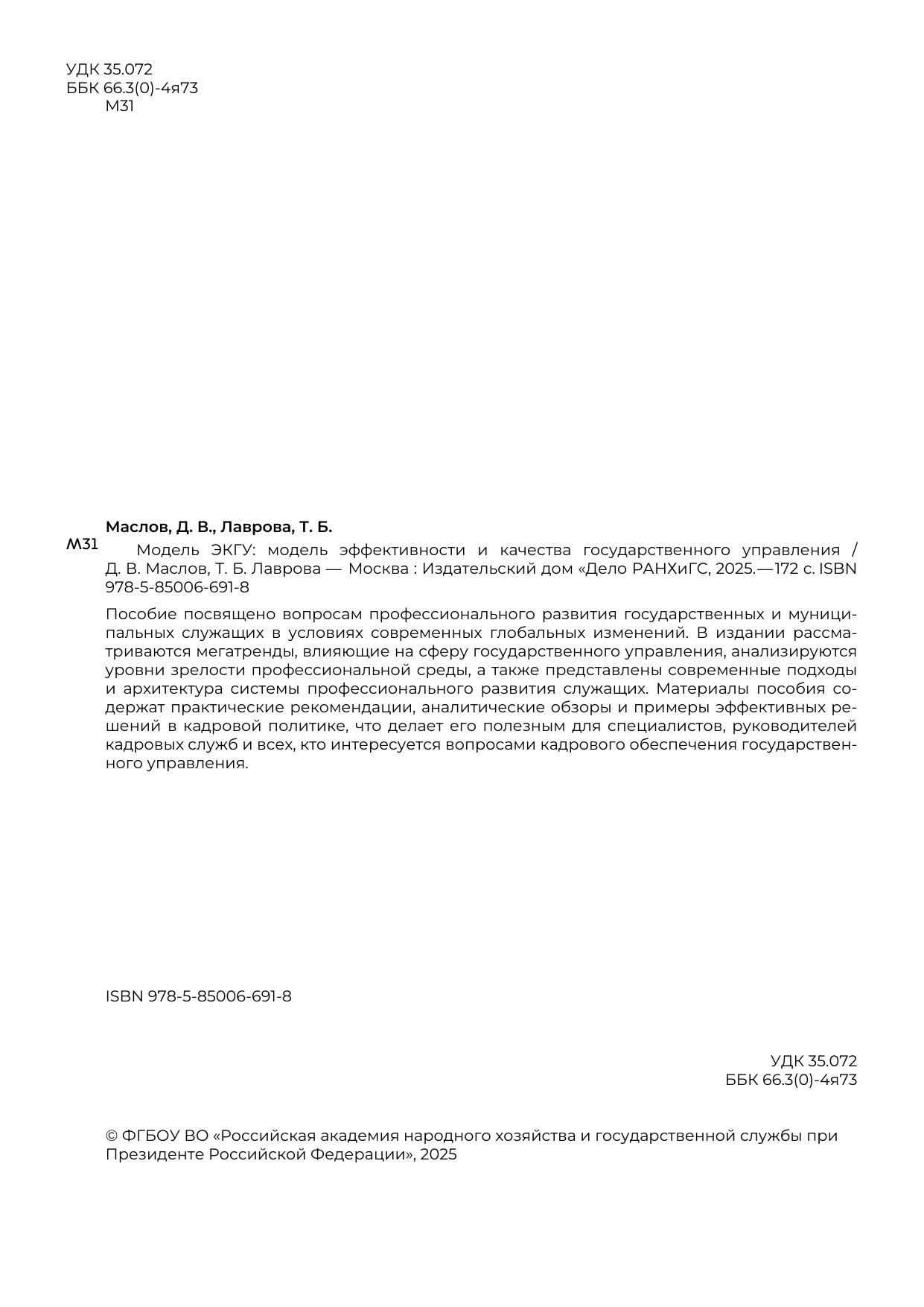 Пособие посвящено вопросам профессионального развития государственных и муниципальных служащих в условиях современных глобальных изменений. В издании рассматриваются мегатренды, влияющие на сферу государственного управления, анализируются уровни зрелости профессиональной среды, а также представлены современные подходы и архитектура системы профессионального развития служащих. Материалы пособия содержат практические рекомендации, аналитические обзоры и примеры эффективных решений в кадровой политике, что делает его полезным для специалистов, руководителей кадровых служб и всех, кто интересуется вопросами кадрового обеспечения государственного управления.