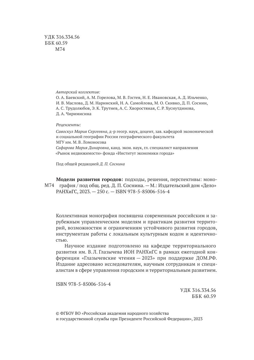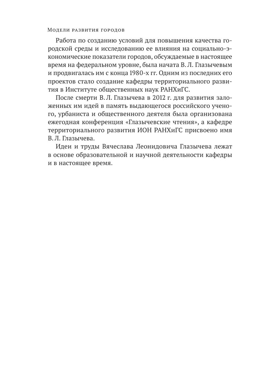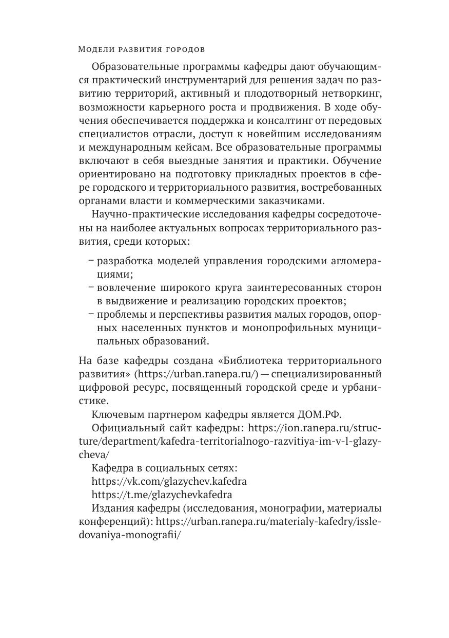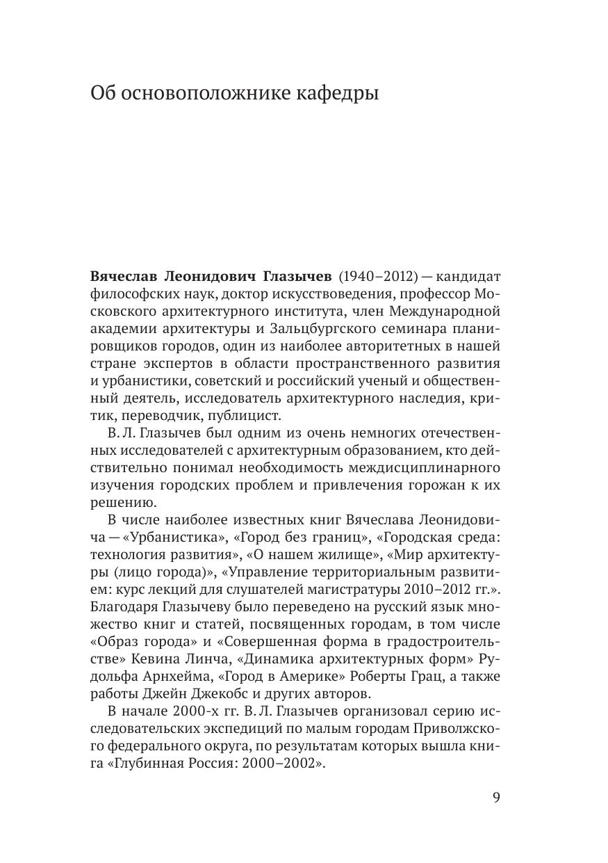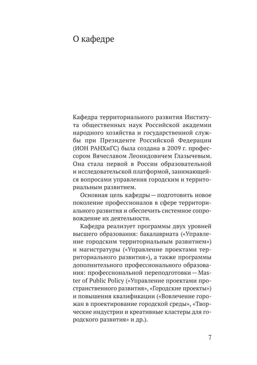Коллективная монография посвящена современным российским и зарубежным управленческим моделям и практикам развития территорий, возможностям и ограничениям устойчивого развития городов, инструментам работы с локальным культурным кодом и идентичностью. Научное издание подготовлено на кафедре территориального развития им. В. Л. Глазычева ИОН РАНХиГС в рамках ежегодной конференции «Глазычевские чтения — при поддержке ДОМ.РФ. Издание адресовано исследователям, научным сотрудникам и специалистам в сфере управления городским и территориальным развитием.