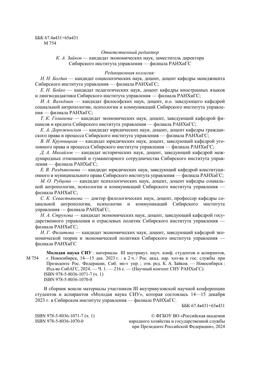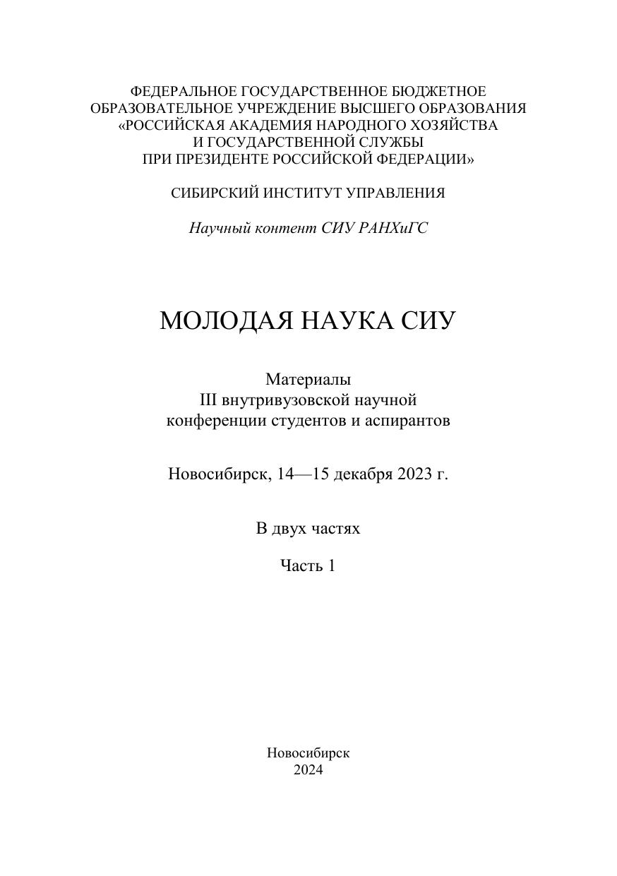 В сборник вошли материалы участников III внутривузовской научной конференции студентов и аспирантов «Молодая наука СИУ», которая состоялась 14—15 декабря 2023 г. в Сибирском институте управления — филиале РАНХиГС.