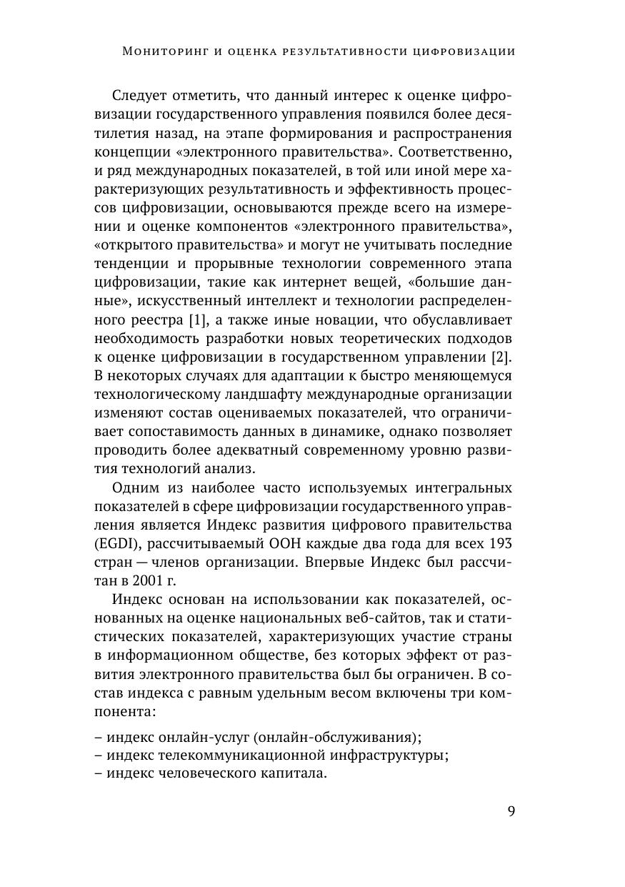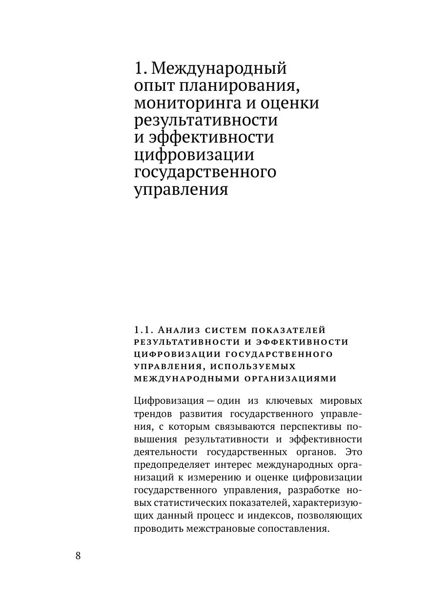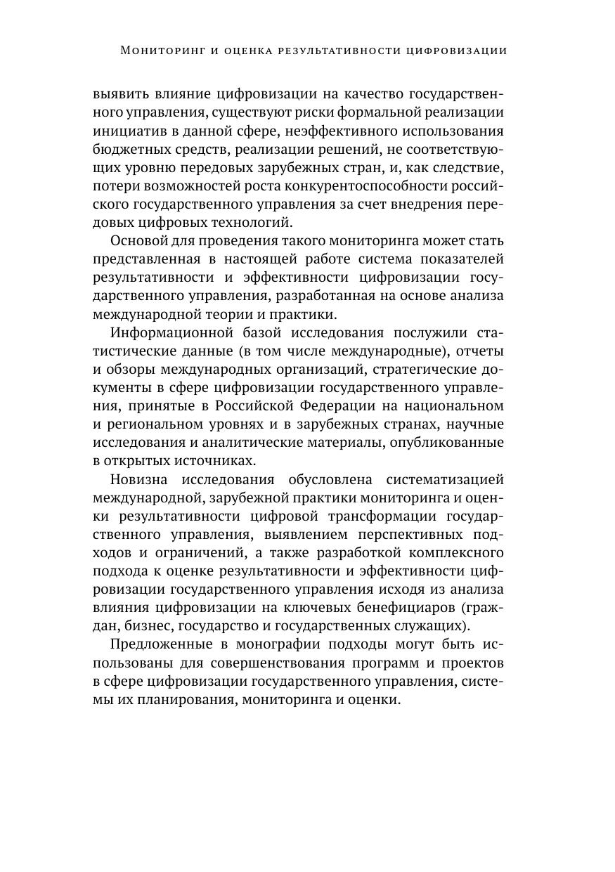 В монографии представлен опыт международных организаций и зарубежных стран по разработке показателей результативности и эффективности цифровизации государственного управления. На основе зарубежного опыта с учетом положений российских стратегических и программных документов обоснован комплексный подход к оценке конечных эффектов цифровизации государственного управления, значимых для ключевых заинтересованных сторон — граждан, бизнеса, государства и государственных служащих. В рамках реализации предложенного подхода разработана система показателей результативности и эффективности цифровизации государственного управления, сформулированы рекомендации по корректировке документов стратегического планирования. Представленная в монографии система показателей результативности и эффективности цифровизации государственного управления может быть использована в рамках мониторинга реализации федерального проекта «Цифровое государственное управление».