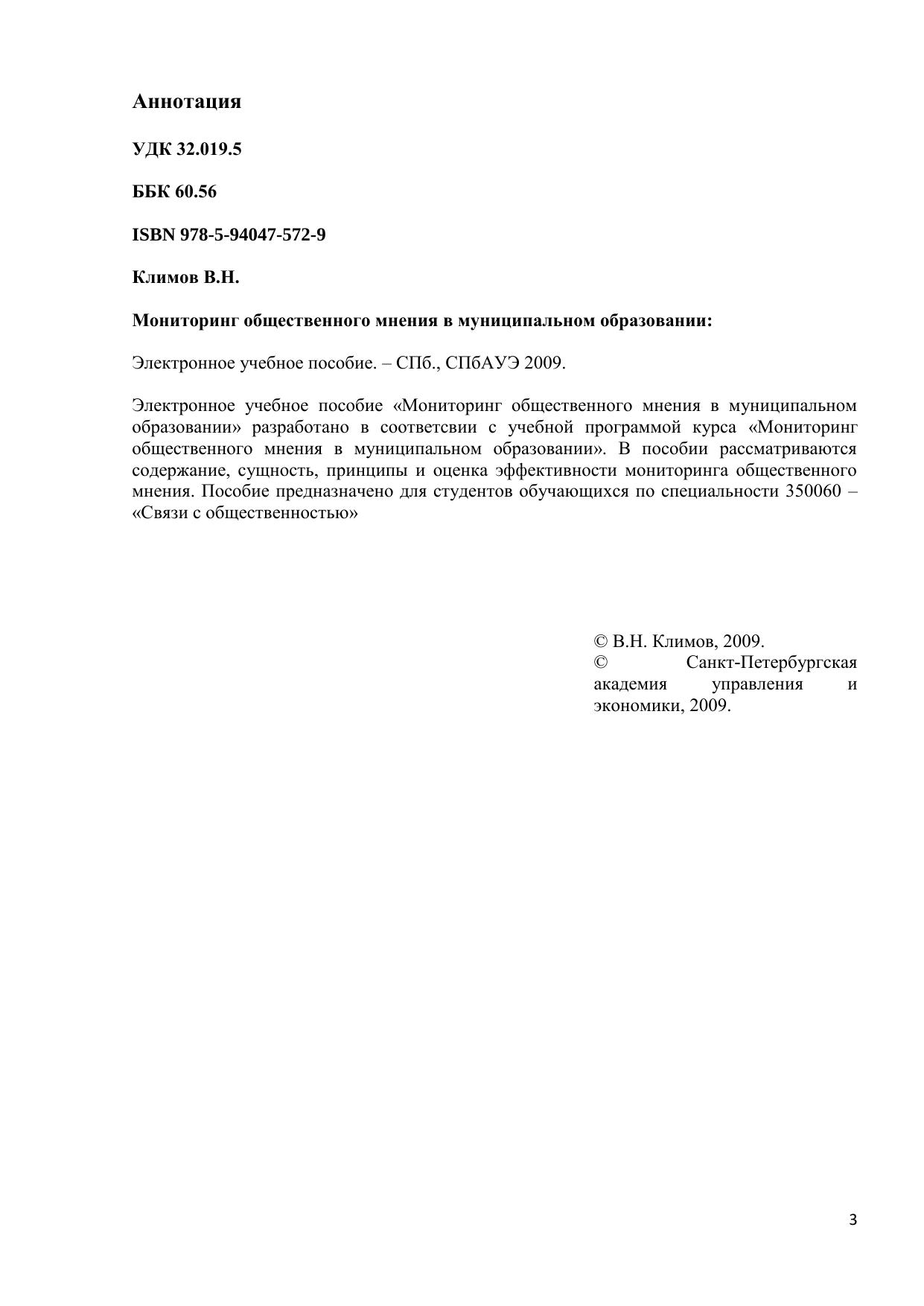 Электронное учебное пособие «Мониторинг общественного мнения в муниципальном образовании» разработано в соответствии с учебной программой курса «Мониторинг общественного мнения в муниципальном образовании». В пособии рассматриваются содержание, сущность, принципы и оценка эффективности мониторинга общественного мнения. Пособие предназначено для студентов, обучающихся по специальности 350060 – «Связи с общественностью». Электронное учебное пособие для дистанционного обучения
