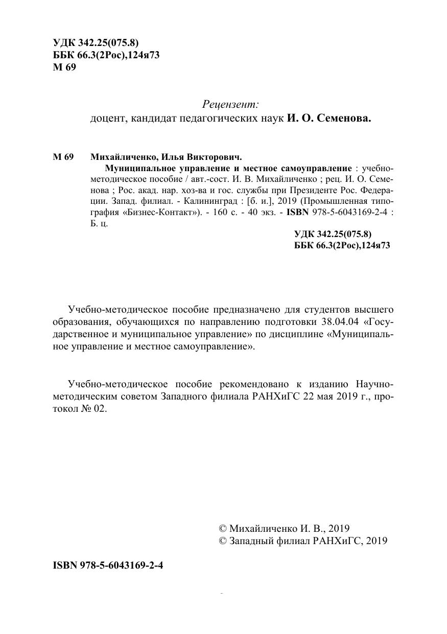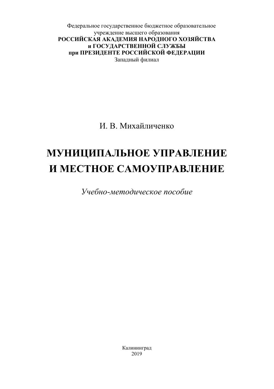 Учебно-методическое пособие предназначено для студентов высшего образования, обучающихся по направлению подготовки 38.04.04 «Госу-дарственное и муниципальное управление» по дисциплине «Муниципаль-ное управление и местное самоуправление».