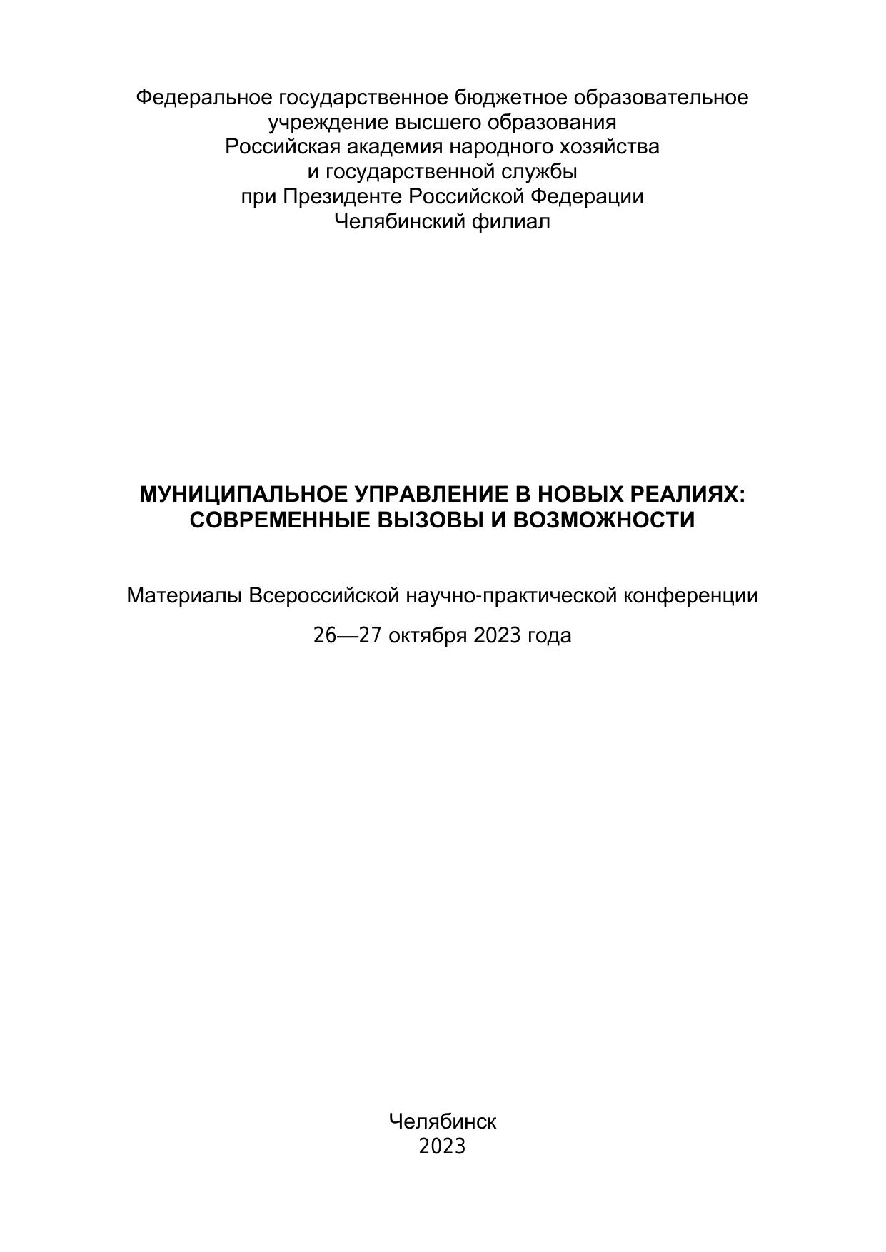 Муниципальное управление в новых реалиях: современные вызовы и возможности: Материалы Всерос. науч.-практ. конф. (26-27 октября 2023)