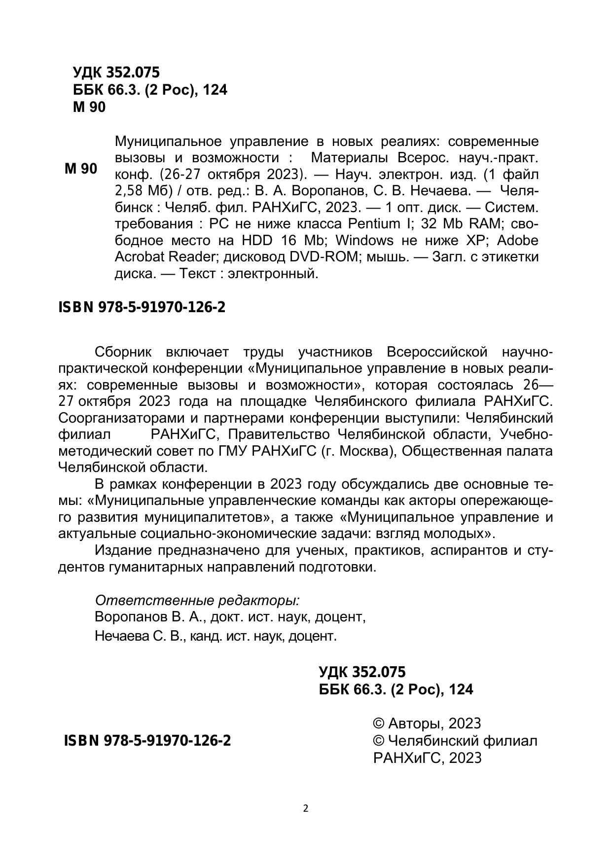 Сборник включает труды участников Всероссийской научно-практической конференции «Муниципальное управление в новых реали-ях: современные вызовы и возможности», которая состоялась 26—27 октября 2023 года на площадке Челябинского филиала РАНХиГС. Соорганизаторами и партнерами конференции выступили: Челябинский филиал РАНХиГС, Правительство Челябинской области, Учебно-методический совет по ГМУ РАНХиГС (г. Москва), Общественная палата Челябинской области. В рамках конференции в 2023 году обсуждались две основные те-мы: «Муниципальные управленческие команды как акторы опережающе-го развития муниципалитетов», а также «Муниципальное управление и актуальные социально-экономические задачи: взгляд молодых». Издание предназначено для ученых, практиков, аспирантов и сту-дентов гуманитарных направлений подготовки.