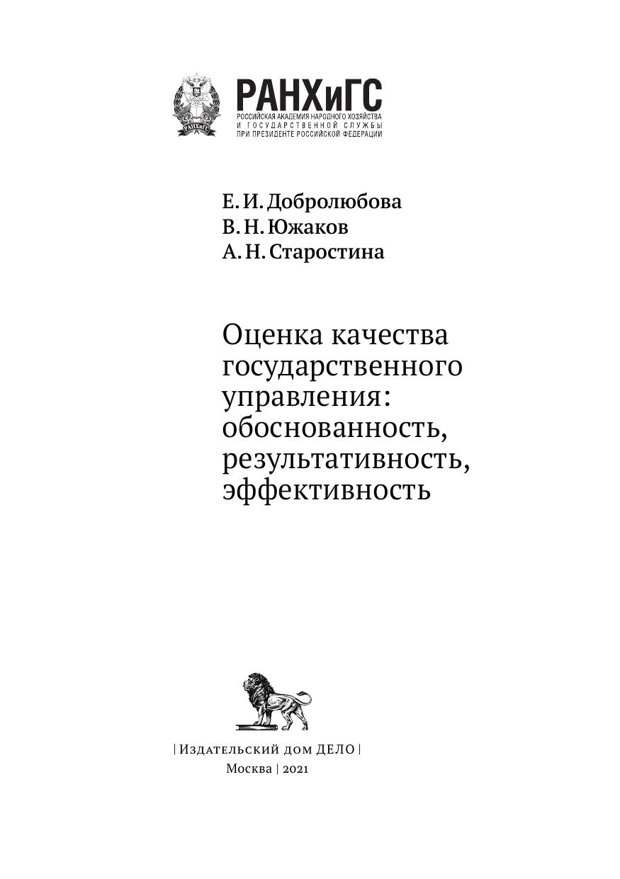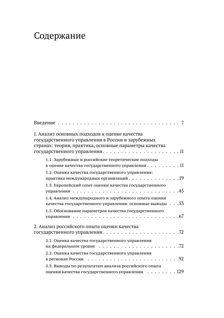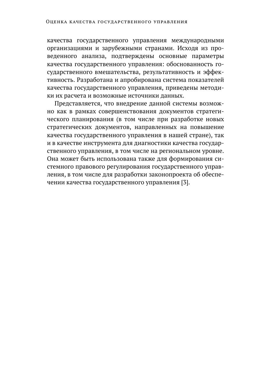В монографии представлен анализ зарубежных и российских теоретических и эмпирических подходов к определению, измерению и оценке качества государственного управления. Проведен анализ показателей качества государственного управления, используемых в стратегических документах федерального и регионального уровней, выявлены основные пробелы в практике текущей оценки. Разработана система показателей, позволяющая оценить обоснованность государственного вмешательства, результативность и эффективность государственного управления в целом, укрупненных видов государственных функций, а также внутренних управленческих процессов в органах государственной власти.