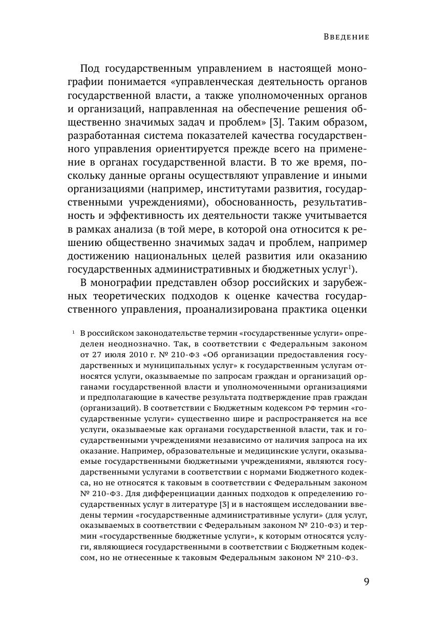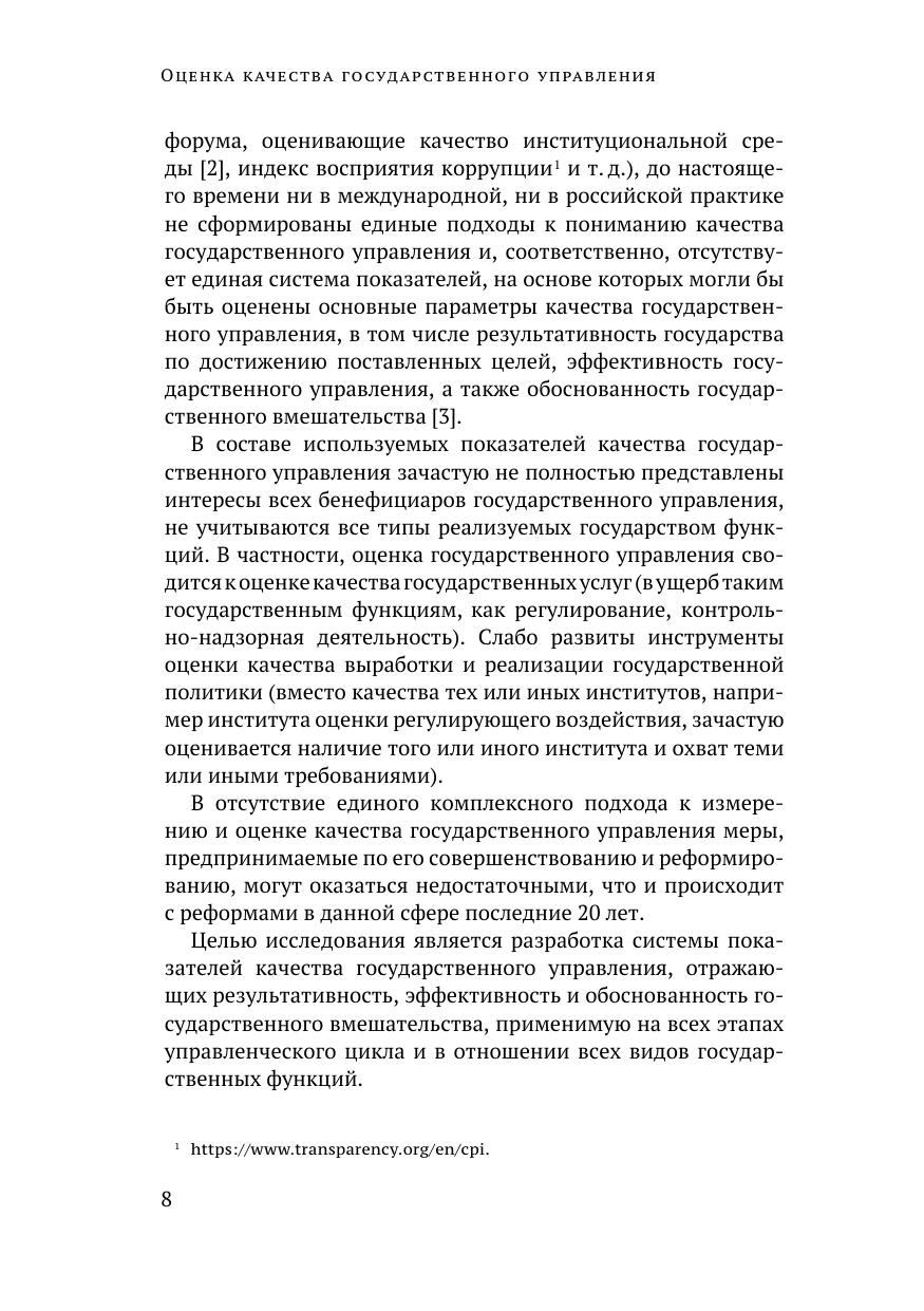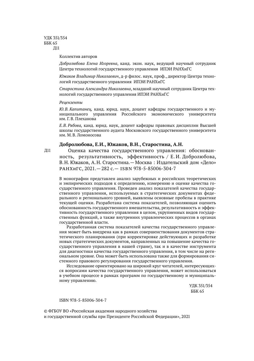 В монографии представлен анализ зарубежных и российских теоретических и эмпирических подходов к определению, измерению и оценке качества государственного управления. Проведен анализ показателей качества государственного управления, используемых в стратегических документах федерального и регионального уровней, выявлены основные пробелы в практике текущей оценки. Разработана система показателей, позволяющая оценить обоснованность государственного вмешательства, результативность и эффективность государственного управления в целом, укрупненных видов государственных функций, а также внутренних управленческих процессов в органах государственной власти.