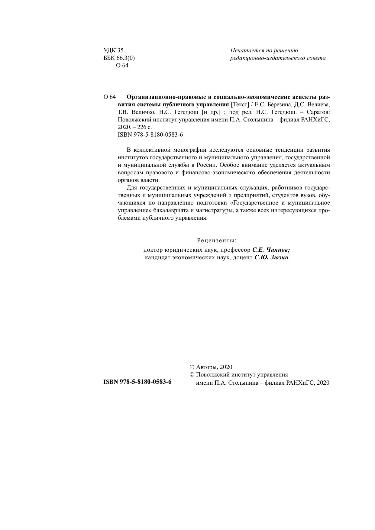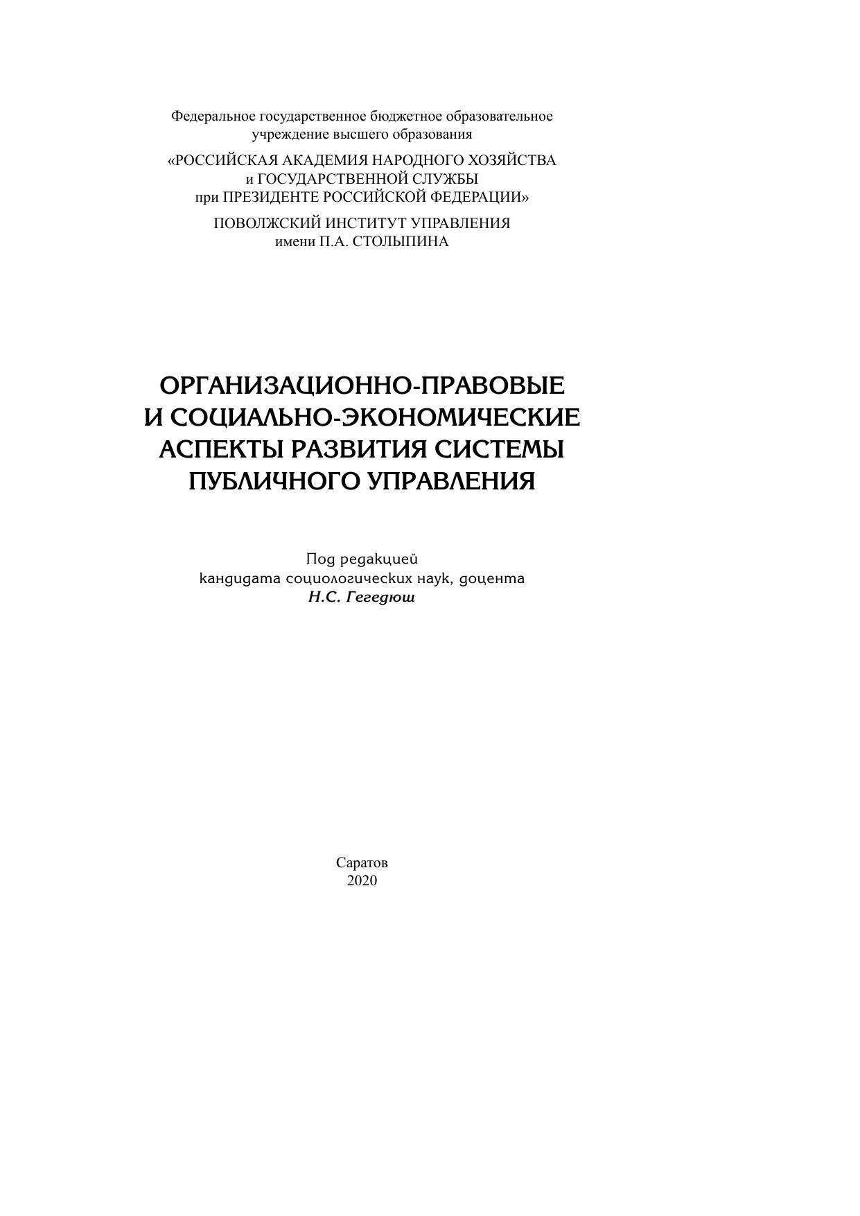 Организационно-правовые и социально-экономические аспекты развития системы публичного управления
