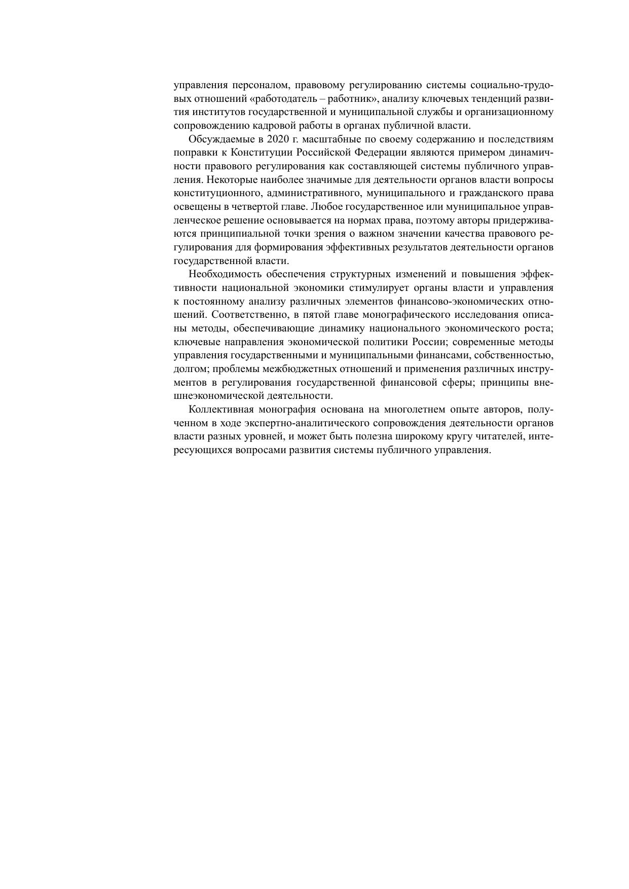 В коллективной монографии исследуются основные тенденции развития институтов государственного и муниципального управления, государственной и муниципальной службы в России. Особое внимание уделяется актуальным вопросам правового и финансово-экономического обеспечения деятельности органов власти. Для государственных и муниципальных служащих, работников государственных и муниципальных учреждений и предприятий, студентов вузов, обучающихся по направлению подготовки «Государственное и муниципальное управление» бакалавриата и магистратуры, а также всех интересующихся проблемами публичного управления.