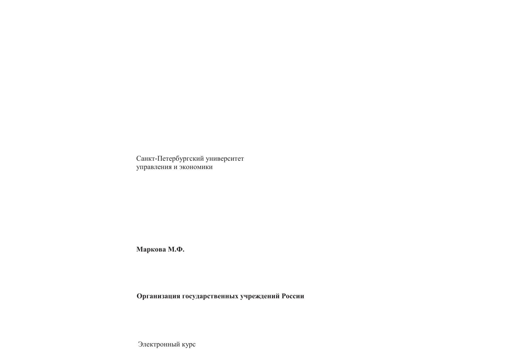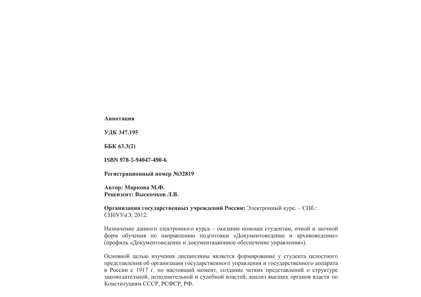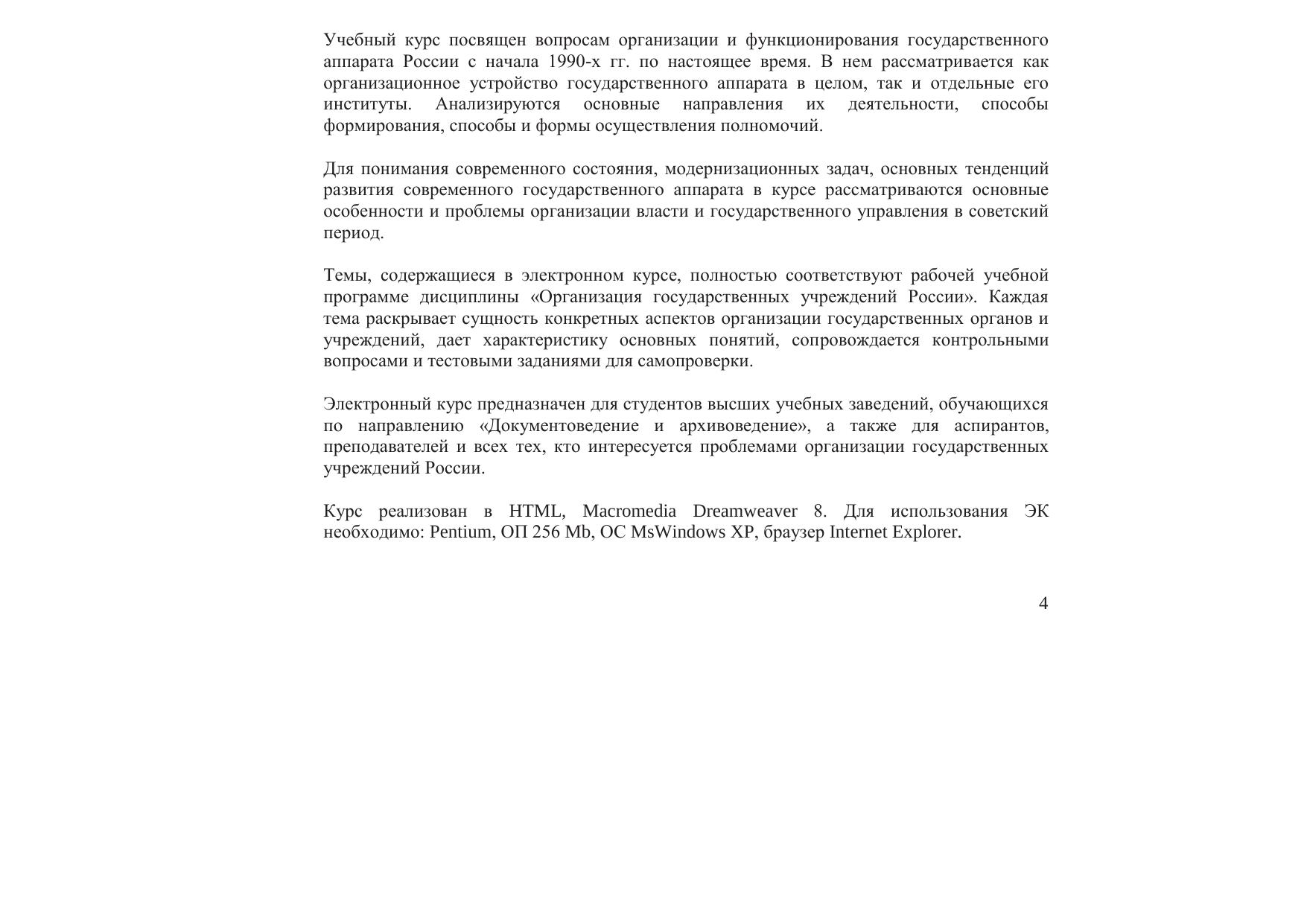 Назначение данного электронного курса – оказание помощи студентам, очной и заочной форм обучения по направлению подготовки «Документоведение и архивоведение» (профиль «Документоведение и документационное обеспечение управления»). Основной целью изучения дисциплины является формирование у студента целостного представления об организации государственного управления и государственного аппарата в России с 1917 г. по настоящий момент, создание четких представлений о структуре законодательной, исполнительной и судебной властей, анализ высших органов власти по Конституциям СССР, РСФСР, РФ. Учебный курс посвящен вопросам организации и функционирования государственного аппарата России с начала 1990-х гг. по настоящее время. В нем рассматривается как организационное устройство государственного аппарата в целом, так и отдельные его институты. Анализируются основные направления их деятельности, способы формирования, способы и формы осуществления полномочий. Для понимания современного состояния, модернизационных задач, основных тенденций развития современного государственного аппарата в курсе рассматриваются основные особенности и проблемы организации власти и государственного управления в советский период. Темы, содержащиеся в электронном курсе, полностью соответствуют рабочей учебной программе дисциплины «Организация государственных учреждений России». Каждая тема раскрывает сущность конкретных аспектов организации государственных органов и учреждений, дает характеристику основных понятий, сопровождается контрольными вопросами и тестовыми заданиями для самопроверки. Электронный курс предназначен для студентов высших учебных заведений, обучающихся по направлению «Документоведение и архивоведение», а также для аспирантов, преподавателей и всех тех, кто интересуется проблемами организации государственных учреждений России. Курс реализован в HTML, Macromedia Dreamweaver 8. Для использования ЭК необходимо: Pentium, ОП 256 Mb, ОС MsWindows XP, браузер Internet Explorer.