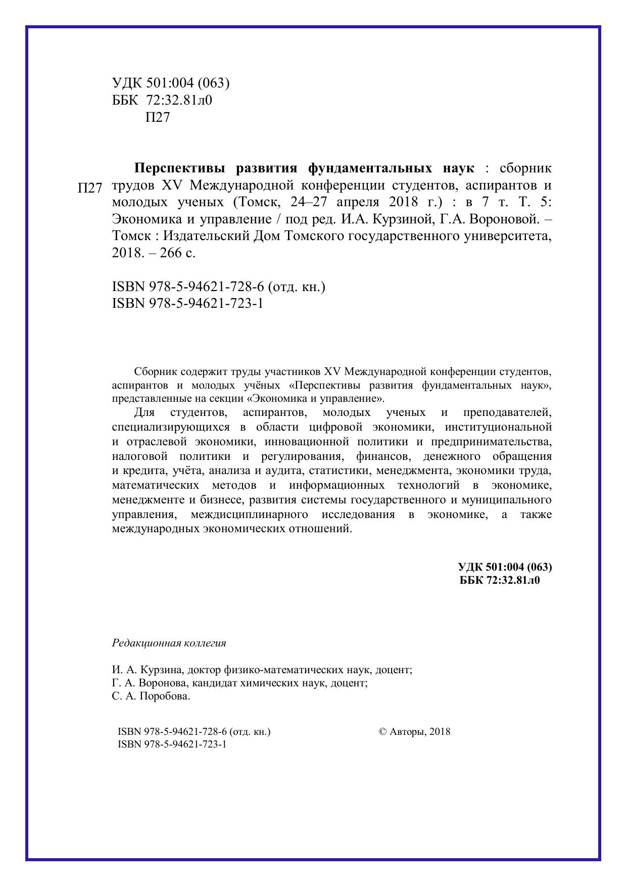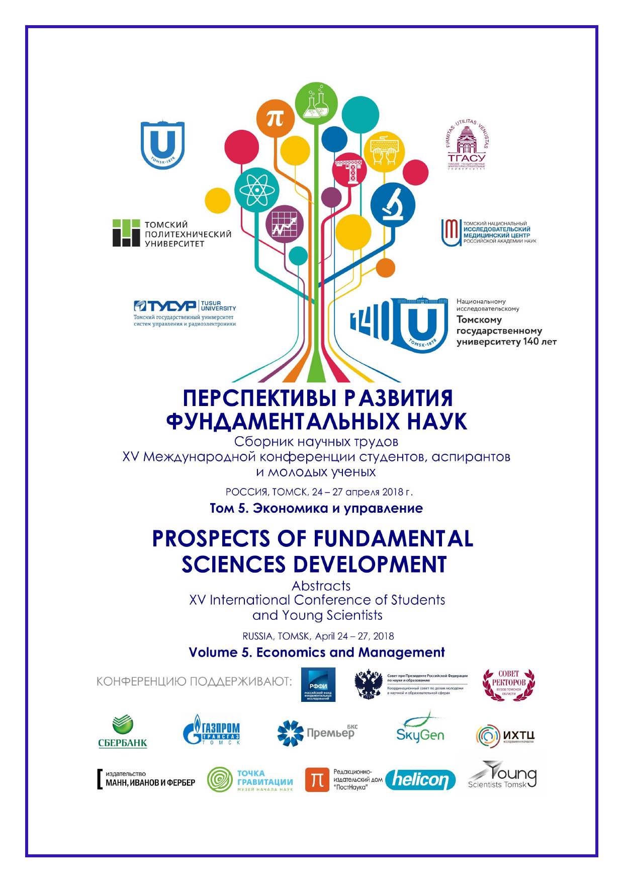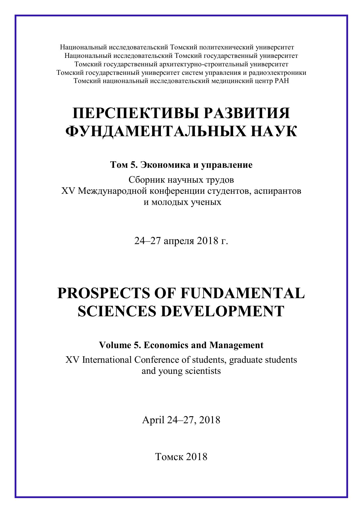 Сборник содержит труды участников XV Международной конференции студентов, аспирантов и молодых учёных «Перспективы развития фундаментальных наук», представленные на секции «Экономика и управление». Для студентов, аспирантов, молодых ученых и преподавателей, специализирующихся в области цифровой экономики, институциональной и отраслевой экономики, инновационной политики и предпринимательства, налоговой политики и регулирования, финансов, денежного обращения и кредита, учёта, анализа и аудита, статистики, менеджмента, экономики труда, математических методов и информационных технологий в экономике, менеджменте и бизнесе, развития системы государственного муниципального управления, междисциплинарного исследования в экономике, а также международных экономических отношений.