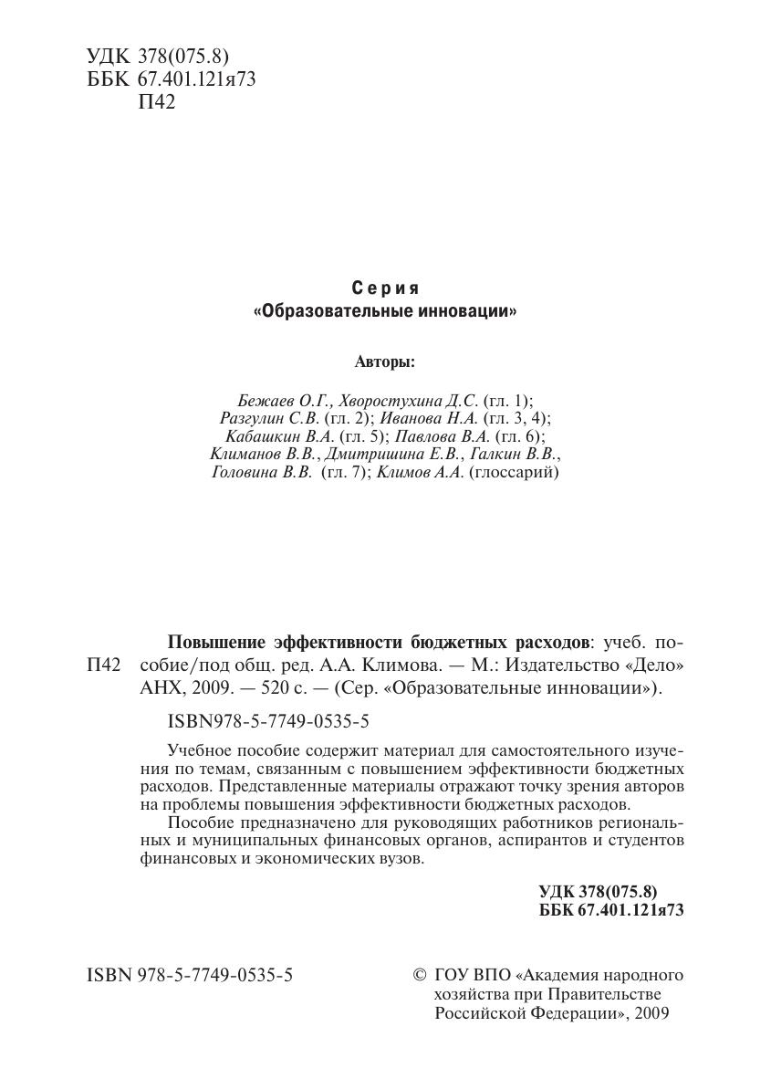 Серия Образовательные инновации. Учебное пособие содержит материал для самостоятельного изучения по темам, связанным с повышением эффективности бюджетных расходов. Представленные материалы отражают точку зрения авторов на проблемы повышения эффективности бюджетных расходов. Пособие предназначено для руководящих работников региональных и муниципальных финансовых органов, аспирантов и студентов финансовых и экономических вузов