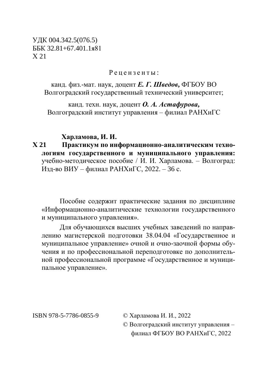 Пособие содержит практические задания по дисциплине «Информационно-аналитические технологии государственного и муниципального управления». Для обучающихся высших учебных заведений по направ-лению магистерской подготовки 38.04.04 «Государственное и муниципальное управление» очной и очно-заочной формы обу-чения и по профессиональной переподготовке по дополнитель-ной профессиональной программе «Государственное и муници-пальное управление».