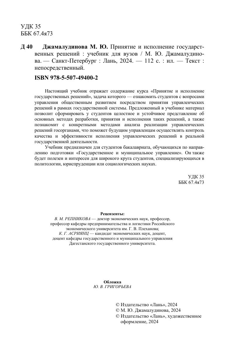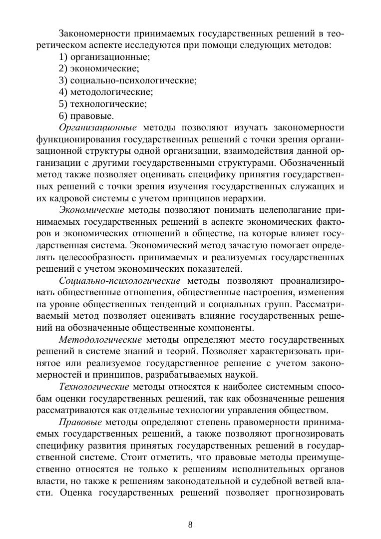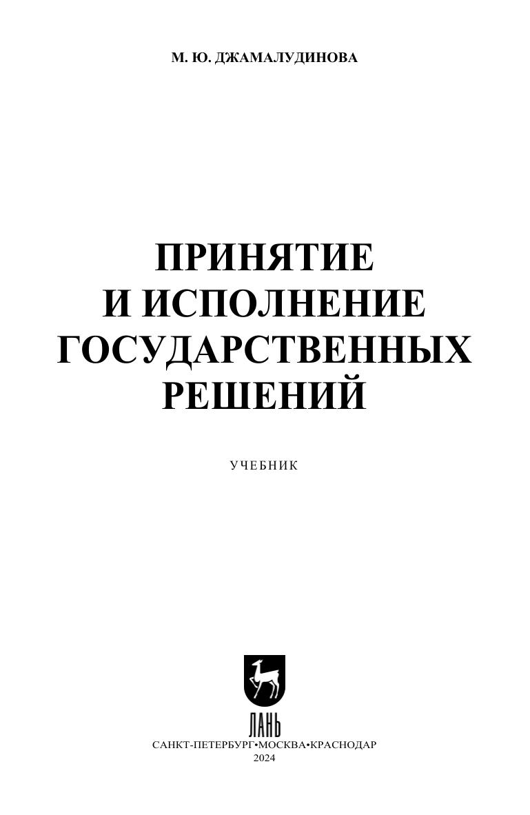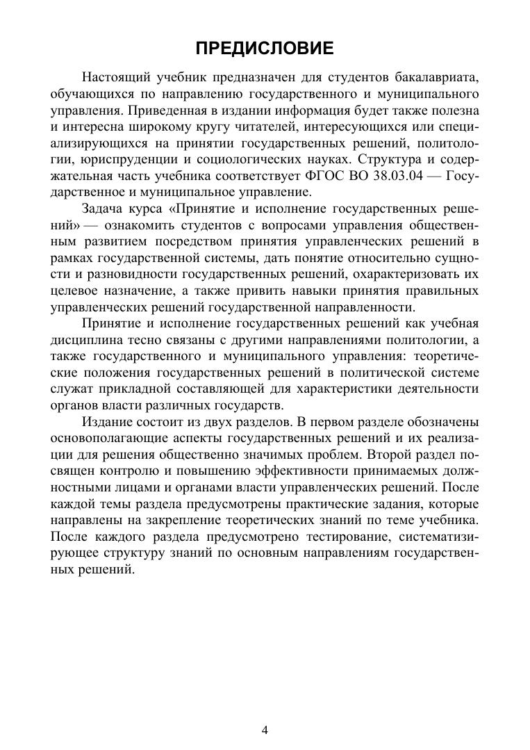 Настоящий учебник отражает содержание курса «Принятие и исполнение государственных решений», задача которого — ознакомить студентов с вопросами управления общественным развитием посредством принятия управленческих решений в рамках государственной системы. Предложенный в учебнике материал позволит сформировать у студентов целостное и устойчивое представление об основных методах разработки, принятия и исполнения таких решений, а также познакомит с конкретными методами анализа реализации управленческих решений госорганами, что поможет будущим управленцам осуществлять контроль качества и эффективности исполнения управленческих решений в реальной государственной деятельности. Учебник предназначен для студентов бакалавриата, обучающихся по направлению подготовки «Государственное и муниципальное управление». Он также будет полезен и интересен для широкого круга студентов, специализирующихся в политологии, юриспруденции или социологических науках.