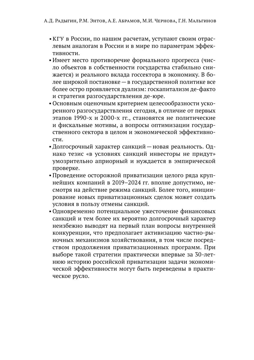 Авторы на основе краткого исторического экскурса анализируют современные приоритеты российской приватизации. В докладе оцениваются размер государственного сектора экономики и целесообразность приватизации некоторых крупных российских компаний с государственным участием в условиях санкций. Показано, что сводные финансовые характеристики компаний с госучастием, как правило, хуже показателей частных компаний и зарубежных конкурентов, а совокупный доход по акциям первых меньше минимальной рыночной доходности по акциям. Эмпирическая часть доклада подготовлена по материалам выборки из 265 крупнейших частных и государственных российских компаний, по которым доступна публичная финансовая отчетность. Ключевые слова: приватизация, государственная собственность, компании с государственным участием, программа приватизации, санкции. JEL: B20, D20, D60, G38, H82, H83, K40, L30, P20.