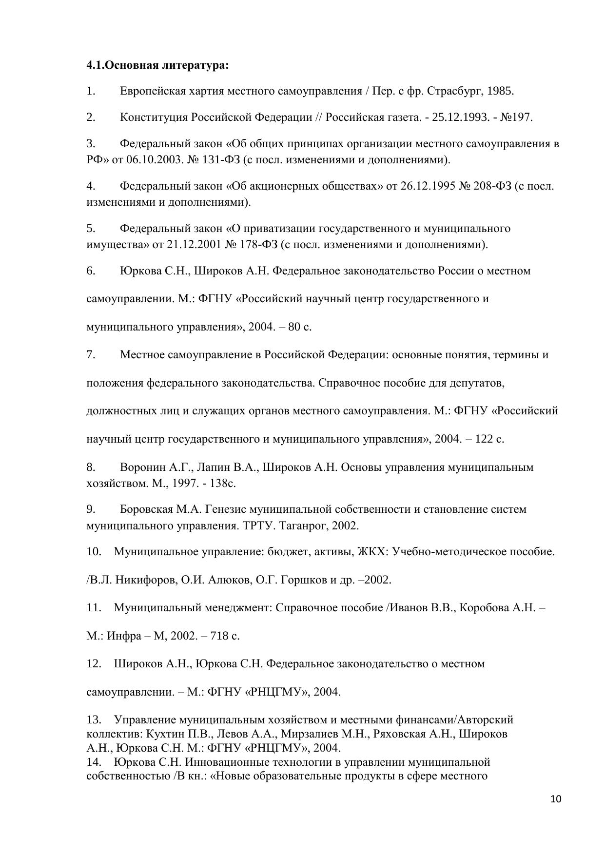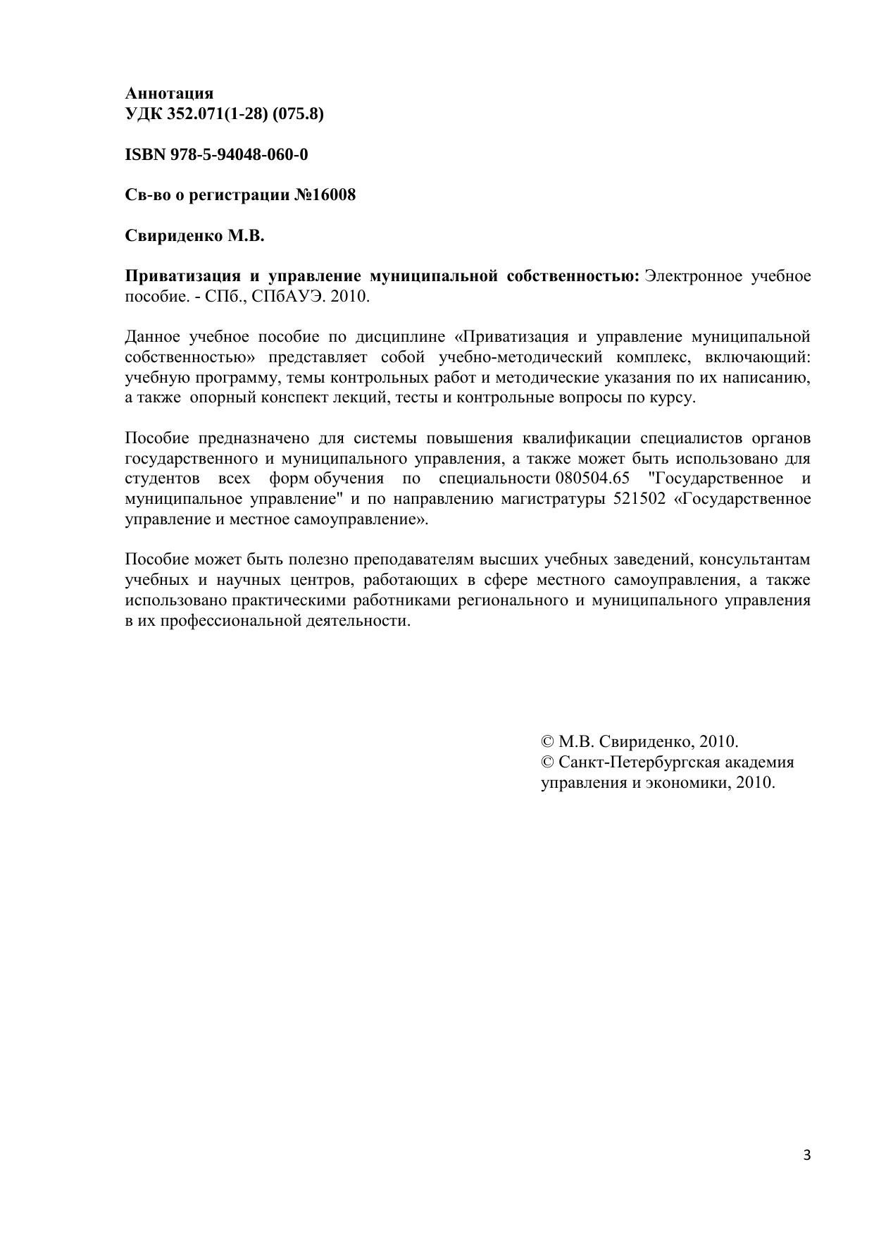 Данное учебное пособие по дисциплине «Приватизация и управление муниципальной собственностью» представляет собой учебно-методический комплекс, включающий: учебную программу, темы контрольных работ и методические указания по их написанию, а также опорный конспект лекций, тесты и контрольные вопросы по курсу. Пособие предназначено для системы повышения квалификации специалистов органов государственного и муниципального управления, а также может быть использовано для студентов всех форм обучения по специальности 080504.65 "Государственное и муниципальное управление" и по направлению магистратуры 521502 «Государственное управление и местное самоуправление». Пособие может быть полезно преподавателям высших учебных заведений, консультантам учебных и научных центров, работающих в сфере местного самоуправления, а также использовано практическими работниками регионального и муниципального управления в их профессиональной деятельности. Электронное учебное пособие для дистанционного обучения