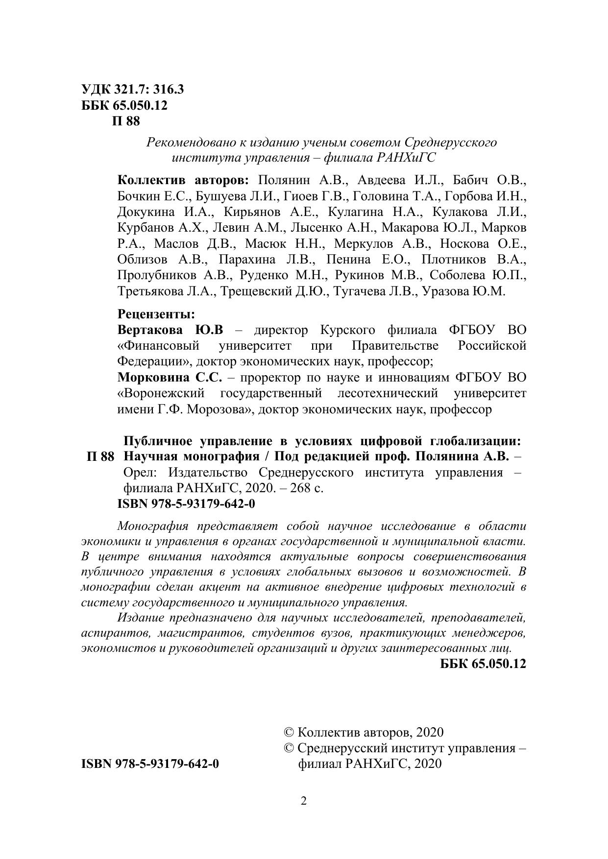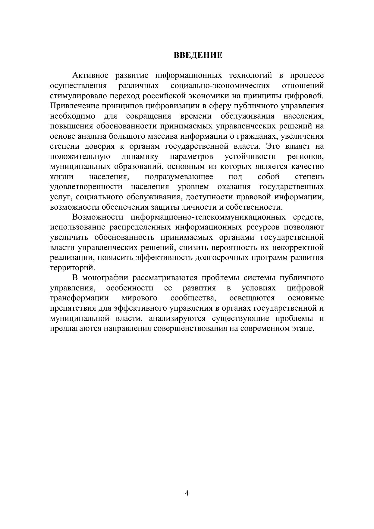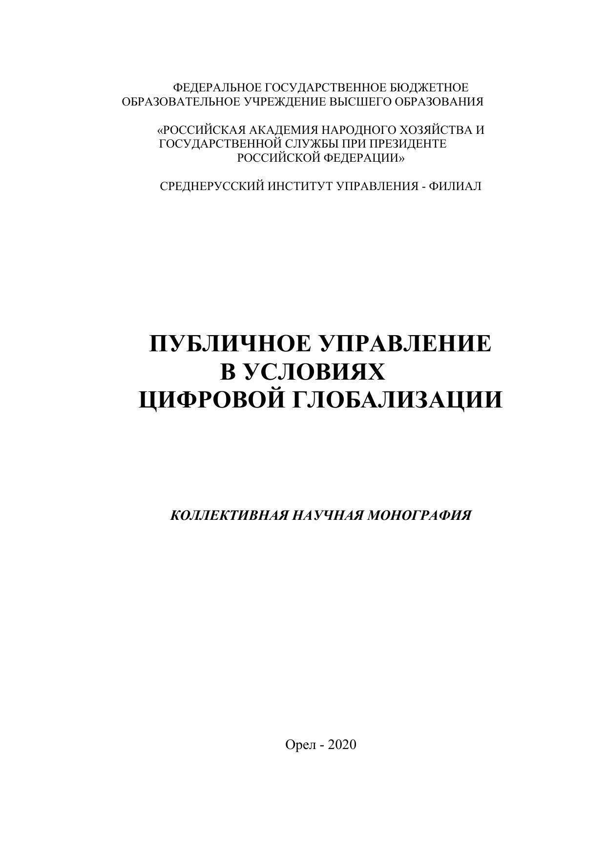 Монография представляет собой научное исследование в области экономики и управления в органах государственной и муниципальной власти. В центре внимания находятся актуальные вопросы совершенствования публичного управления в условиях глобальных вызовов и возможностей. В монографии сделан акцент на активное внедрение цифровых технологий в систему государственного и муниципального управления. Издание предназначено для научных исследователей, преподавателей, аспирантов, магистрантов, студентов вузов, практикующих менеджеров, экономистов и руководителей организаций и других заинтересованных лиц.