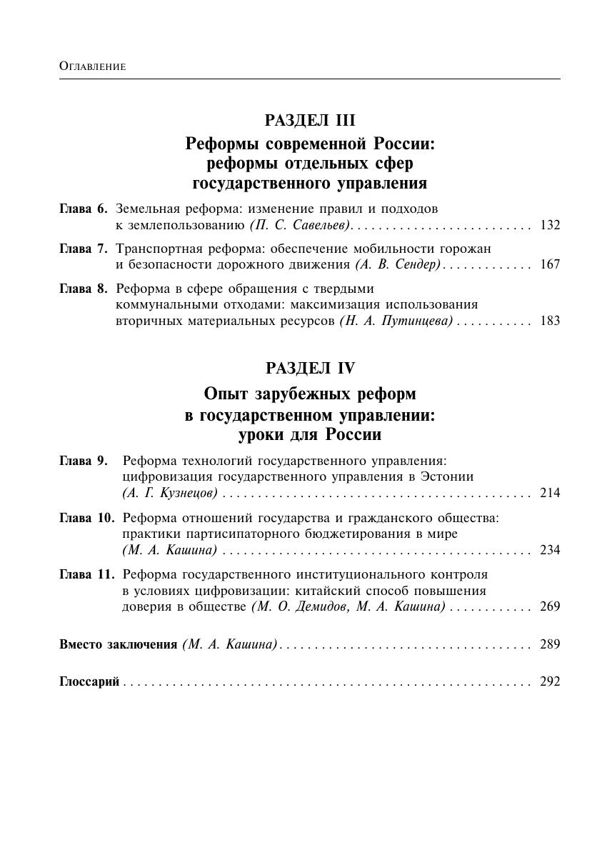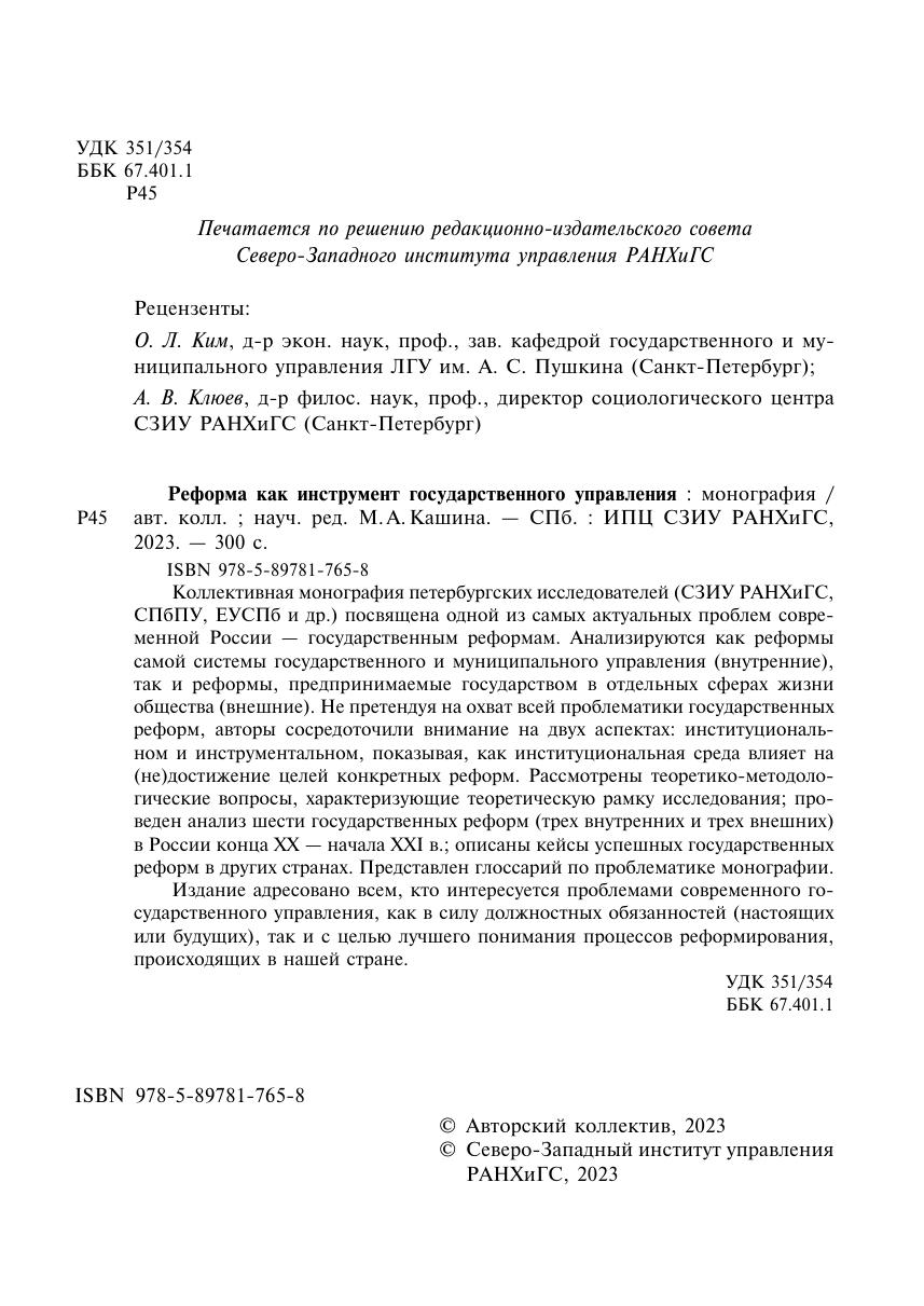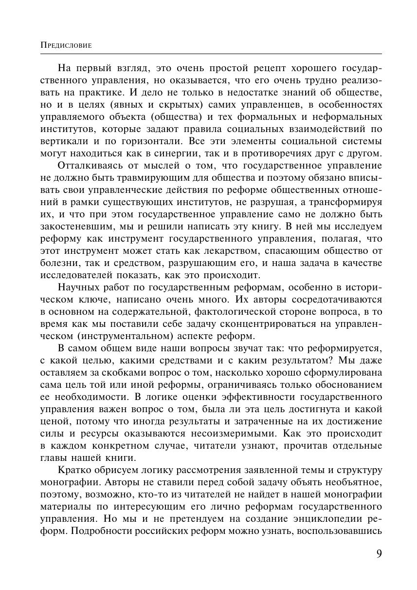 Коллективная монография петербургских исследователей (СЗИУ РАНХиГС, СПбПУ, ЕУСПб и др.) посвящена одной из самых актуальных проблем современной России — государственным реформам. Анализируются как реформы самой системы государственного и муниципального управления (внутренние), так и реформы, предпринимаемые государством в отдельных сферах жизни общества (внешние). Не претендуя на охват всей проблематики государственных реформ, авторы сосредоточили внимание на двух аспектах: институциональном и инструментальном, показывая, как институциональная среда влияет на (не)достижение целей конкретных реформ. Рассмотрены теоретико-методологические вопросы, характеризующие теоретическую рамку исследования; проведен анализ шести государственных реформ (трех внутренних и трех внешних) в России конца XX — начала XXI в.; описаны кейсы успешных государственных реформ в других странах. Представлен глоссарий по проблематике монографии. Издание адресовано всем, кто интересуется проблемами современного государственного управления, как в силу должностных обязанностей (настоящих или будущих), так и с целью лучшего понимания процессов реформирования, происходящих в нашей стране.