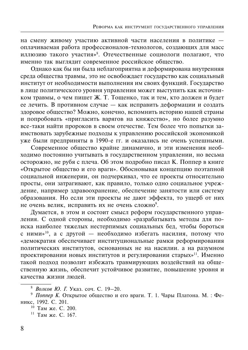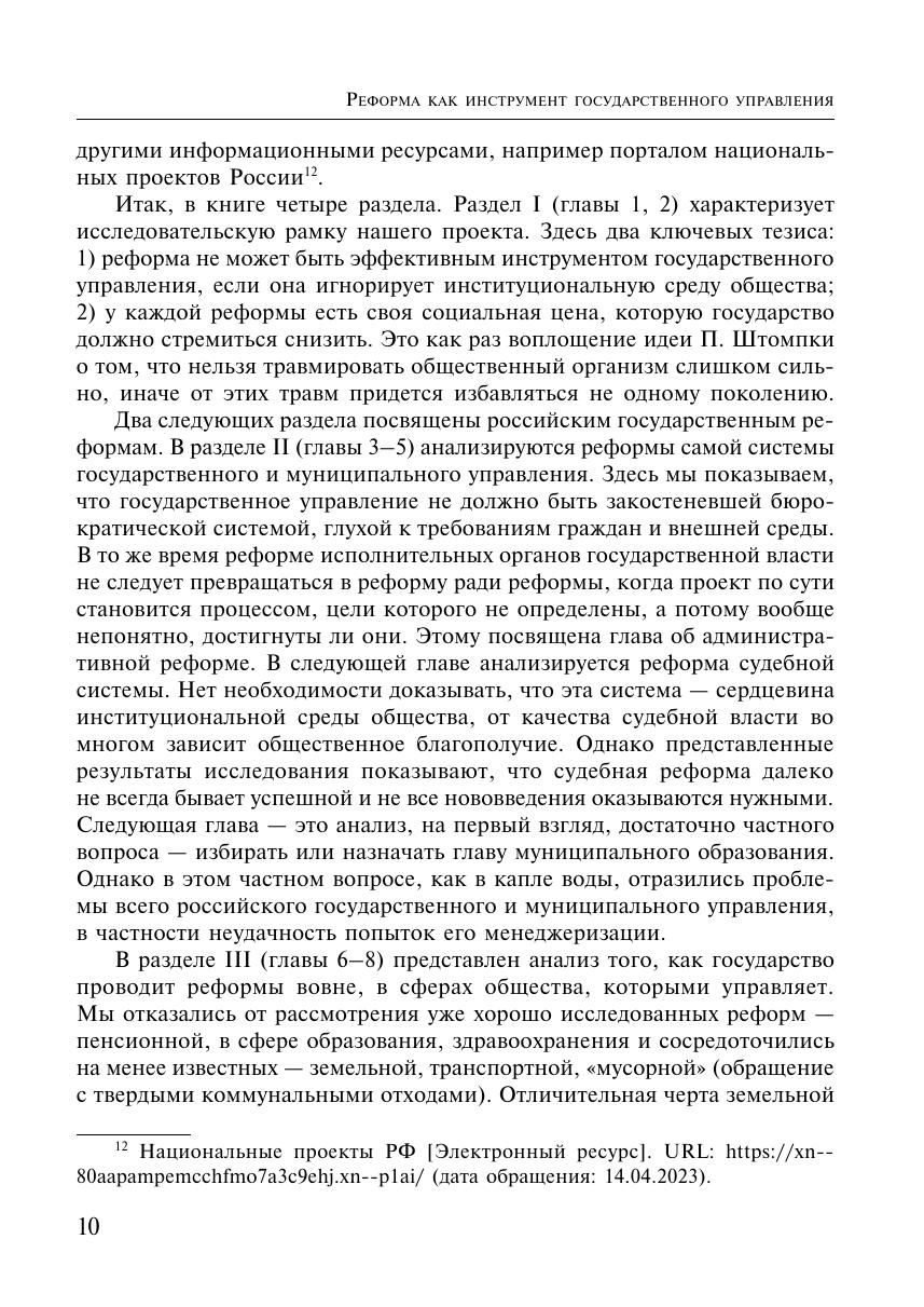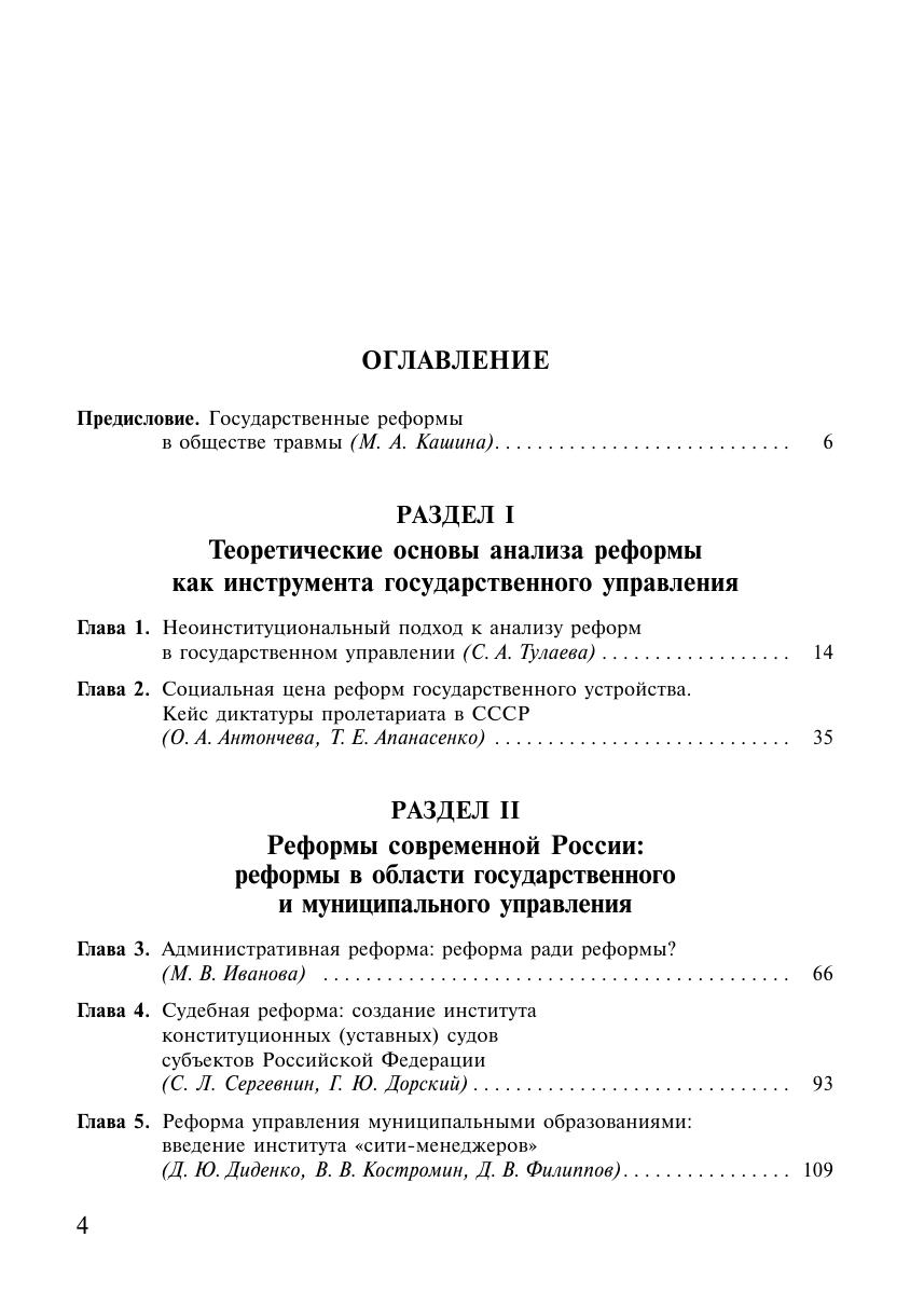 Коллективная монография петербургских исследователей (СЗИУ РАНХиГС, СПбПУ, ЕУСПб и др.) посвящена одной из самых актуальных проблем современной России — государственным реформам. Анализируются как реформы самой системы государственного и муниципального управления (внутренние), так и реформы, предпринимаемые государством в отдельных сферах жизни общества (внешние). Не претендуя на охват всей проблематики государственных реформ, авторы сосредоточили внимание на двух аспектах: институциональном и инструментальном, показывая, как институциональная среда влияет на (не)достижение целей конкретных реформ. Рассмотрены теоретико-методологические вопросы, характеризующие теоретическую рамку исследования; проведен анализ шести государственных реформ (трех внутренних и трех внешних) в России конца XX — начала XXI в.; описаны кейсы успешных государственных реформ в других странах. Представлен глоссарий по проблематике монографии. Издание адресовано всем, кто интересуется проблемами современного государственного управления, как в силу должностных обязанностей (настоящих или будущих), так и с целью лучшего понимания процессов реформирования, происходящих в нашей стране.