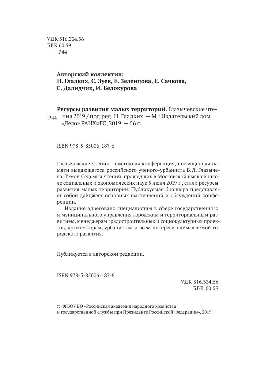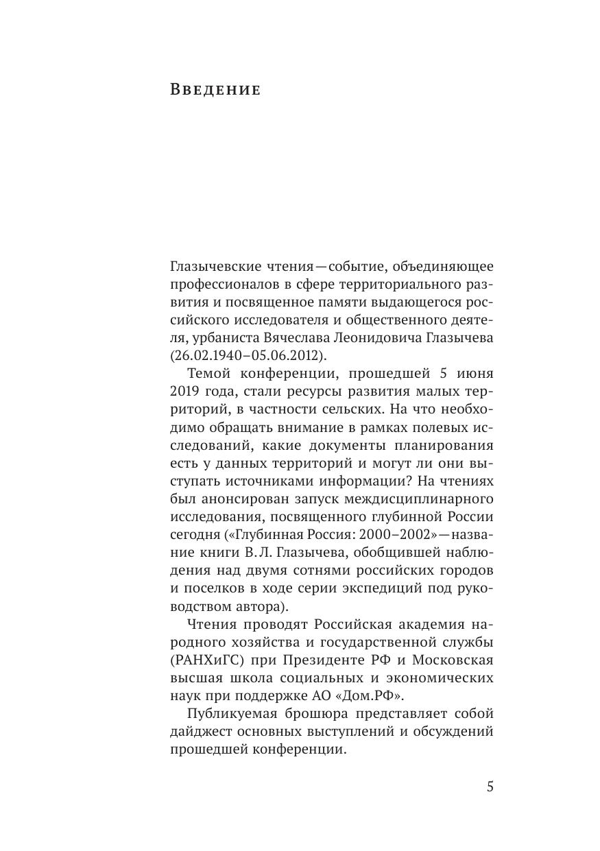 Глазычевские чтения — ежегодная конференция, посвященная памяти выдающегося российского ученого-урбаниста В. Л. Глазычева. Темой Седьмых чтений, прошедших в Московской высшей школе социальных и экономических наук 5 июня 2019 г., стали ресурсы развития малых территорий. Публикуемая брошюра представляет собой дайджест основных выступлений и обсуждений конференции. Издание адресовано специалистам в сфере государственного и муниципального управления городским и территориальным развитием, менеджерам градостроительных и социокультурных проектов, архитекторам, урбанистам и всем интересующимся темой городского развития.