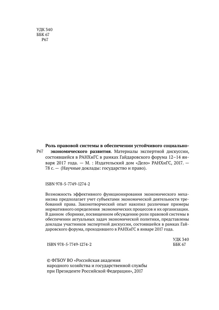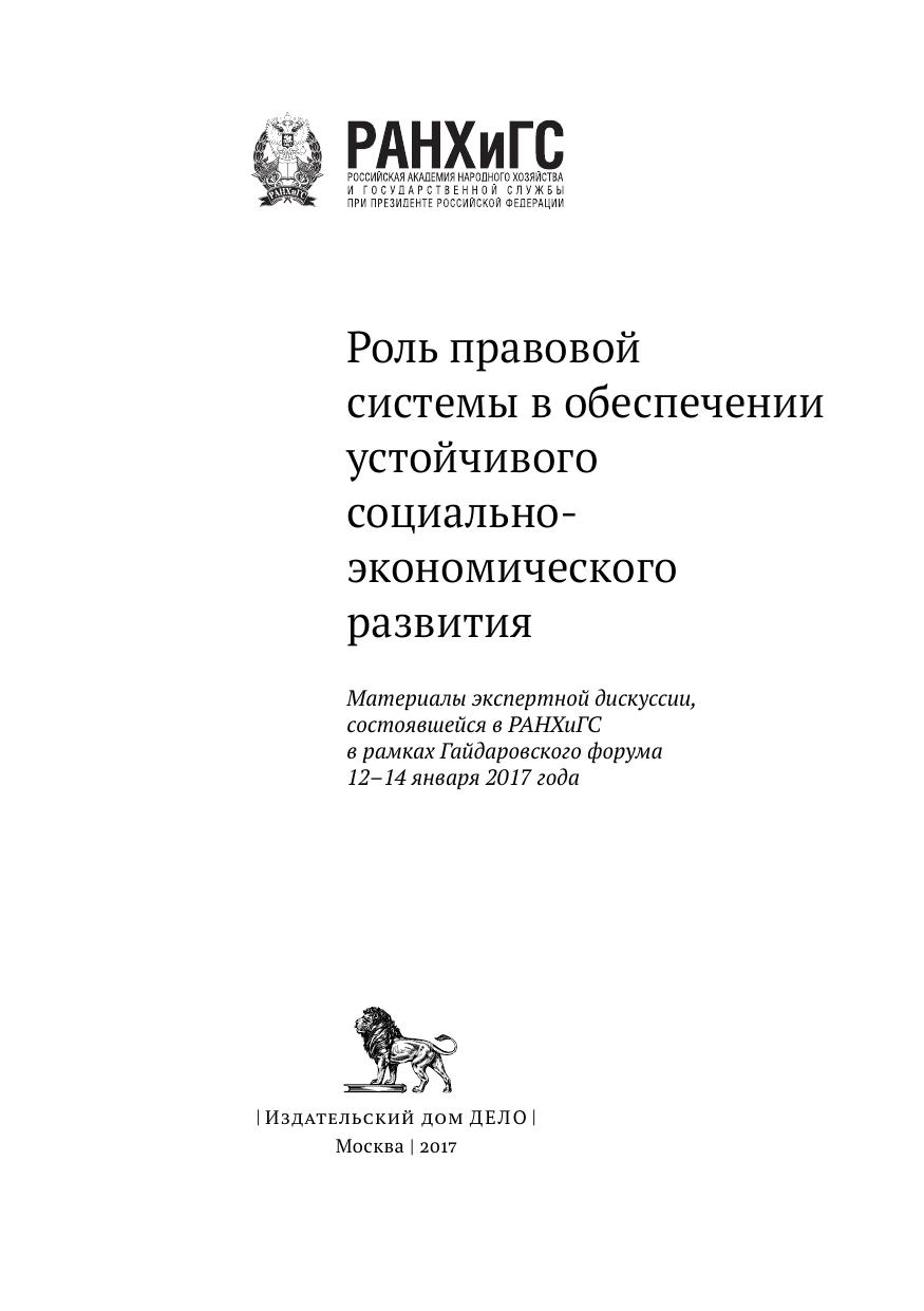 Роль правовой системы в обеспечении устойчивого социально-экономического развития. Материалы экспертной дискуссии, состоявшейся в РАНХиГС в рамках Гайдаровского форума 12–14 января 2017 года