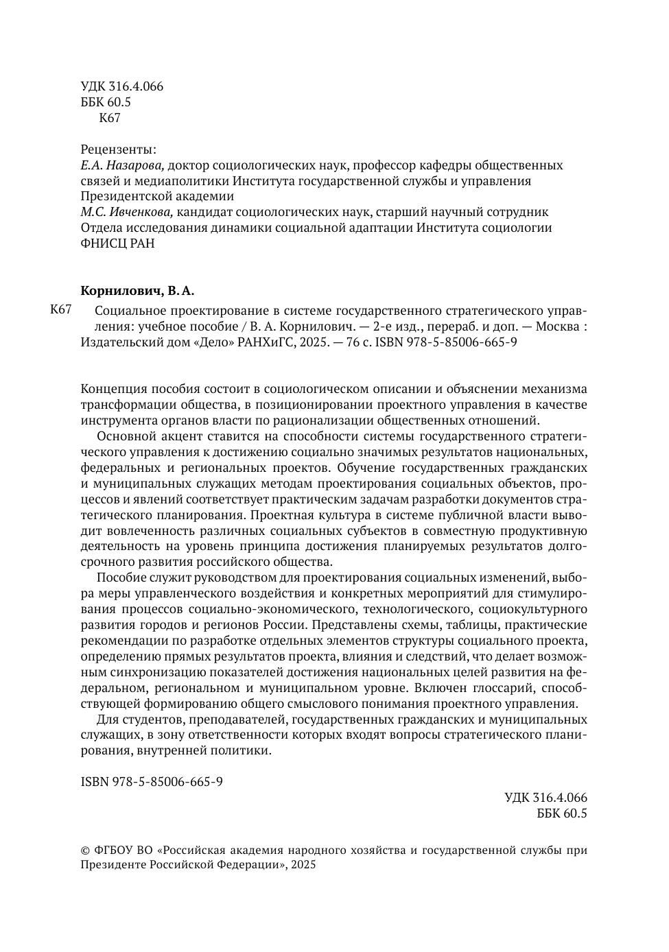 Основной акцент ставится на способности системы государственного стратегического управления к достижению социально значимых результатов национальных, федеральных и региональных проектов. Обучение государственных гражданских и муниципальных служащих методам проектирования социальных объектов, процессов и явлений соответствует практическим задачам разработки документов стратегического планирования. Проектная культура в системе публичной власти выводит вовлеченность различных социальных субъектов в совместную продуктивную деятельность на уровень принципа достижения планируемых результатов долгосрочного развития российского общества. Пособие служит руководством для проектирования социальных изменений, выбора меры управленческого воздействия и конкретных мероприятий для стимулирования процессов социально- экономического, технологического, социокультурного развития городов и регионов России. Представлены схемы, таблицы, практические рекомендации по разработке отдельных элементов структуры социального проекта, определению прямых результатов проекта, влияния и следствий, что делает возможным синхронизацию показателей достижения национальных целей развития на федеральном, региональном и муниципальном уровне. Включен глоссарий, способствующей формированию общего смыслового понимания проектного управления. Для студентов, преподавателей, государственных гражданских и муниципальных служащих, в зону ответственности которых входят вопросы стратегического планирования, внутренней политики.