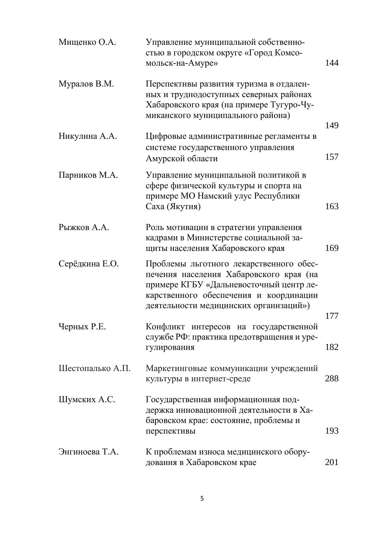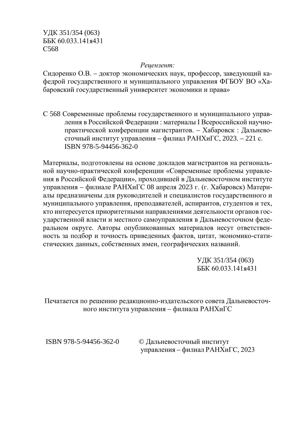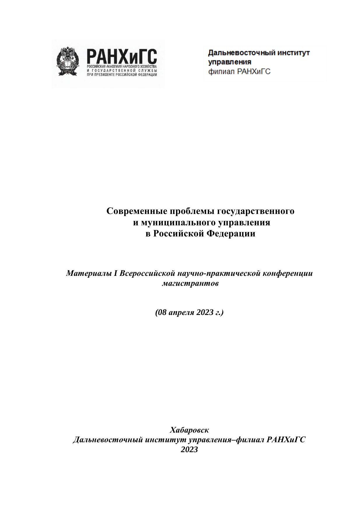 Материалы, подготовлены на основе докладов магистрантов на региональ-ной научно-практической конференции «Современные проблемы управле-ния в Российской Федерации», проходившей в Дальневосточном институте управления – филиале РАНХиГС 08 апреля 2023 г. (г. Хабаровск) Матери-алы предназначены для руководителей и специалистов государственного и муниципального управления, преподавателей, аспирантов, студентов и тех, кто интересуется приоритетными направлениями деятельности органов гос-ударственной власти и местного самоуправления в Дальневосточном феде-ральном округе. Авторы опубликованных материалов несут ответствен-ность за подбор и точность приведенных фактов, цитат, экономико-стати-стических данных, собственных имен, географических названий.