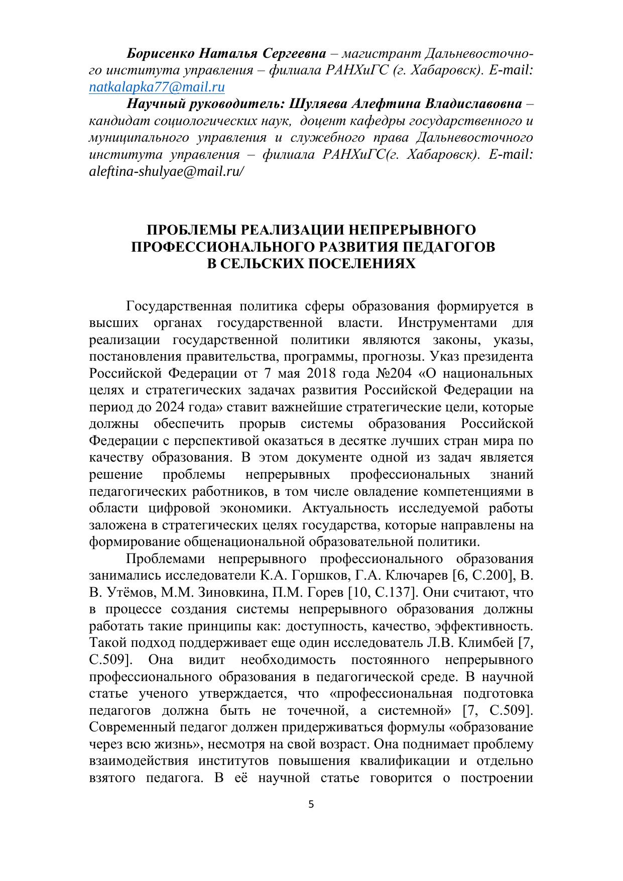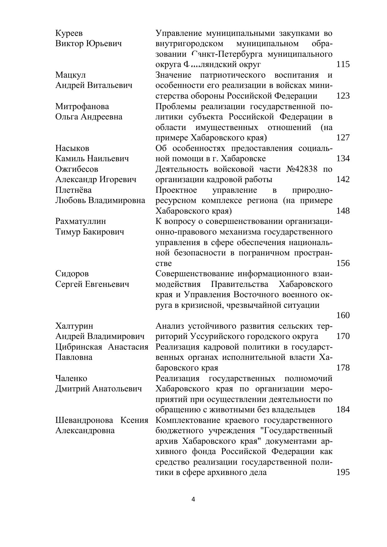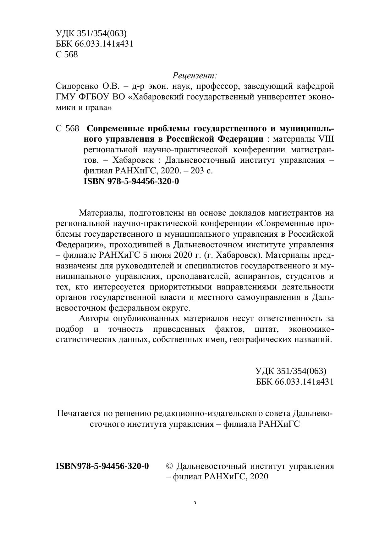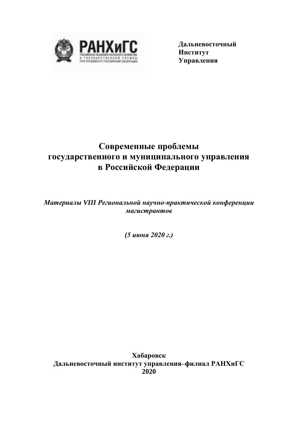 Материалы, подготовлены на основе докладов магистрантов на региональной научно-практической конференции «Современные проблемы государственного и муниципального управления в Российской Федерации», проходившей в Дальневосточном институте управления – филиале РАНХиГС 5 июня 2020 г. (г. Хабаровск). Материалы предназначены для руководителей и специалистов государственного и муниципального управления, преподавателей, аспирантов, студентов и тех, кто интересуется приоритетными направлениями деятельности органов государственной власти и местного самоуправления в Дальневосточном федеральном округе. Авторы опубликованных материалов несут ответственность за подбор и точность приведенных фактов, цитат, экономикостатистических данных, собственных имен, географических названий.