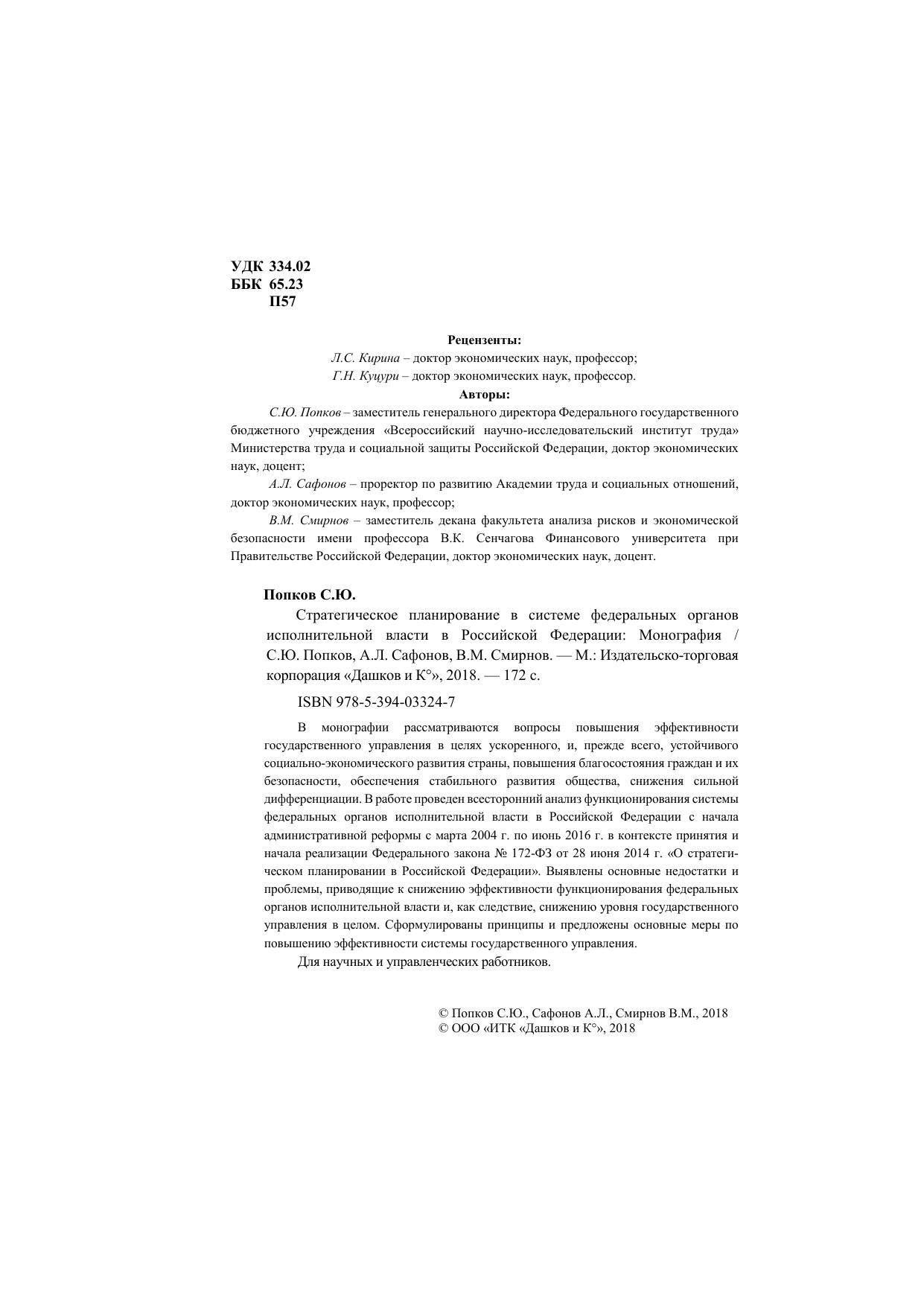 В монографии рассматриваются вопросы повышения эффективности государственного управления в целях ускоренного, и, прежде всего, устойчивого социально-экономического развития страны, повышения благосостояния граждан и их безопсности, обеспечения стабильного развития общества, снижения сильной дифференциации. В работе проведен всесторонний анализ функционирования системы федеральных органов исполнительной власти в Российской Федерации с начала административной реформы с марта 2004 г. по июнь 2016 г. в контексте приятия и начала реаклизации Федерального закона № 172-ФЗ от 28.06.2014. "О стратегическом планировании в Российской Федерации". Выявлены основные недостатки и проблемы, приводящие к снижению эффективности функционирования федеральных органов исполнительной власти и, как следствие, снижению уровня государственного управления в целом. Сформулированы принципы и предложены основные меры по повышению эффективности системы государственного управления. Для научных и управленческих работников.