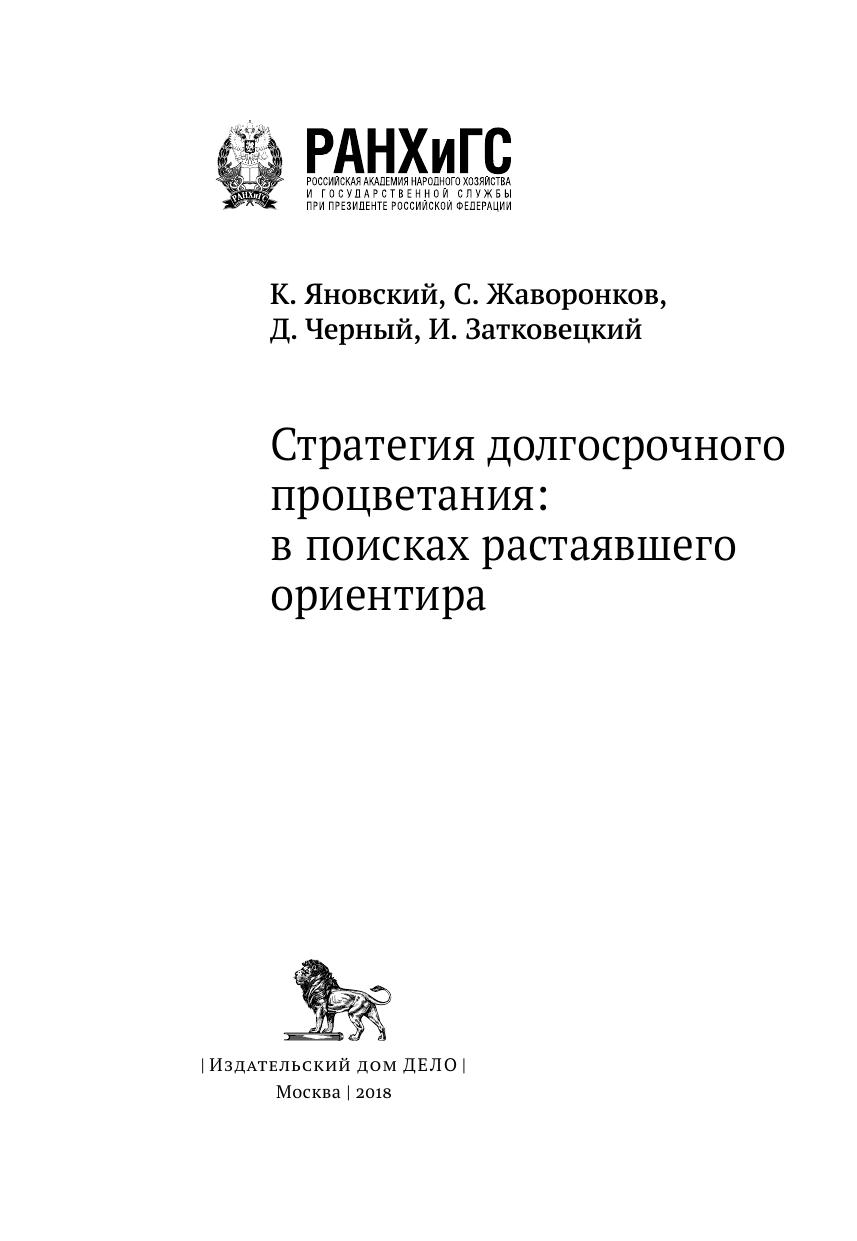 Книга «Стратегия долгосрочного процветания: в поисках растаявшего ориентира» является продолжением и дополнением работы «Институциональные ограничения современного экономического роста», вышедшей в 2011 году в издательстве «Дело». Она продолжает попытки авторов собрать примеры наилучших законов и практик для решения экономических, политических и моральных проблем, связанных с возрождением Большого государства и все менее жестко ограниченного в полномочиях правительства в старых демократиях и в остальном мире. Особое внимание уделяется возможностям общества снова взять на себя выполнение функций образования, здравоохранения, помощи бедным (поставки «смешанных общественных благ»). Отдельно рассматриваются политические препятствия на пути предлагаемых реформ и меры на переходный период.