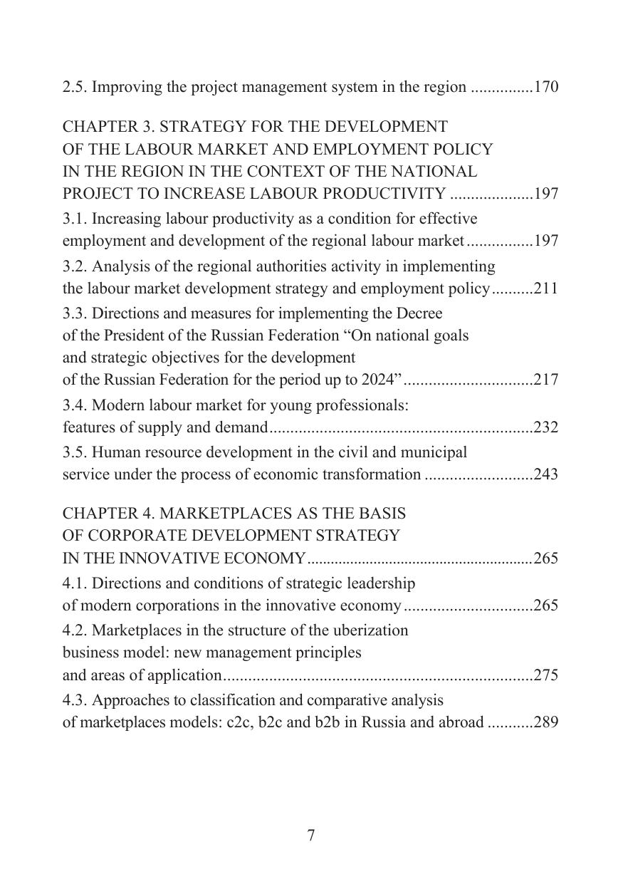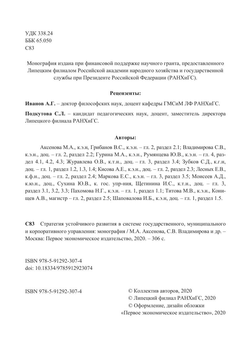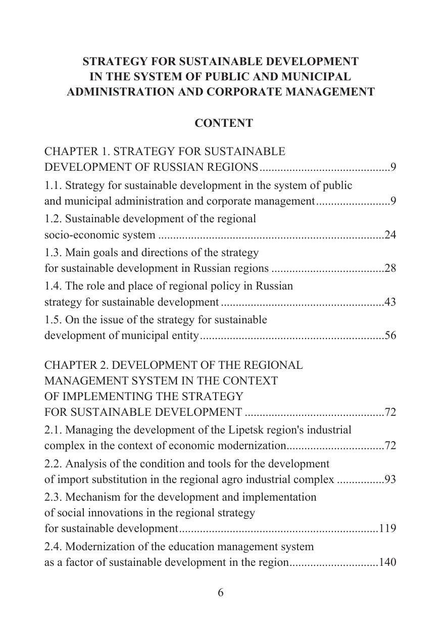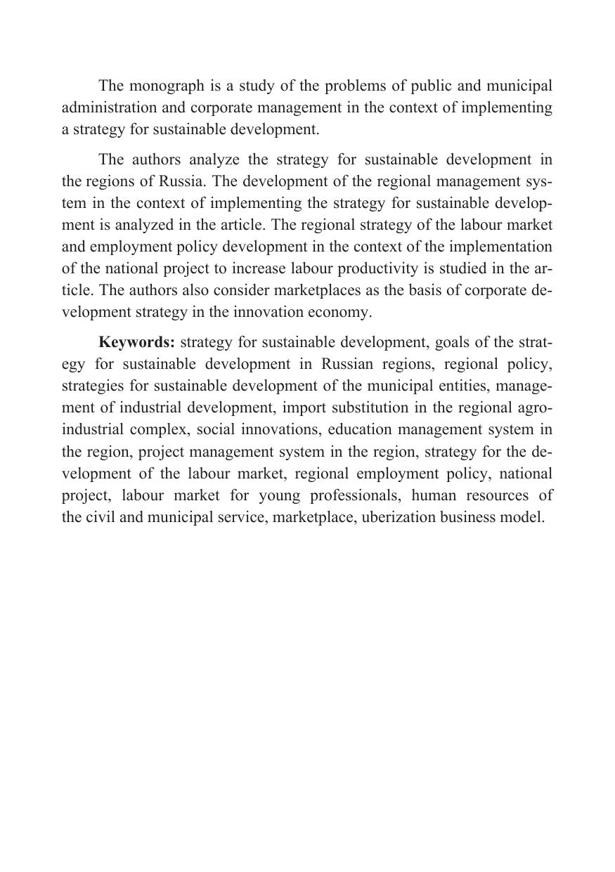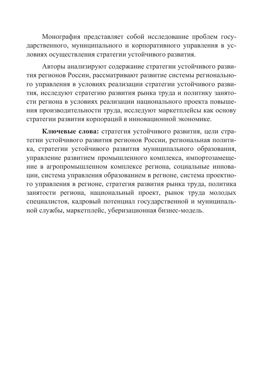 Монография представляет собой исследование проблем государственного, муниципального и корпоративного управления в условиях осуществления стратегии устойчивого развития. Авторы анализируют содержание стратегии устойчивого развития регионов России, рассматривают развитие системы регионального управления в условиях реализации стратегии устойчивого развития, исследуют стратегию развития рынка труда и политику занятости региона в условиях реализации национального проекта повышения производительности труда, исследуют маркетплейсы как основу стратегии развития корпораций в инновационной экономике.