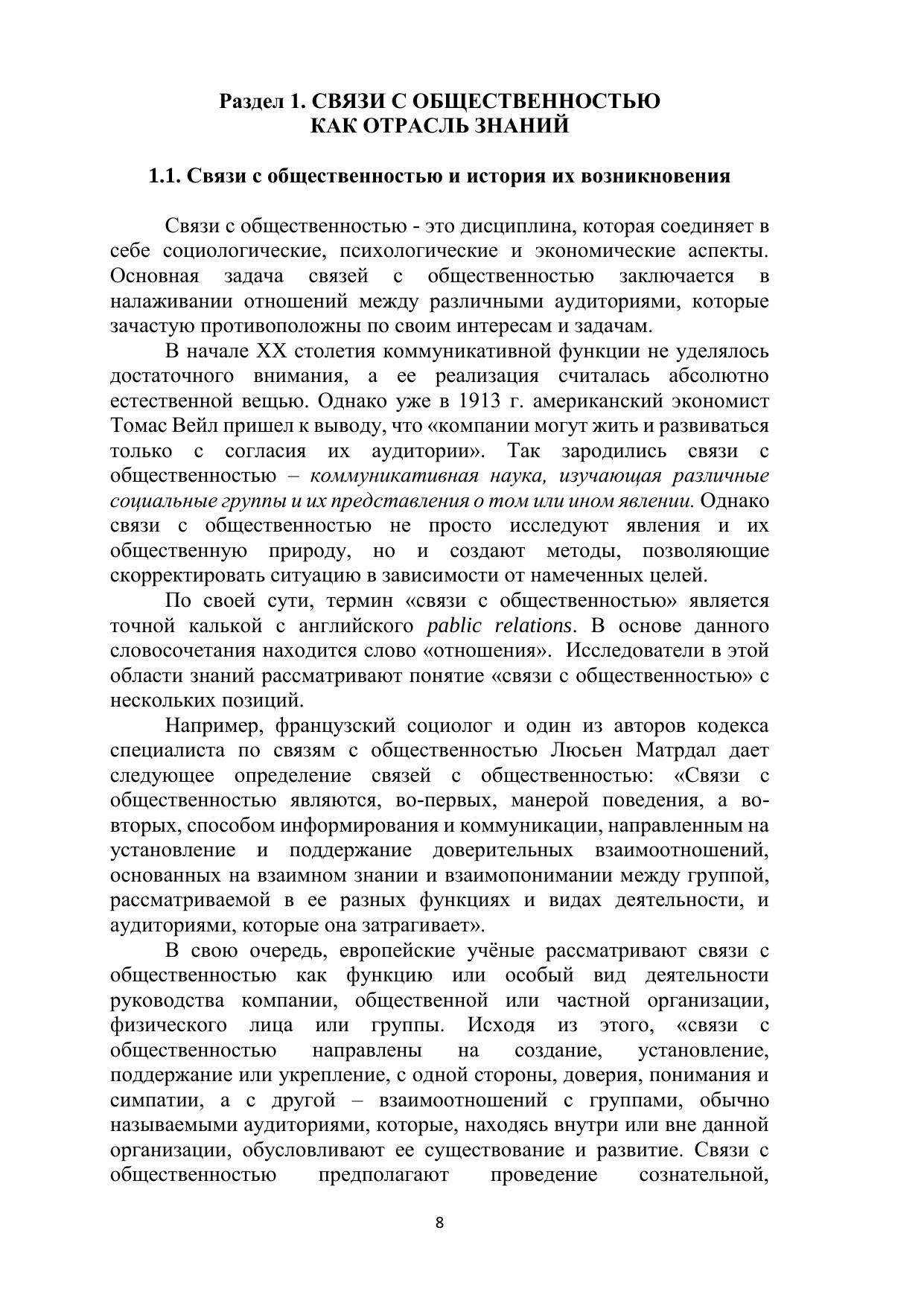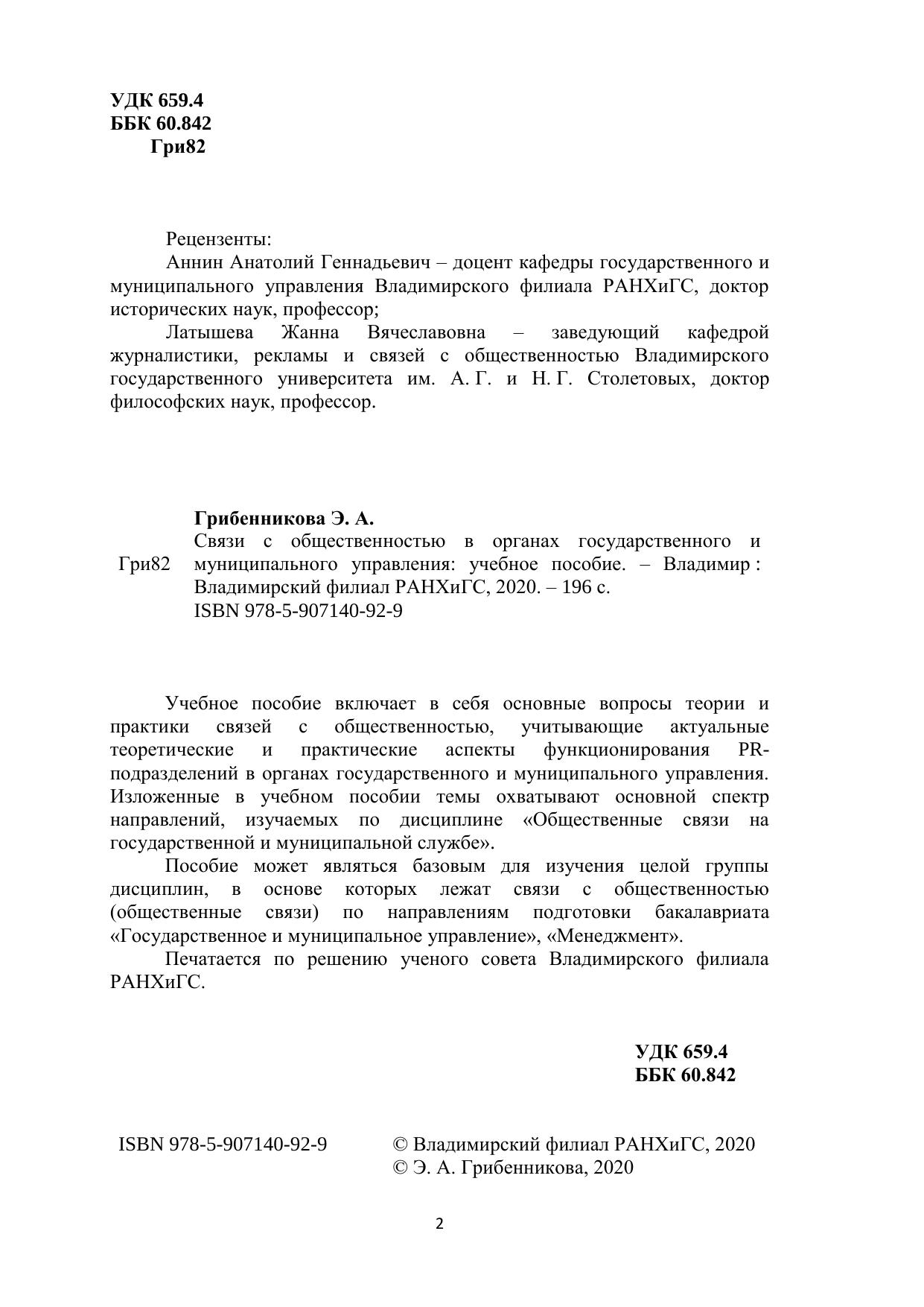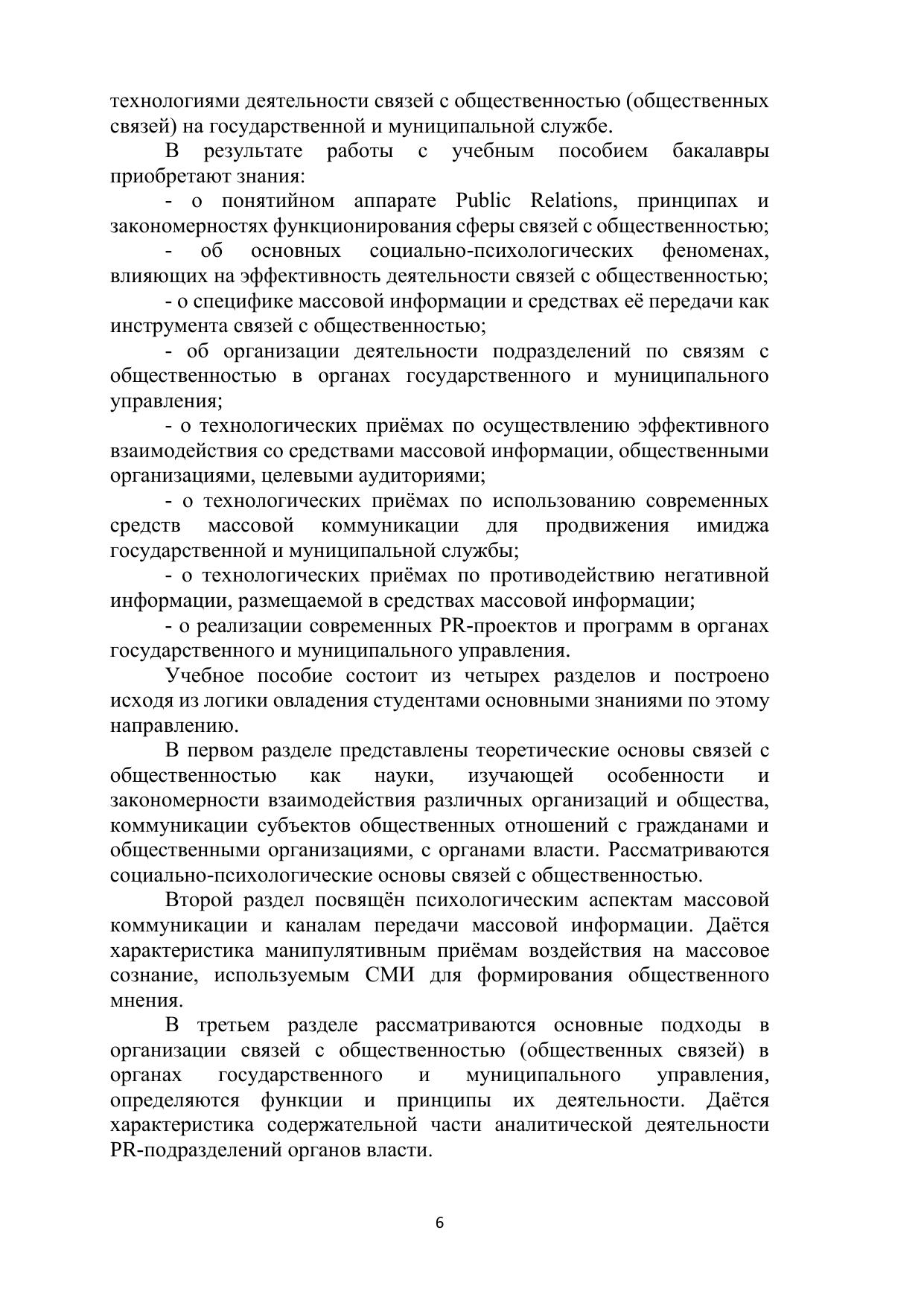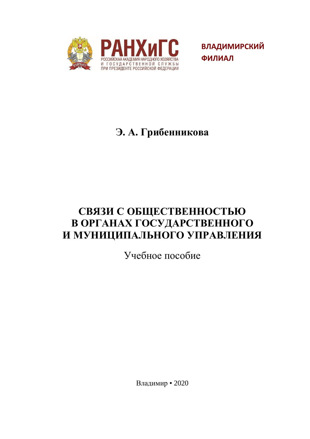 Учебное пособие включает в себя основные вопросы теории и практики связей с общественностью, учитывающие актуальные теоретические и практические аспекты функционирования PR-подразделений в органах государственного и муниципального управления. Изложенные в учебном пособии темы охватывают основной спектр направлений, изучаемых по дисциплине «Общественные связи на государственной и муниципальной службе». Пособие может являться базовым для изучения целой группы дисциплин, в основе которых лежат связи с общественностью (общественные связи) по направлениям подготовки бакалавриата «Государственное и муниципальное управление», «Менеджмент». Печатается по решению ученого совета Владимирского филиала РАНХиГС.