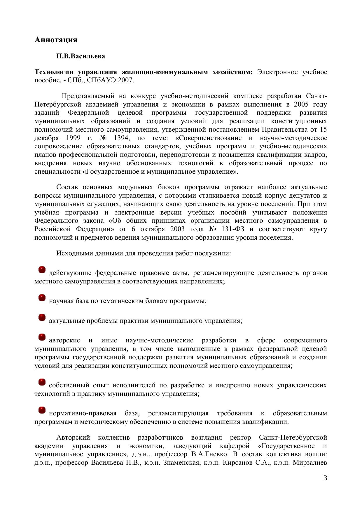 Представляемый на конкурс учебно-методический комплекс разработан Санкт-Петербургской академией управления и экономики в рамках выполнения в 2005 году заданий Федеральной целевой программы государственной поддержки развития муниципальных образований и создания условий для реализации конституционных полномочий местного самоуправления, утвержденной постановлением Правительства от 15 декабря 1999 г. № 1394, по теме: «Совершенствование и научно-методическое сопровождение образовательных стандартов, учебных программ и учебно-методических планов профессиональной подготовки, переподготовки и повышения квалификации кадров, внедрения новых научно обоснованных технологий в образовательный процесс по специальности «Государственное и муниципальное управление». Электронное учебное пособие для дистанционного обучения