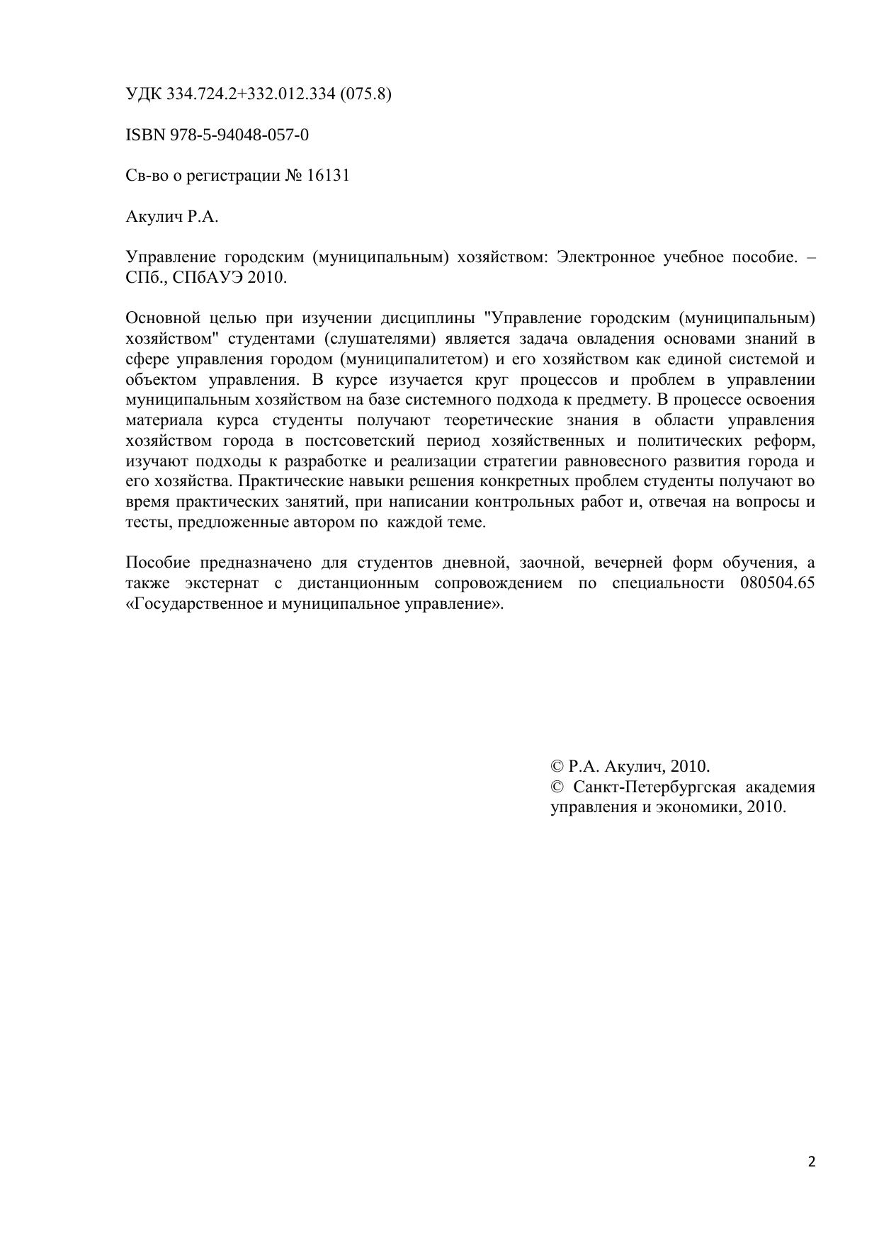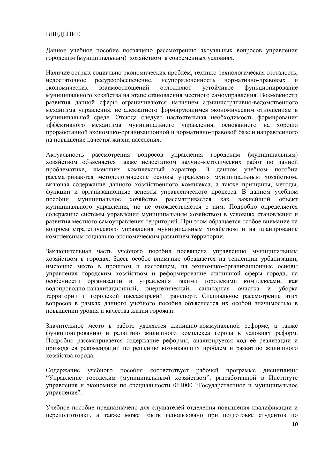 Основной целью при изучении дисциплины "Управление городским (муниципальным) хозяйством" студентами (слушателями) является задача овладения основами знаний в сфере управления городом (муниципалитетом) и его хозяйством как единой системой и объектом управления. В курсе изучается круг процессов и проблем в управлении муниципальным хозяйством на базе системного подхода к предмету. В процессе освоения материала курса студенты получают теоретические знания в области управления хозяйством города в постсоветский период хозяйственных и политических реформ, изучают подходы к разработке и реализации стратегии равновесного развития города и его хозяйства. Практические навыки решения конкретных проблем студенты получают во время практических занятий, при написании контрольных работ и, отвечая на вопросы и тесты, предложенные автором по каждой теме. Пособие предназначено для студентов дневной, заочной, вечерней форм обучения, а также экстернат с дистанционным сопровождением по специальности 080504.65 «Государственное и муниципальное управление». Электронное учебное пособие