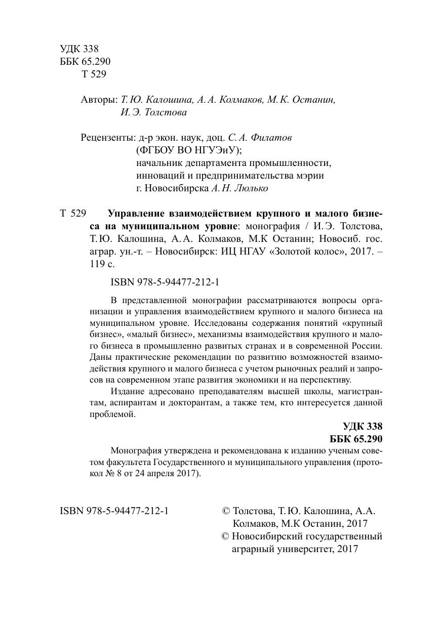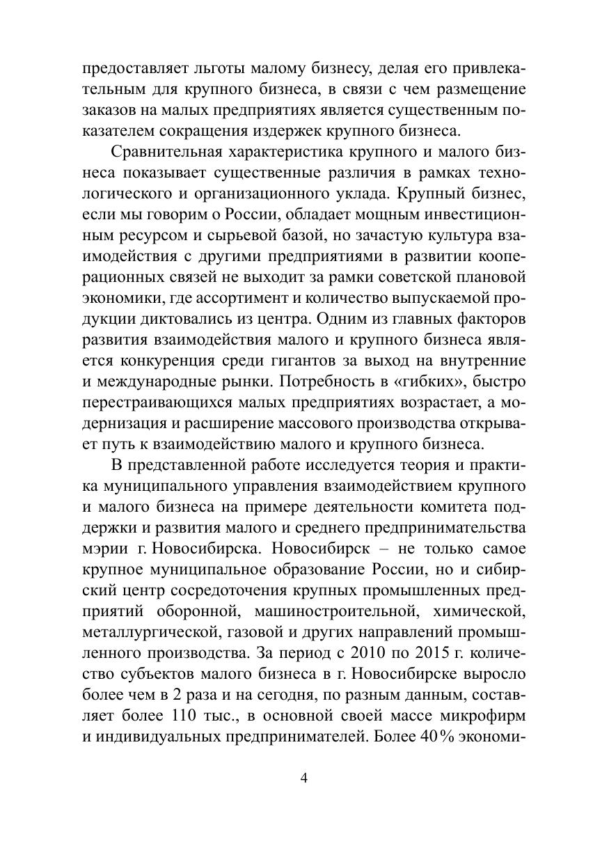 В представленной монографии рассматриваются вопросы организации и управления взаимодействием крупного и малого бизнеса на муниципальном уровне. Исследованы содержания понятий «крупный бизнес», «малый бизнес», механизмы взаимодействия крупного и мало- го бизнеса в промышленно развитых странах и в современной России. Даны практические рекомендации по развитию возможностей взаимодействия крупного и малого бизнеса с учетом рыночных реалий и запросов на современном этапе развития экономики и на перспективу. Издание адресовано преподавателям высшей школы, магистрантам, аспирантам и докторантам, а также тем, кто интересуется данной проблемой.