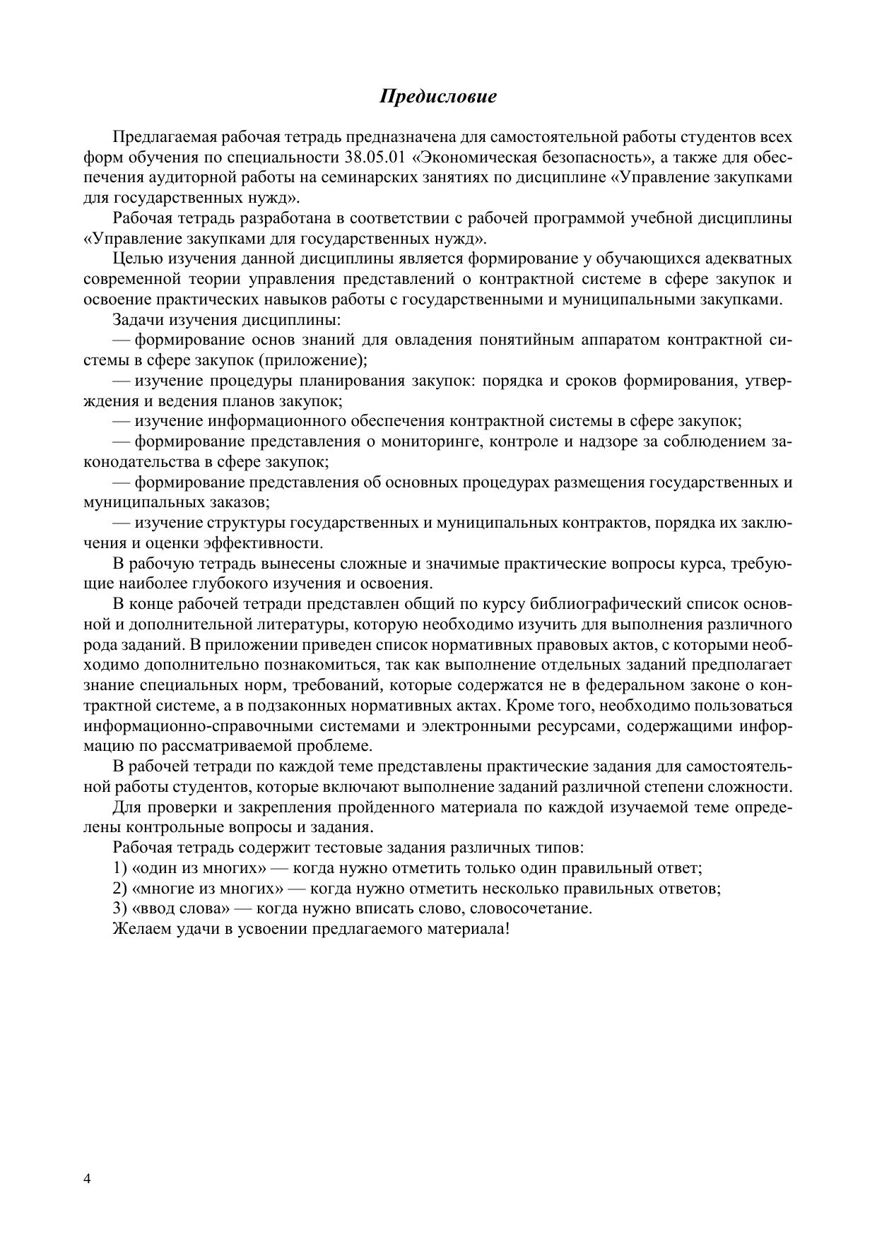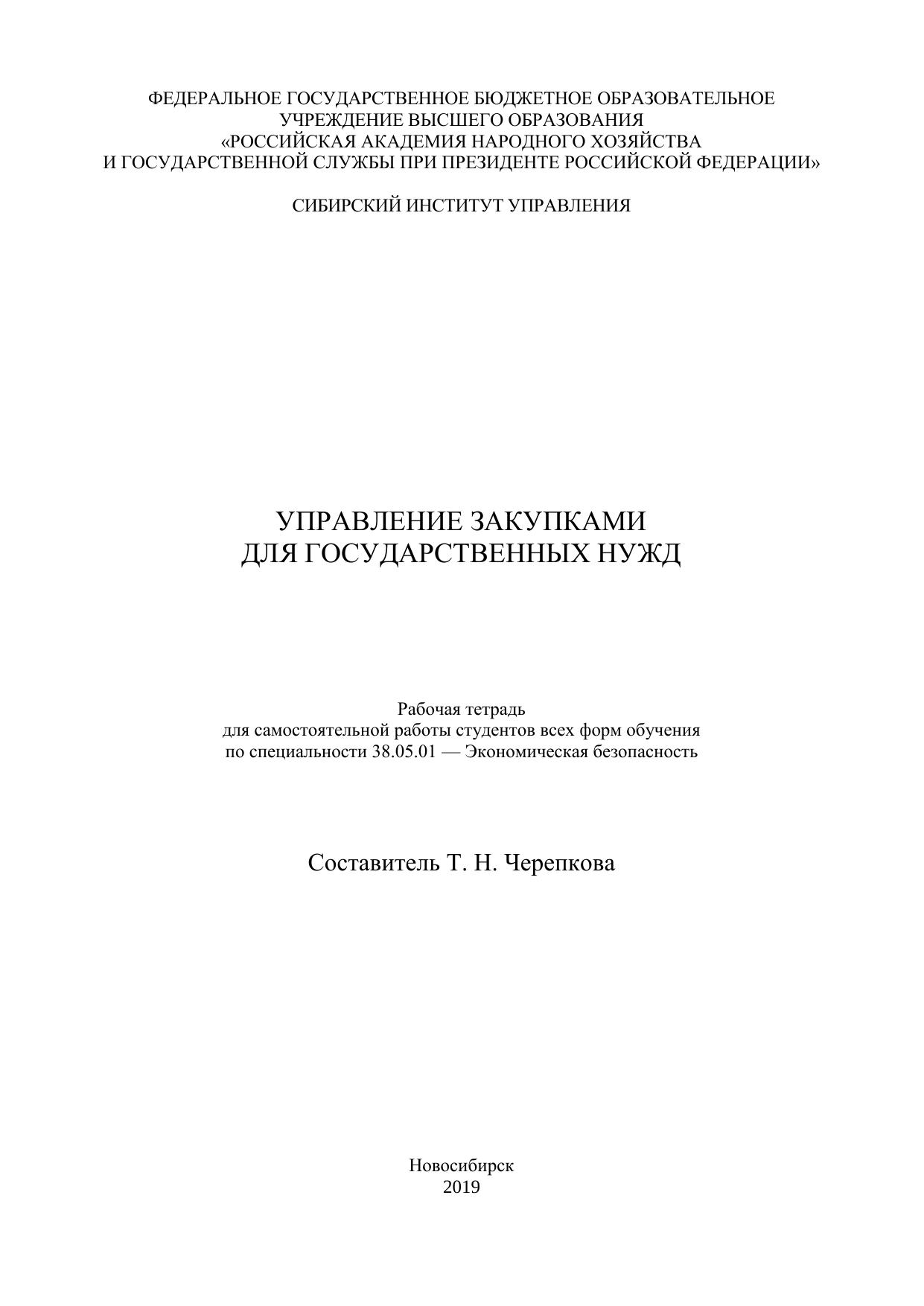 Данная рабочая тетрадь составлена для учебно-методического обеспечения учебной дисциплины «Управление закупками для государственных нужд» и отражает основные элементы учебной про-граммы. Изучение материалов и выполнение заданий рабочей тетради позволит сформировать пред-ставление о ключевых профессиональных компетенциях будущих специалистов в области экономиче-ской безопасности, занимающихся вопросами управления закупками для государственных нужд и кон-тролем за ними. Рабочая тетрадь предназначена для студентов всех форм обучения по специальности 38.05.01 — Экономическая безопасность.