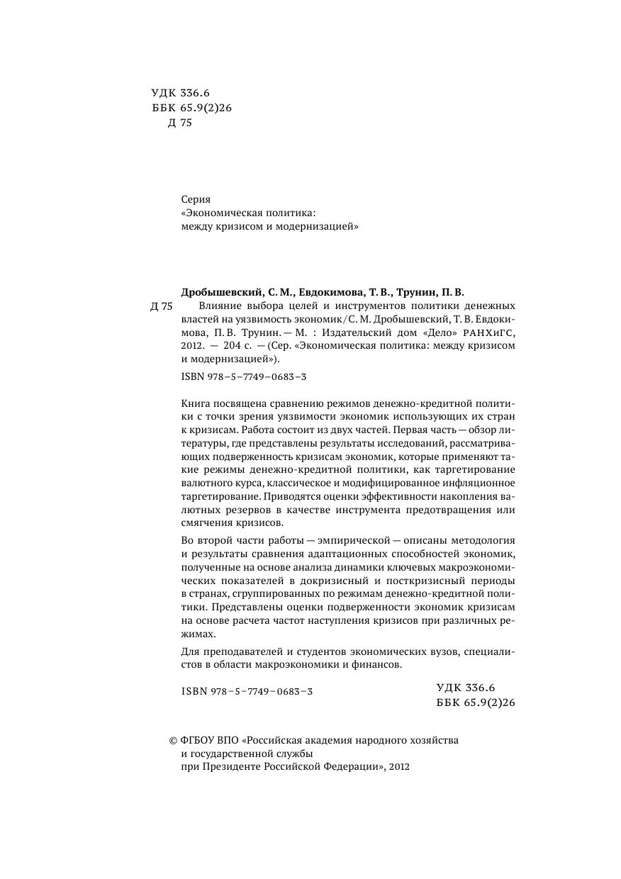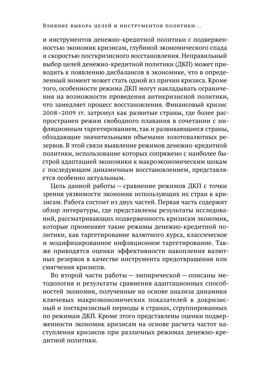 Экономическая политика: между кризисом и модернизацией. Книга посвящена сравнению режимов денежно-кредитной политики с точки зрения уязвимости экономик использующих их стран к кризисам. Работа состоит из двух частей. Первая часть — обзор литературы, где представлены результаты исследований, рассматривающих подверженность кризисам экономик, которые применяют такие режимы денежно-кредитной политики, как таргетирование валютного курса, классическое и модифицированное инфляционное таргетирование. Приводятся оценки эффективности накопления валютных резервов в качестве инструмента предотвращения или смягчения кризисов. Во второй части работы — эмпирической — описаны методология и результаты сравнения адаптационных способностей экономик, полученные на основе анализа динамики ключевых макроэкономических показателей в докризисный и посткризисный периоды в странах, сгруппированных по режимам денежно-кредитной политики. Представлены оценки подверженности экономик кризисам на основе расчета частот наступления кризисов при различных режимах. Для преподавателей и студентов экономических вузов, специалистов в области макроэкономики и финансов.