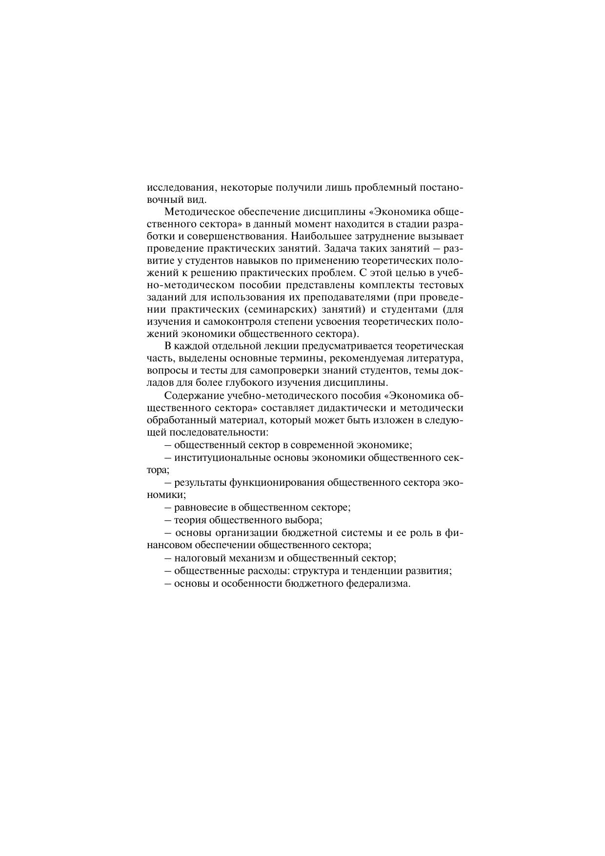 Дан базовый курс по экономике общественного сектора. Рассматриваются основные теоретические положения экономики общественного сектора: его место в современной экономике, провалы рынка и государства, важнейшие элементы институциональной структуры общественного сектора, общественные блага и основы ценообразования в общественном секторе, условия достижения равновесия спроса и предложения общественных благ, механизмы выявления индивидуальных предпочтений в общественных благах, роль бюджетной системы в финансировании предложения общественных благ, управление общественными доходами и общественными расходами с позиций экономической эффективности и социальной справедливости, особенности бюджетного федерализма. В пособие включены учебно-методические материалы – словарь основных понятий, список рекомендуемой литературы, вопросы для повторения, тестовые задания и ответы к ним. Для студентов бакалавриата и магистратуры, аспирантов, преподавателей, руководителей и специалистов государственного и муниципального аппарата управления.