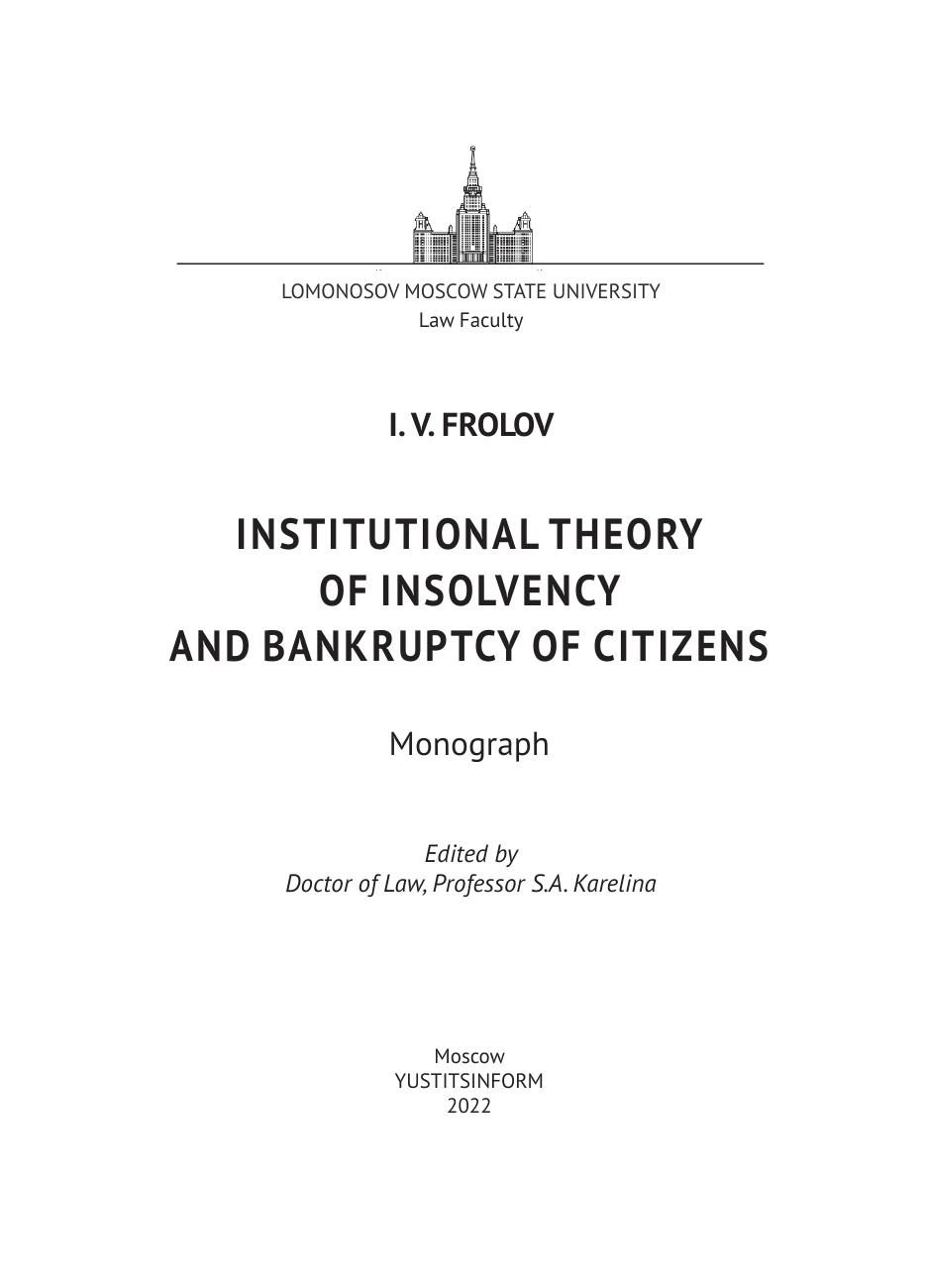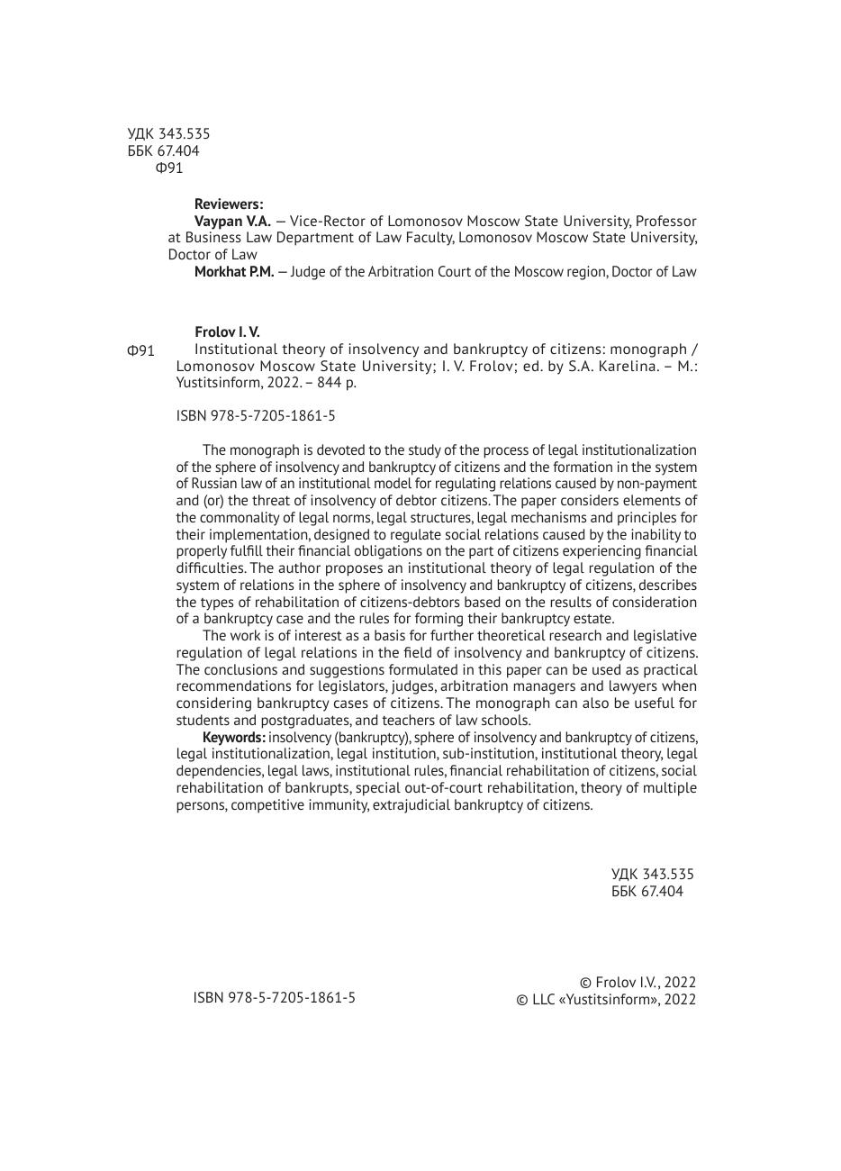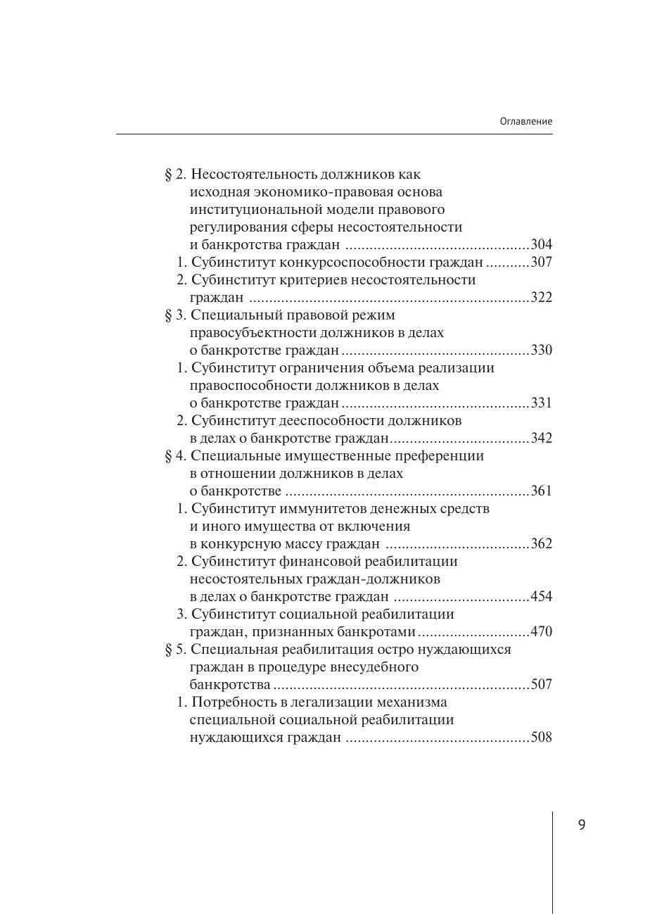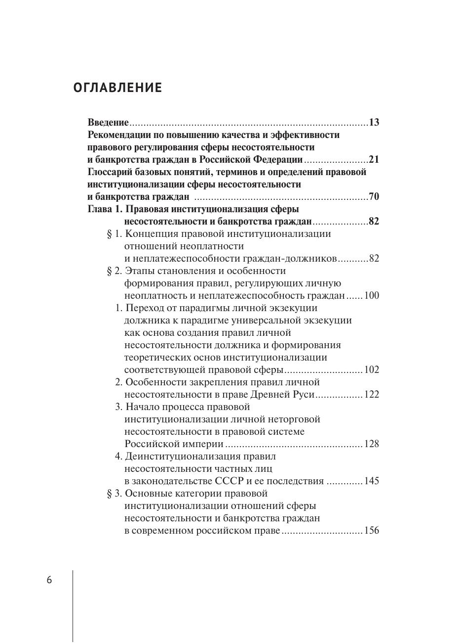 неоплатностью и (или) угрозой неплатежеспособности граждан-должников. В работе рассматриваются элементы общности правовых норм, юридических конструкций, правовых механизмов и принципов их реализации, предназначенных для регулирования общественных отношений, вызванных неспособностью надлежащего исполнения своих денежных обязательств со стороны граждан, испытывающих финансовые трудности. Автором предложена институциональная теория правового регулирования системы отношений сферы несостоятельности и банкротства граждан, дано описание видов реабилитации граждан-должников по результатам рассмотрения дела о банкротстве и правил формирования их конкурсной массы. Работа представляет интерес в качестве основы для дальнейших теоретических исследований и законодательного регулирования правоотношений в сфере несостоятельности и банкротства граждан. Выводы и предложения, сформулированные в настоящей работе, могут быть использованы как практические рекомендации для законодателей, судей, арбитражных управляющих и юристов при рассмотрении дел о банкротстве граждан. Монография также может быть полезна студентам и аспирантам, преподавателям вузов юридической направленности.